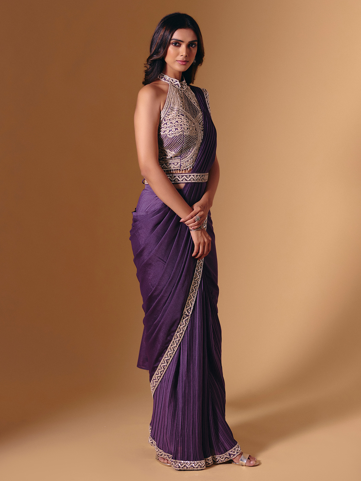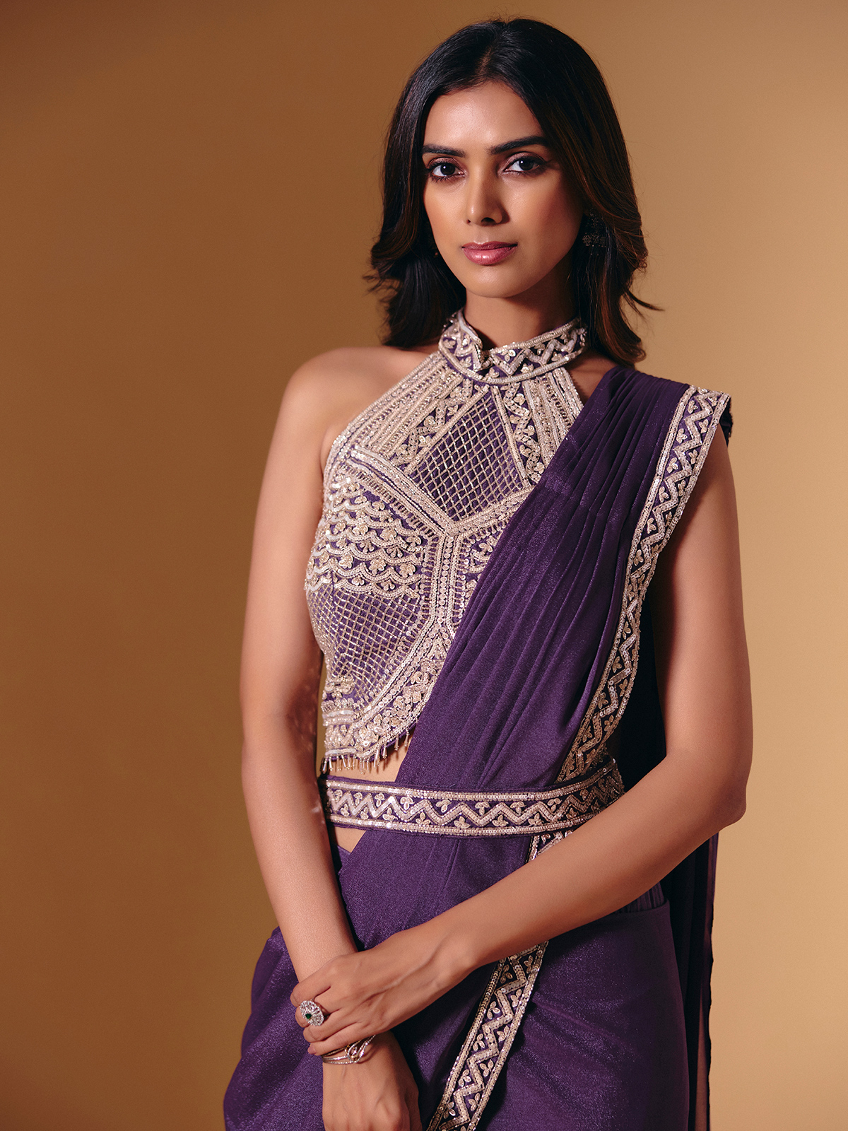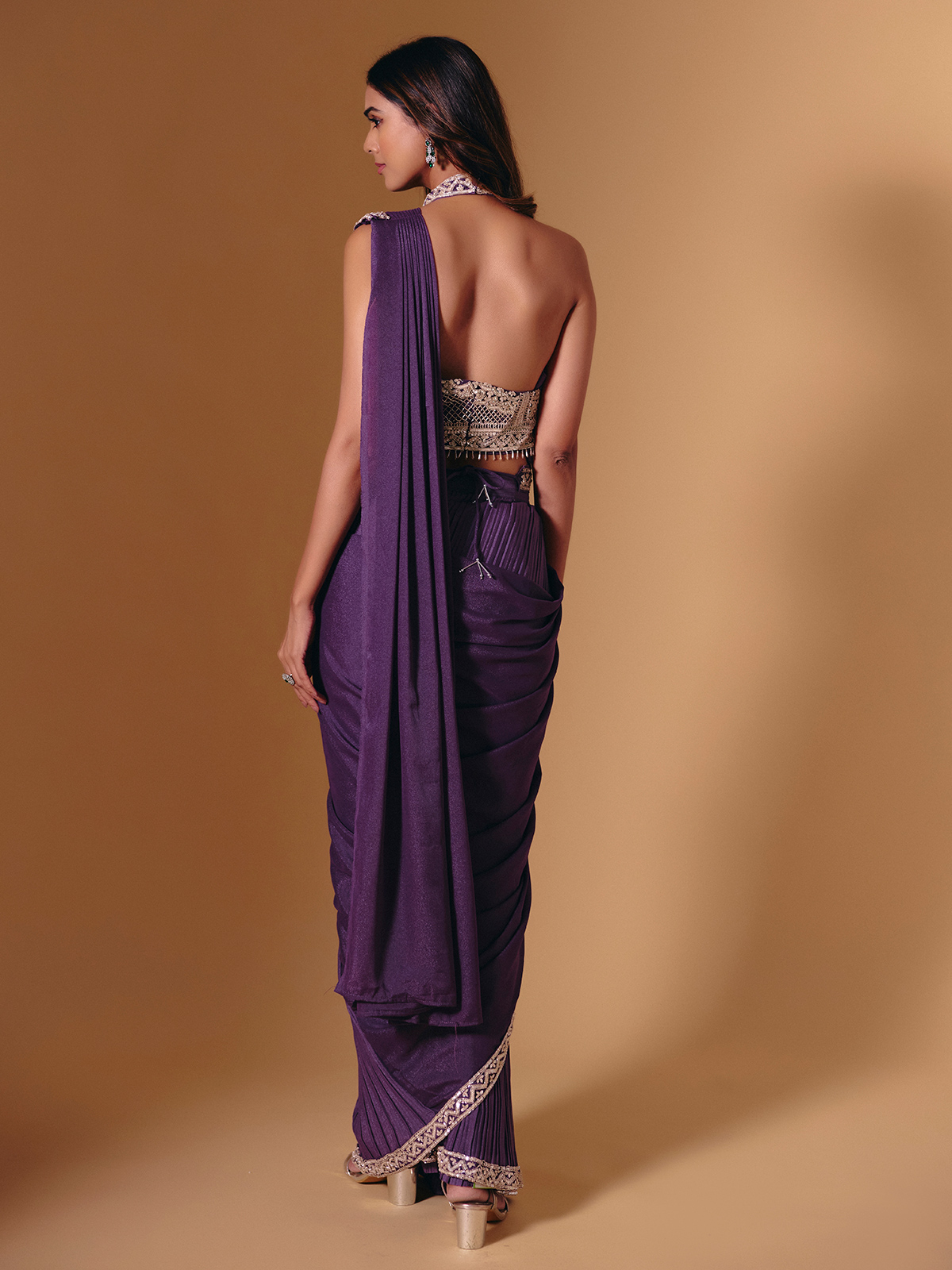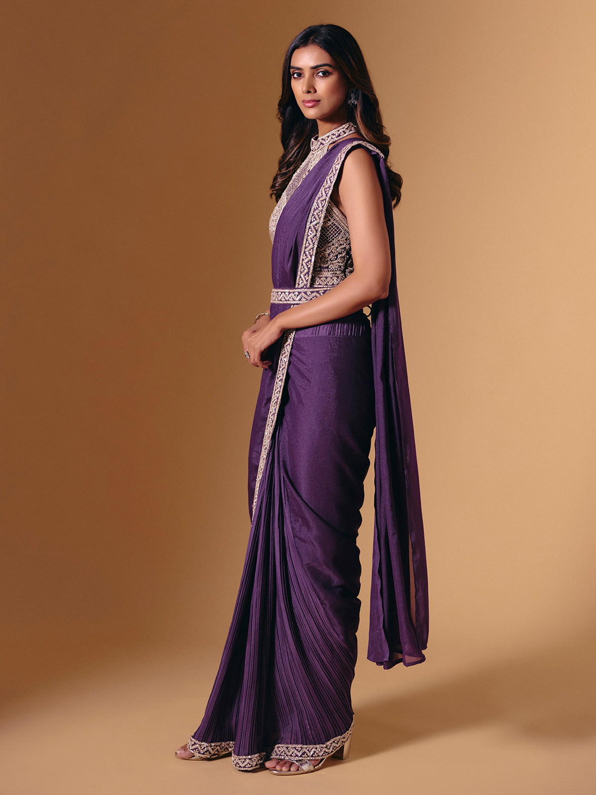Wrapped in smooth Cruss lycra, this purple ready-to-wear saree glistens with cutdana, sequins, and bead accents. The designer waist belt adds a sculpted fit, bringing elegance and ease together. Ideal for weddings, receptions, and evening celebrations where glamour meets effortless draping.