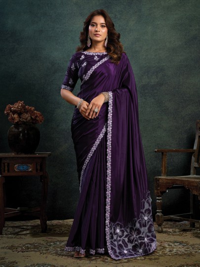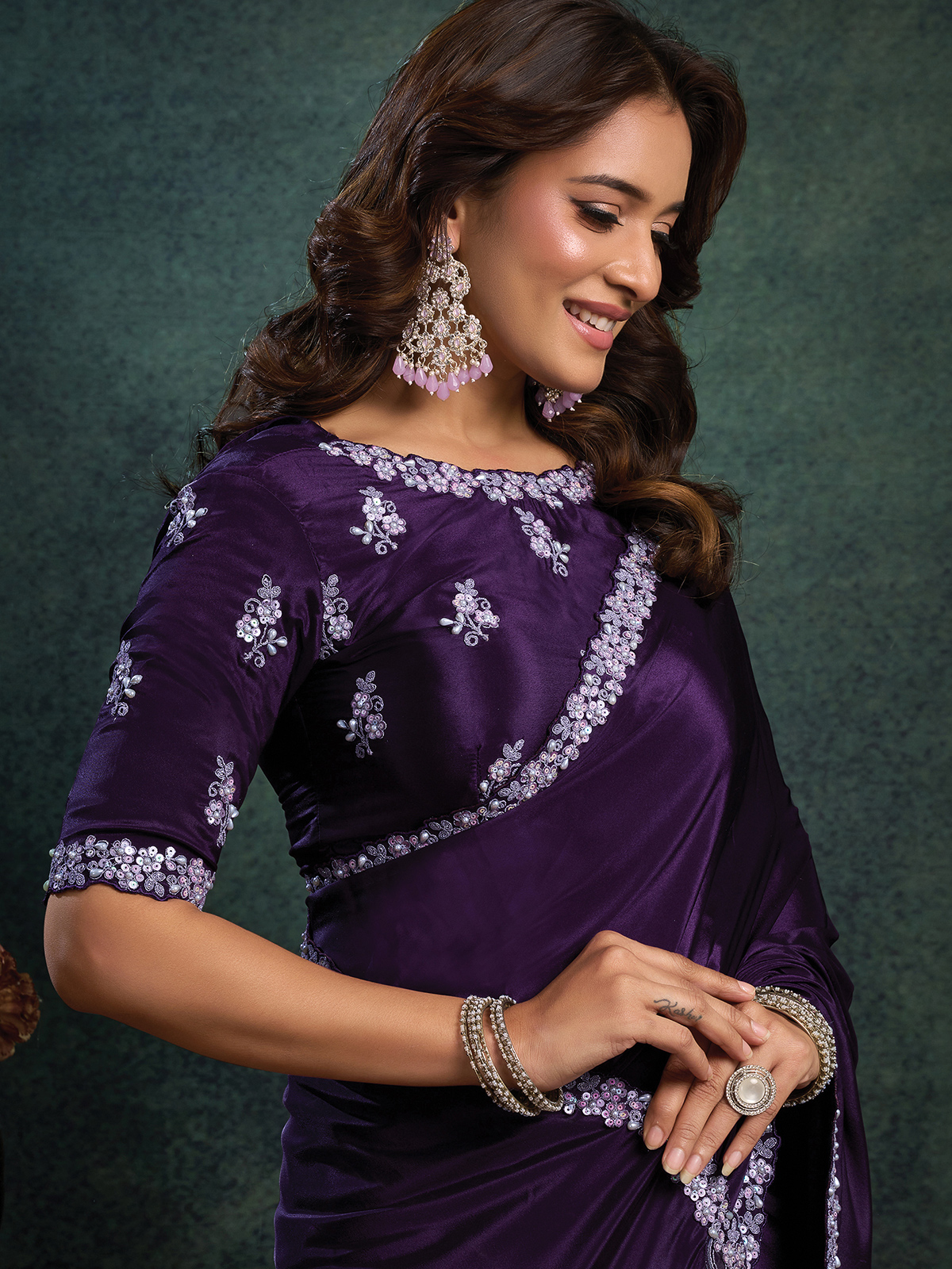 Crafted in rich purple satin silk, this designer saree features embroidery, stone, sequins and applique detailing for luxurious festive appeal. Its glossy finish enhances elegance. Paired with an unstitched blouse piece, it is perfect for weddings, receptions, sangeet and glamorous party wear.