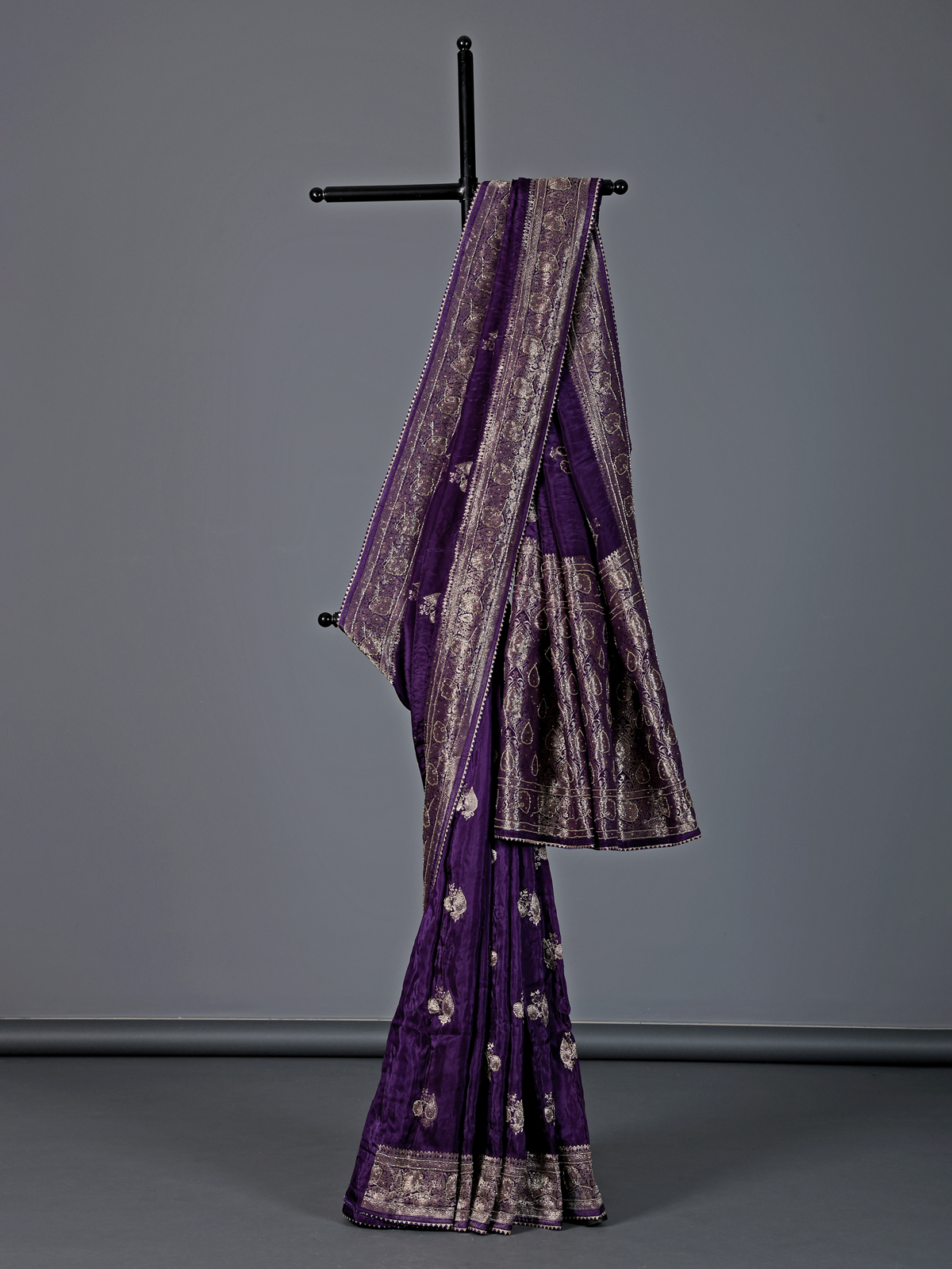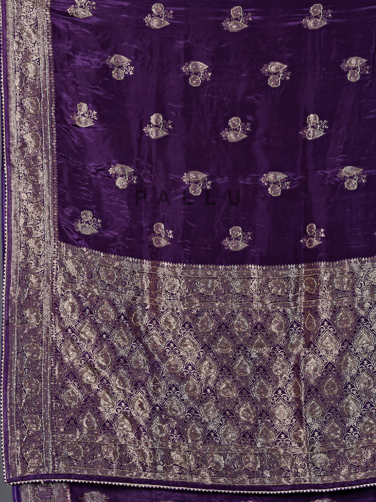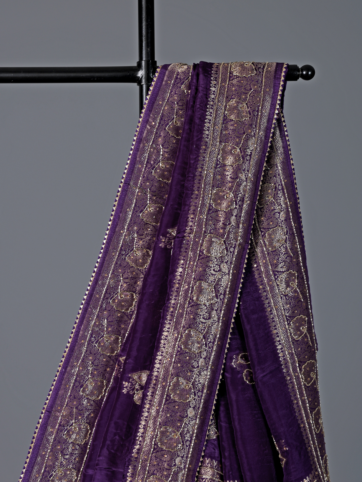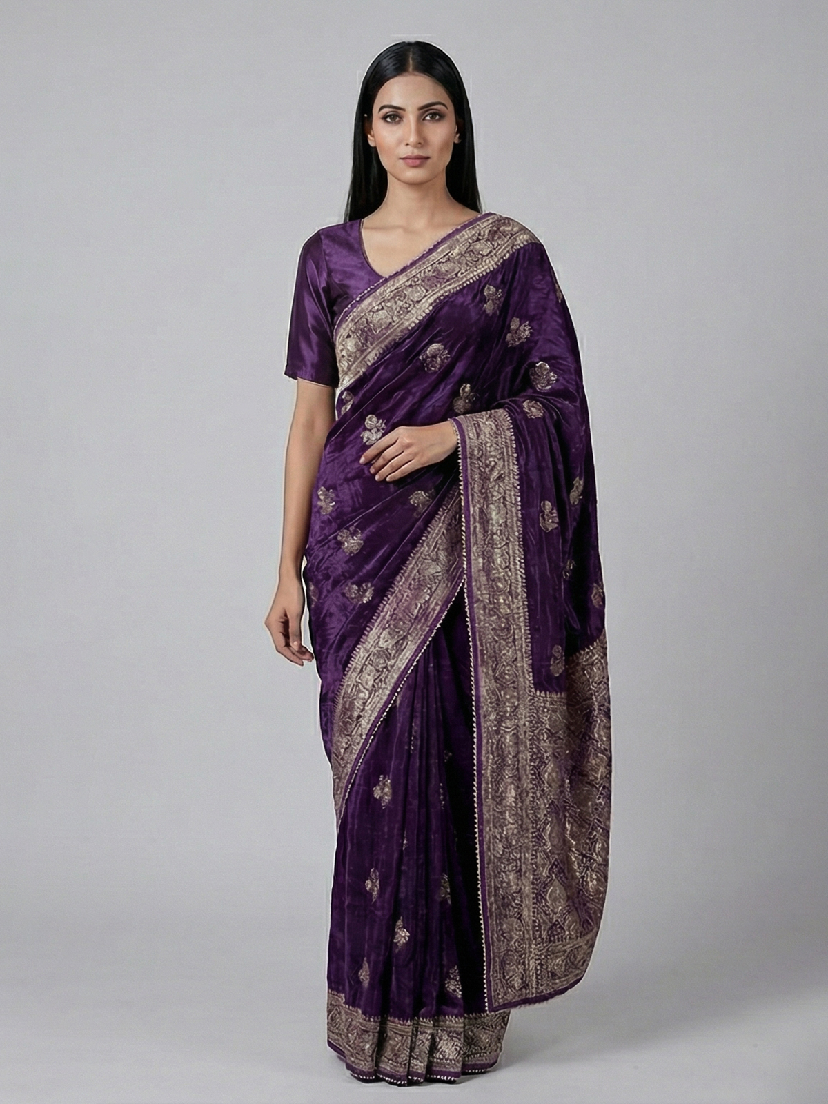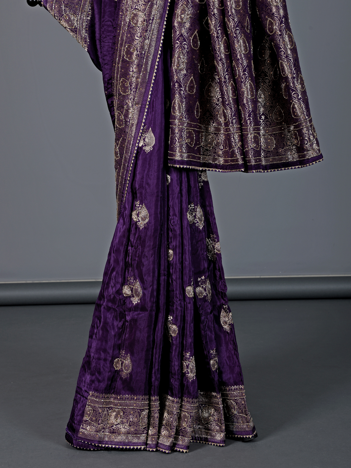 Enchanting and graceful, this purple dola silk saree showcases vibrant elegance. Intricately detailed with cutdana, stone, zari and gota work, it sparkles beautifully across the fabric. The smooth drape enhances your presence with poise. Perfect for weddings and festive occasions, it includes an unstitched blouse piece for a personalized ensemble.