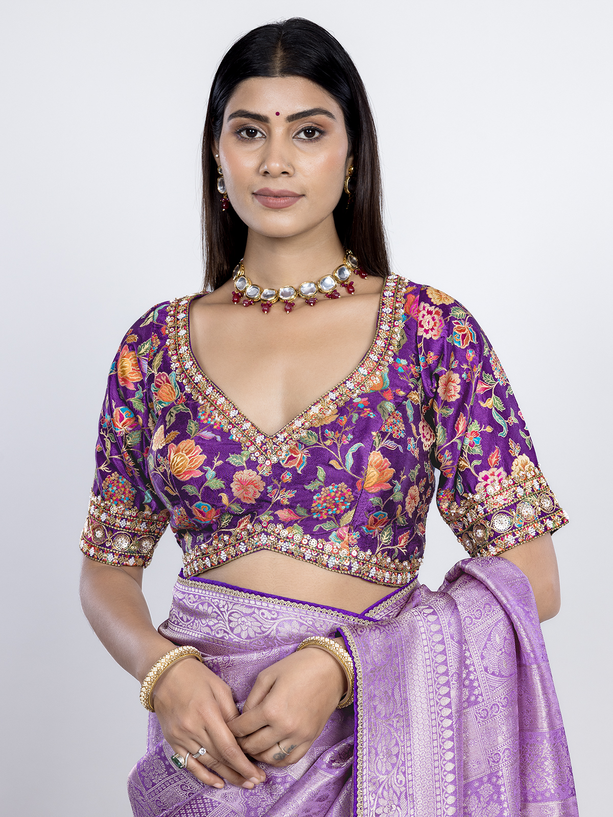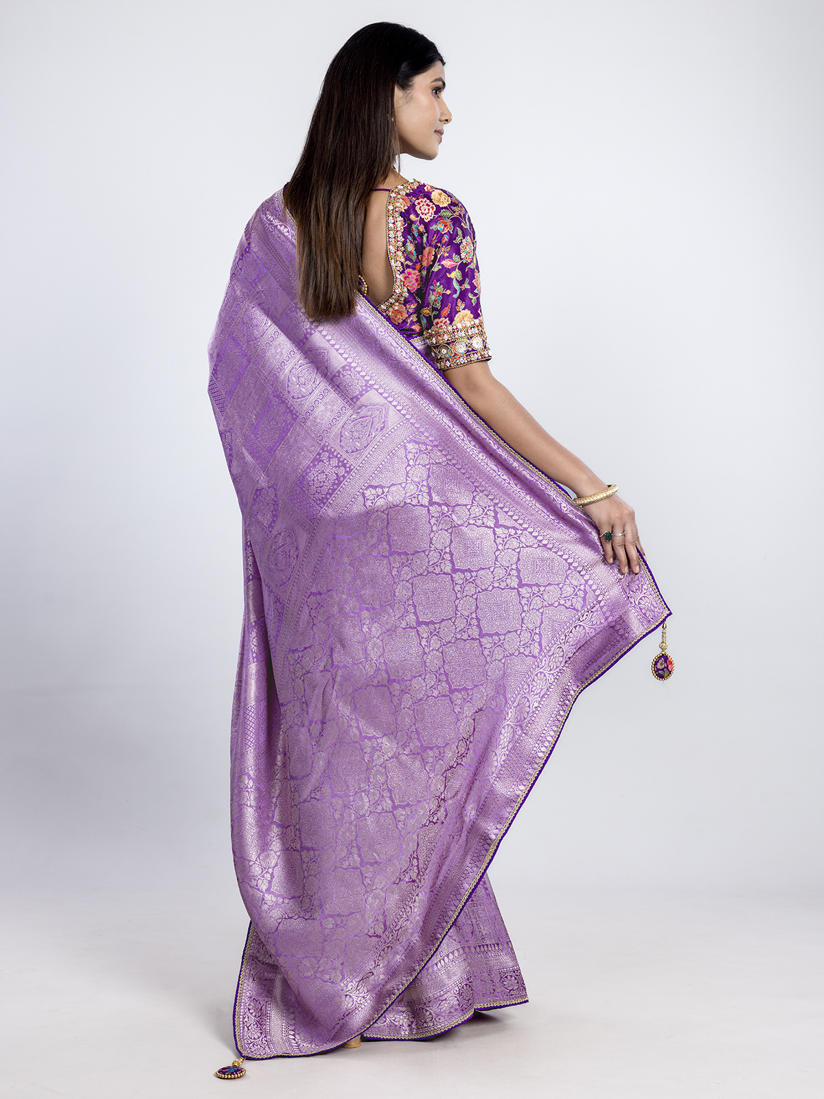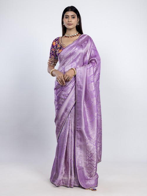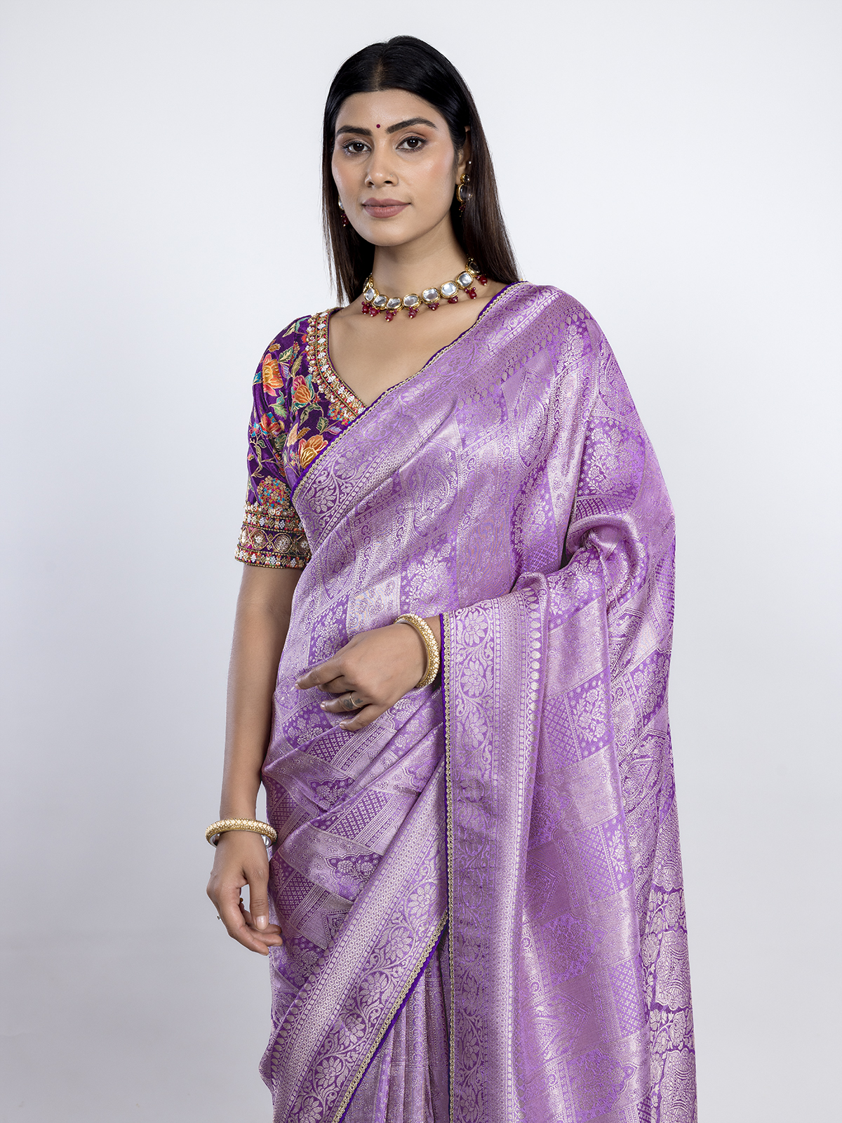 A regal dream woven in silk, this royal purple dola silk saree glows with zari, flowing with grandeur. The readymade blouse detailed in beads, sequins, and cutdana enhances its elegance. Ideal for weddings and festivities, it embodies timeless heritage expressed through luminous artistry and royal grace.