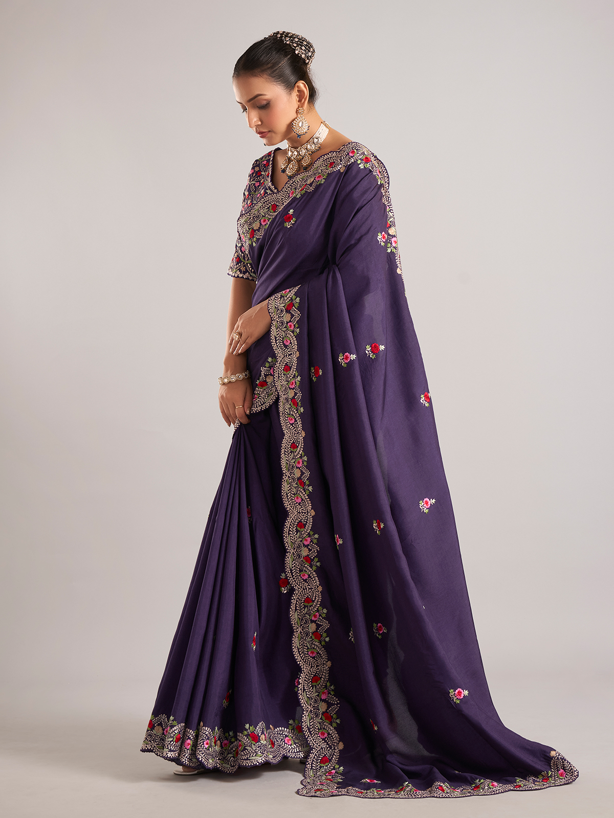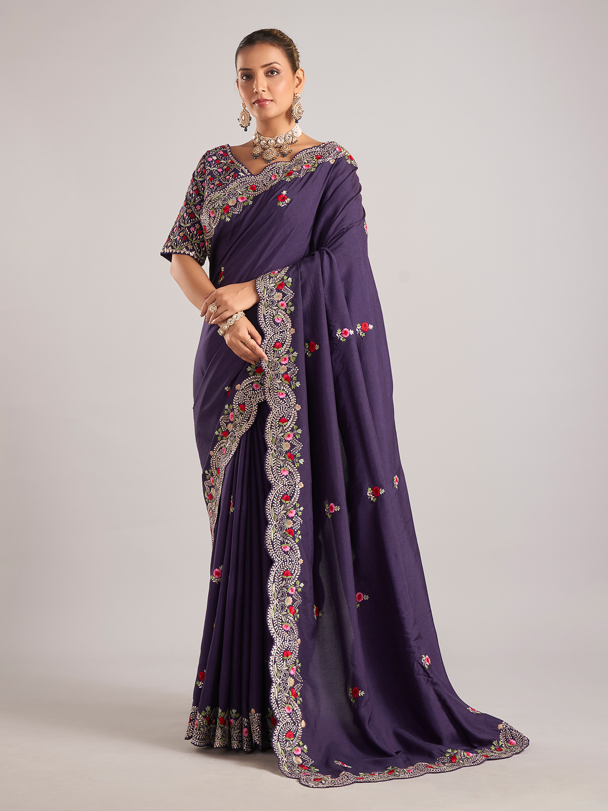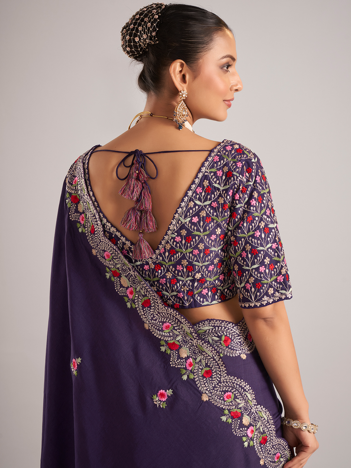 This purple pure dola silk saree is delicately embellished with resham and embroidery work. A perfect pick for weddings, it includes a ready-made blouse to complete your look.