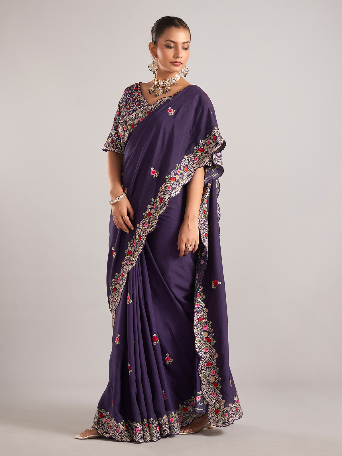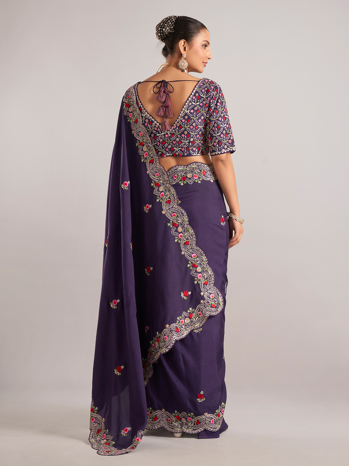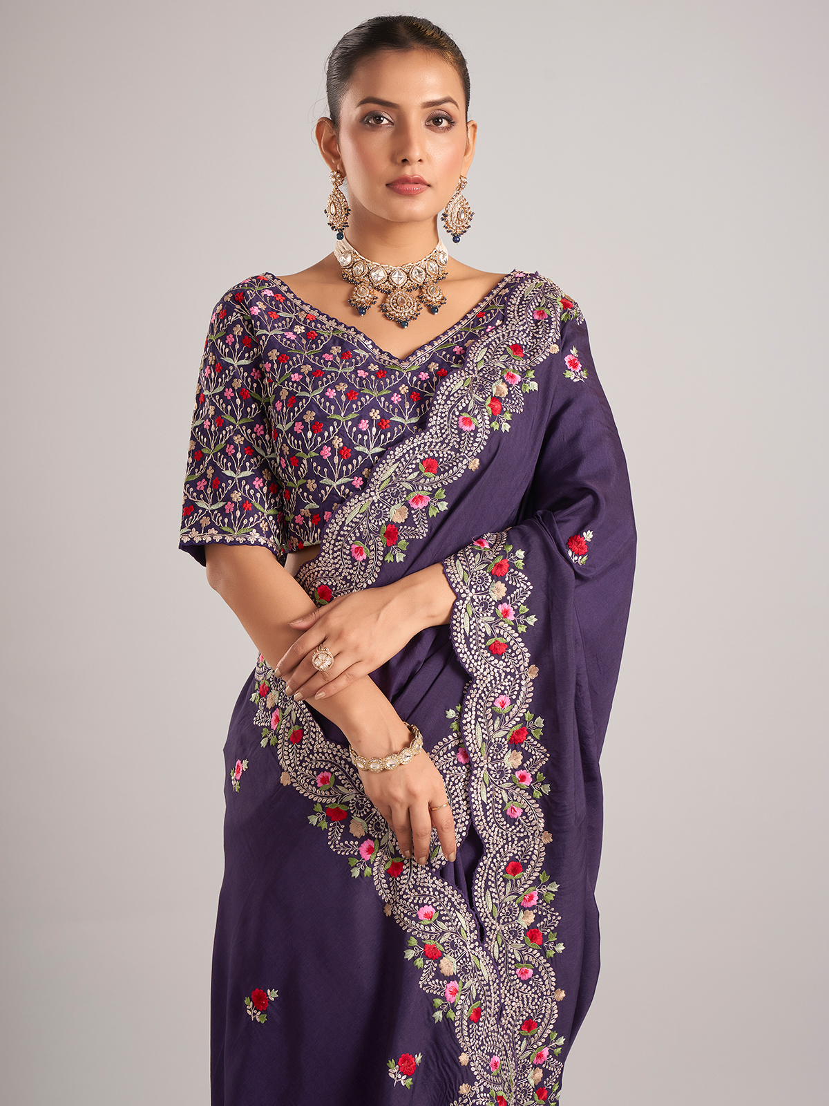 This purple pure dola silk saree is delicately embellished with resham and embroidery work. A perfect pick for weddings, it includes a ready-made blouse to complete your look.