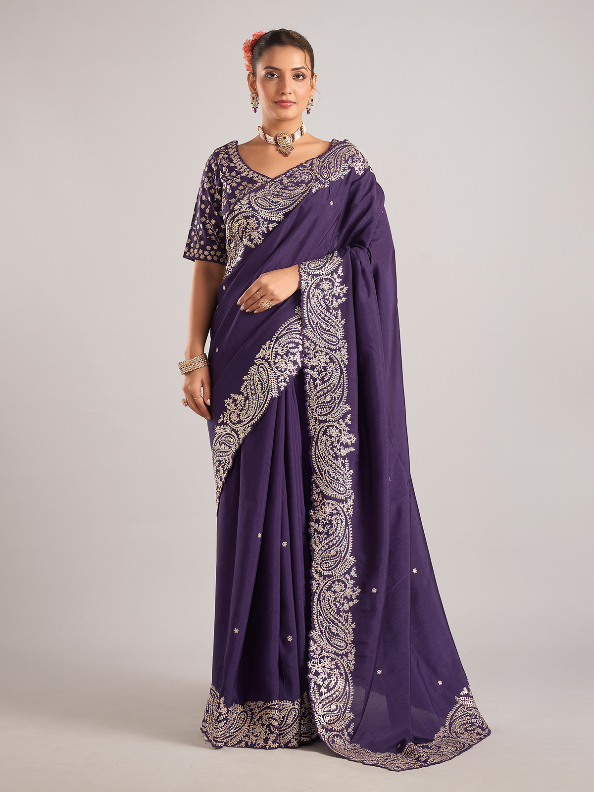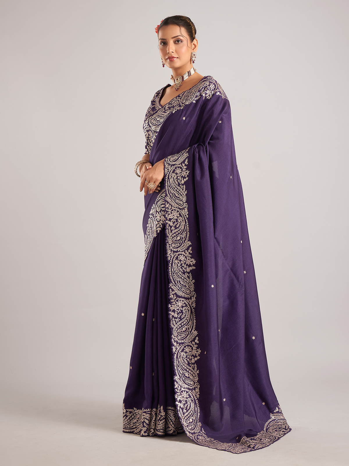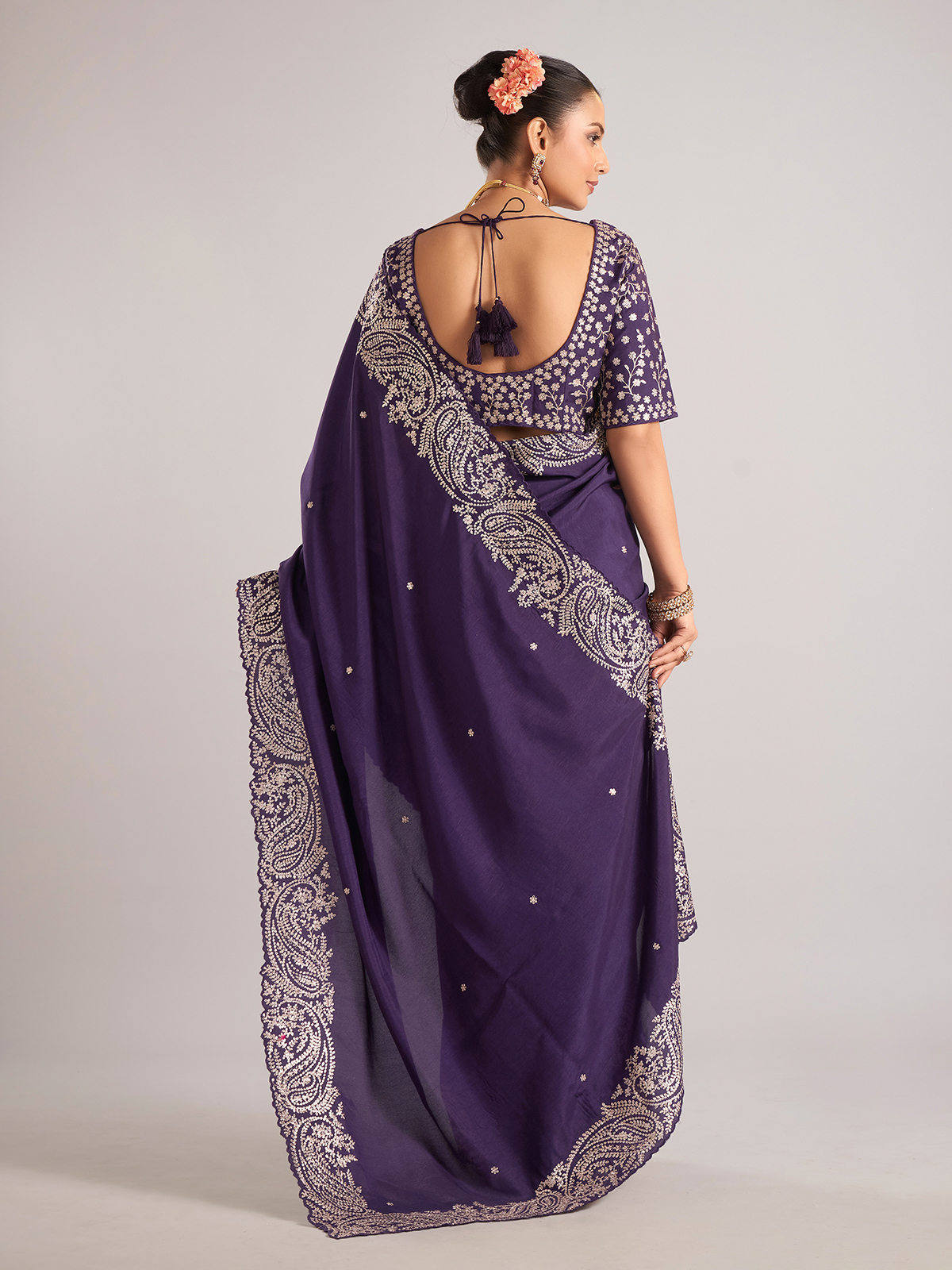 Add sparkle to your ethnic wardrobe with this purple pure dola silk saree, highlighted with delicate mirror work. Designed for weddings and special occasions, it comes with a matching ready-made blouse.