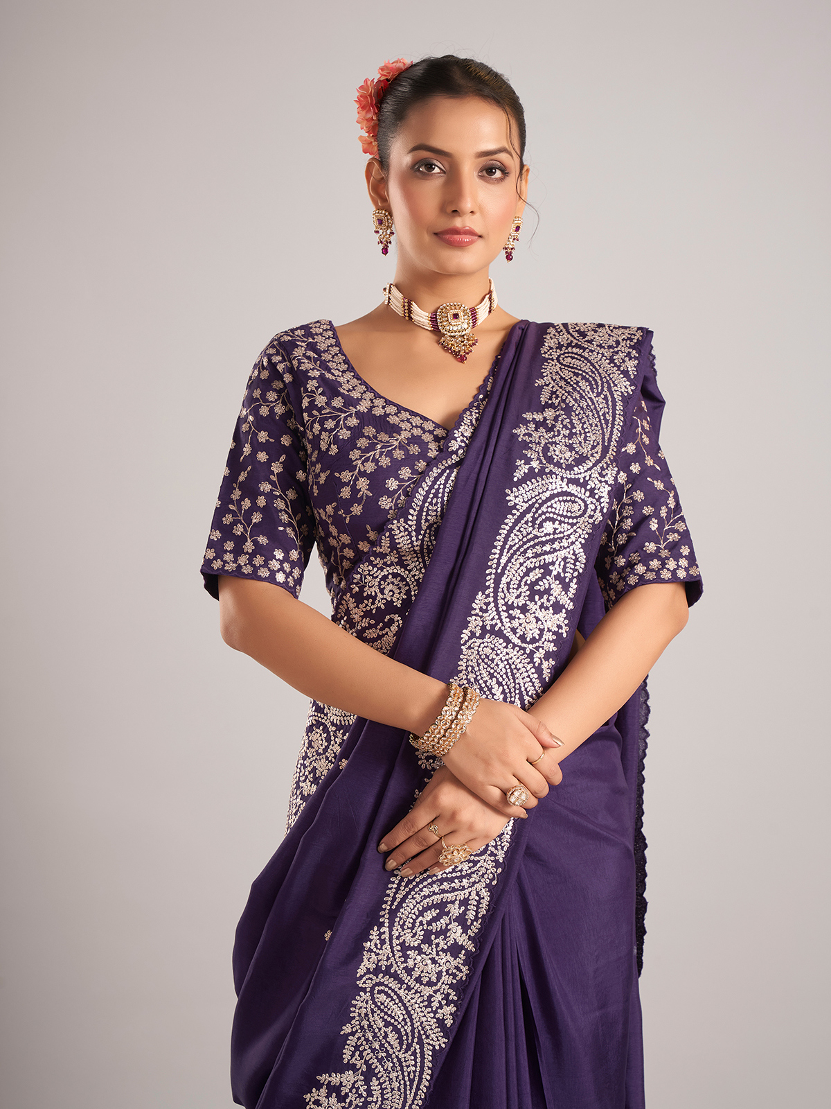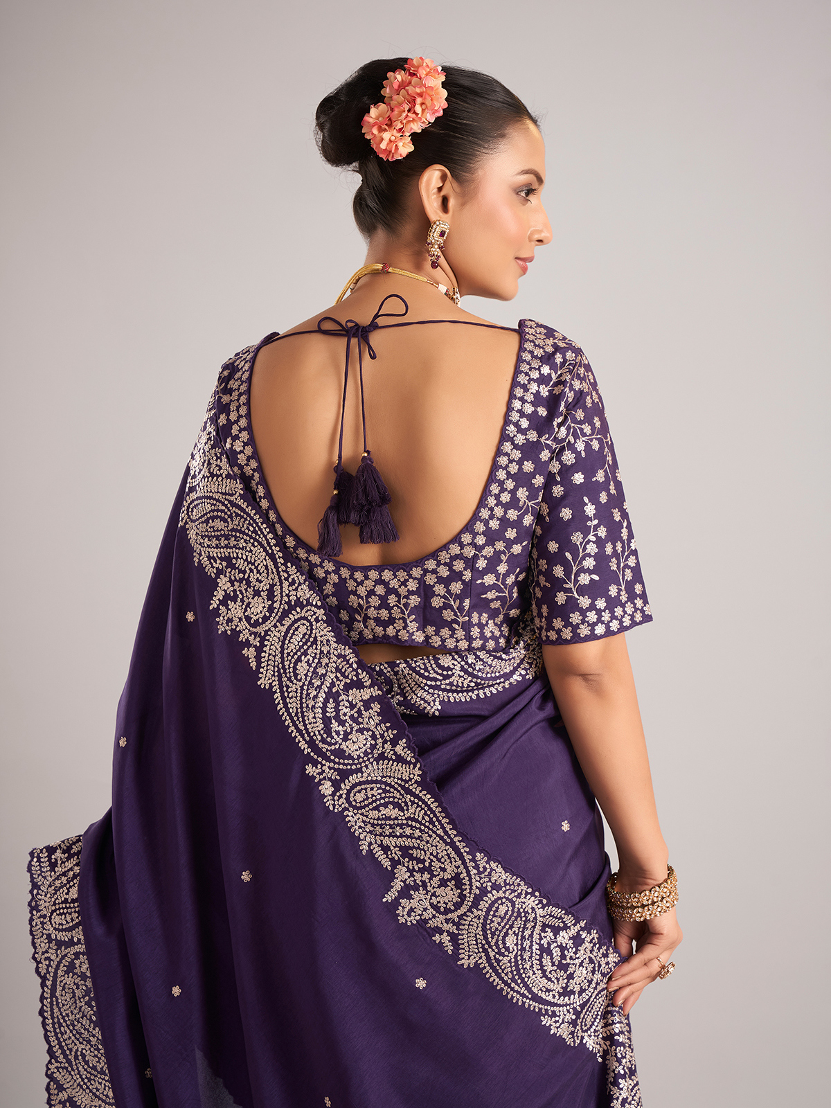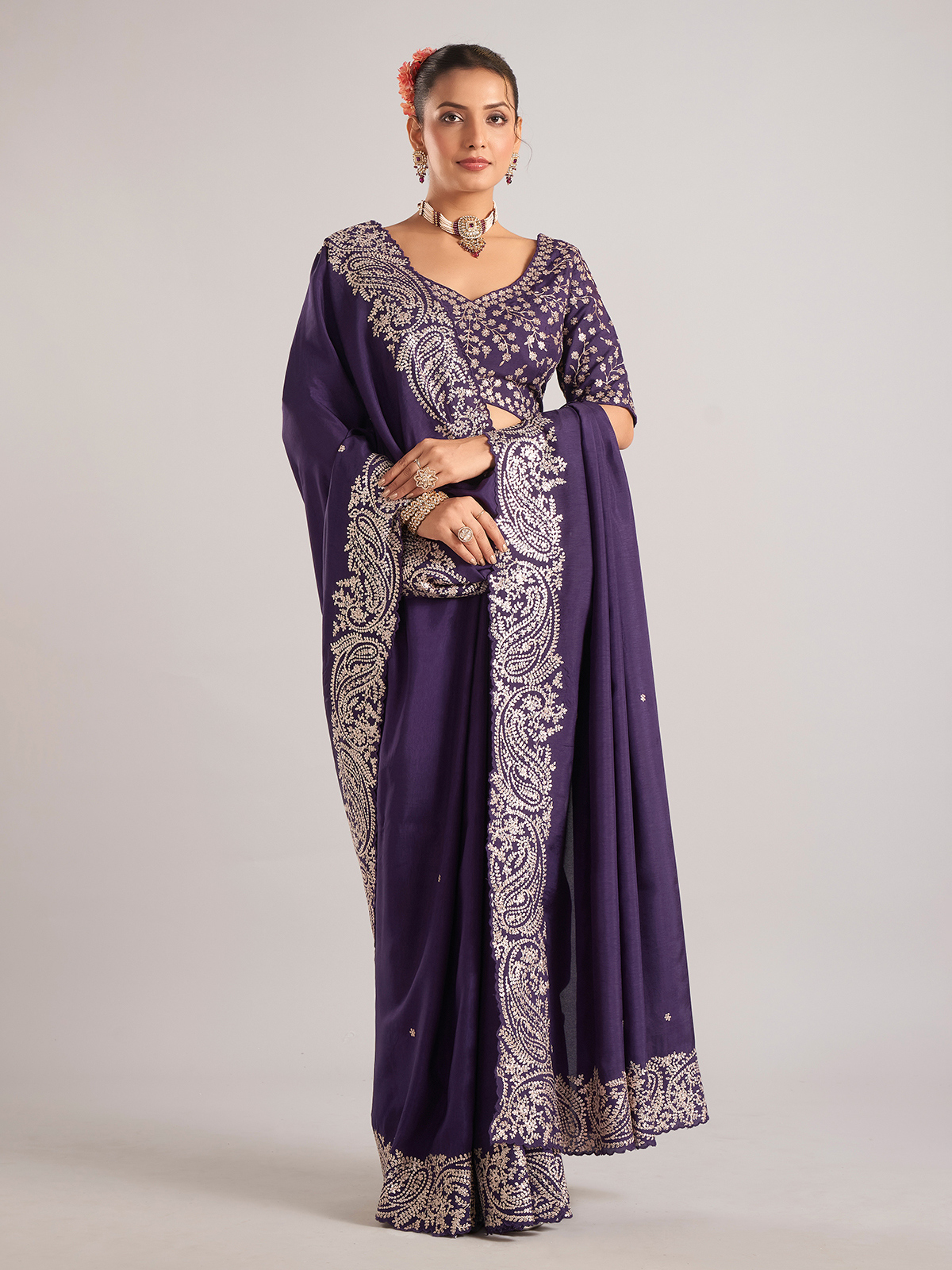 Add sparkle to your ethnic wardrobe with this purple pure dola silk saree, highlighted with delicate mirror work. Designed for weddings and special occasions, it comes with a matching ready-made blouse.