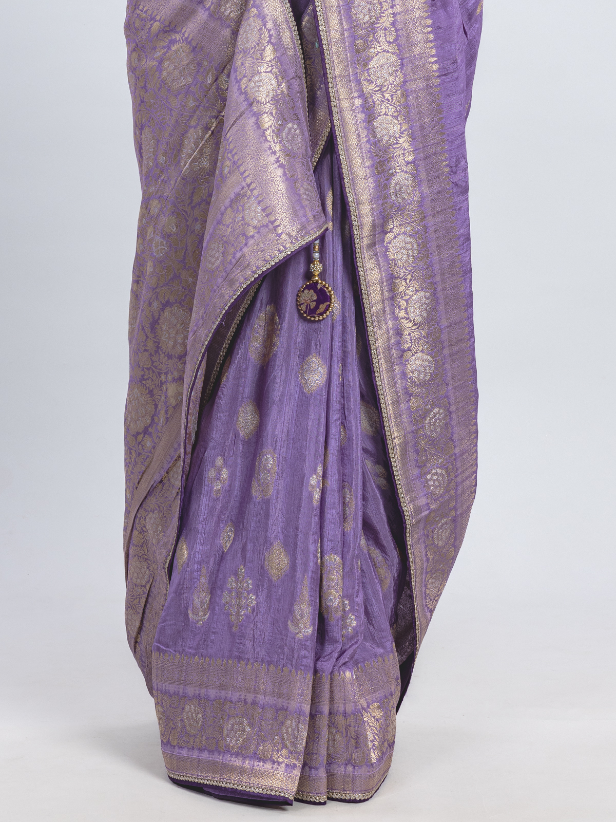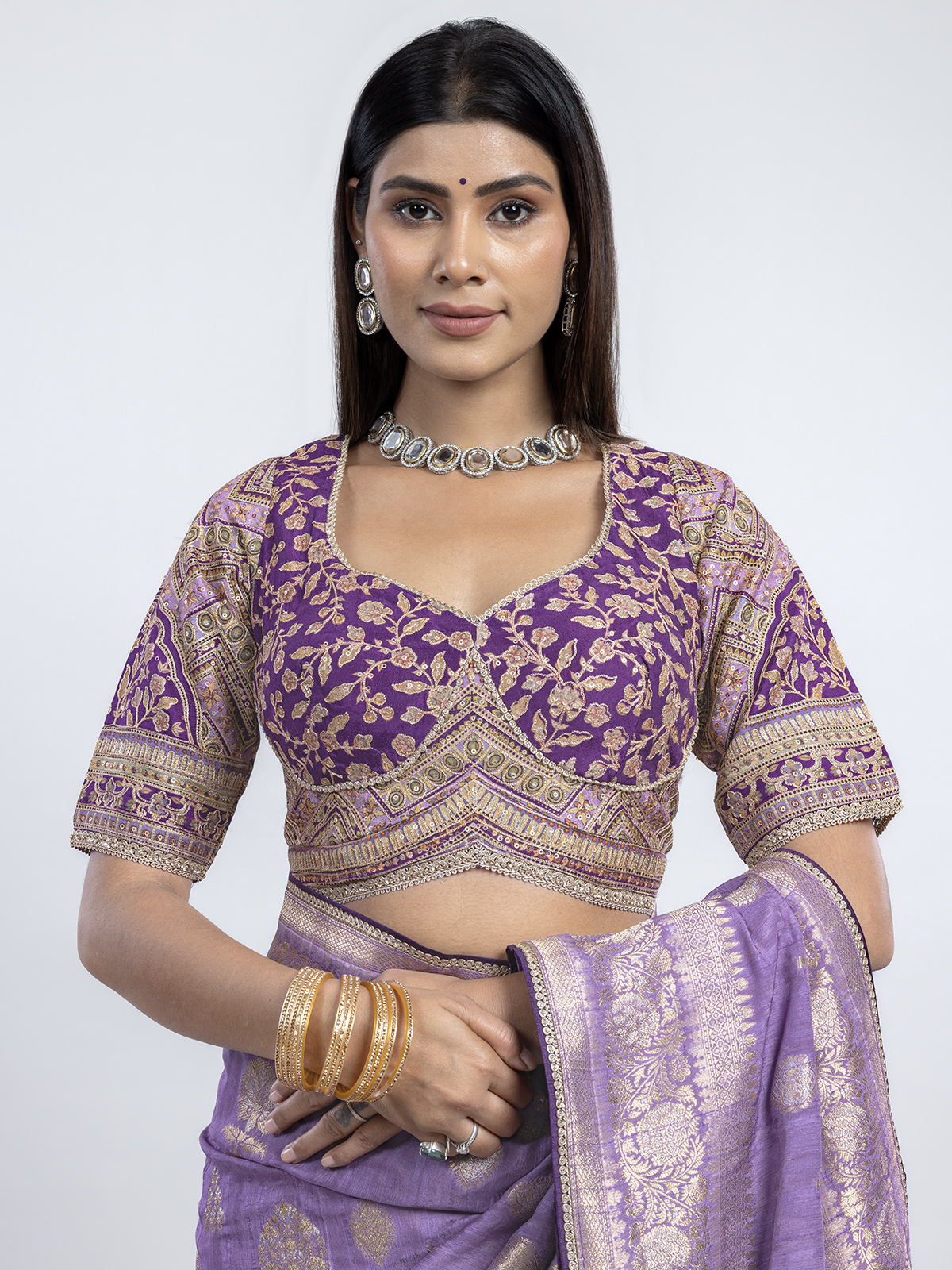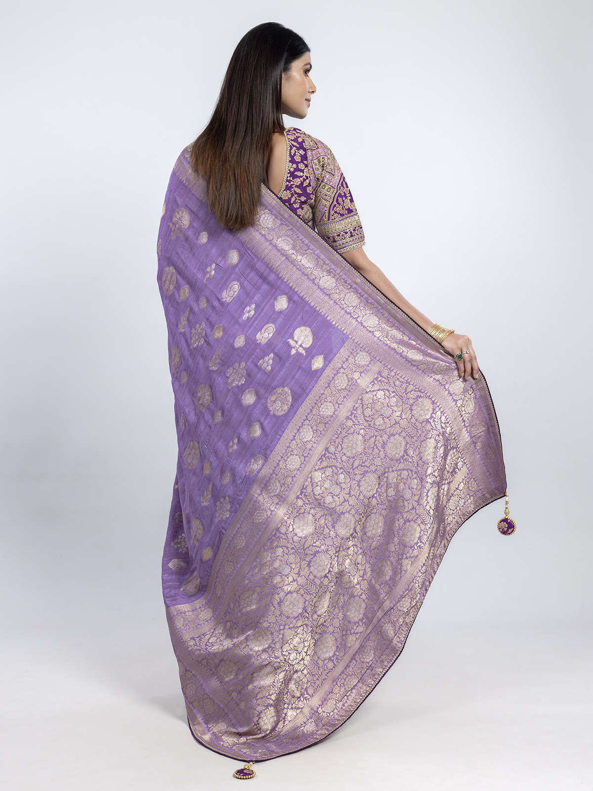 This regal purple dola silk saree enriched with zari, resham, and sequins glistens with royal opulence. Its soft sheen captures the essence of traditional splendor, ideal for weddings and festivities. Styled with a coordinating readymade blouse, it exudes timeless grace steeped in majestic charm and luminous artistry.