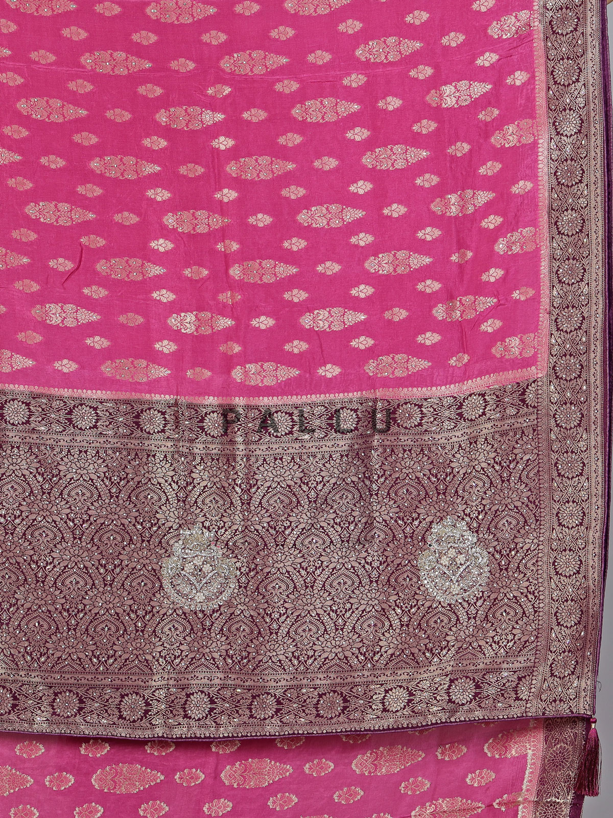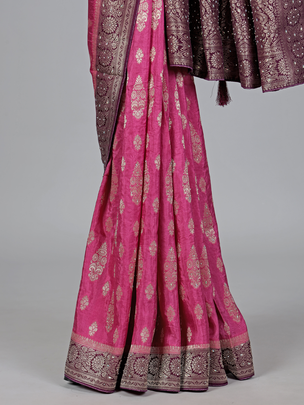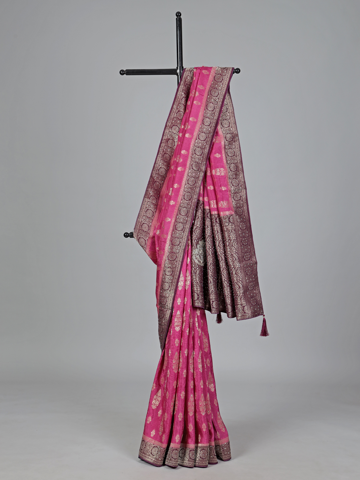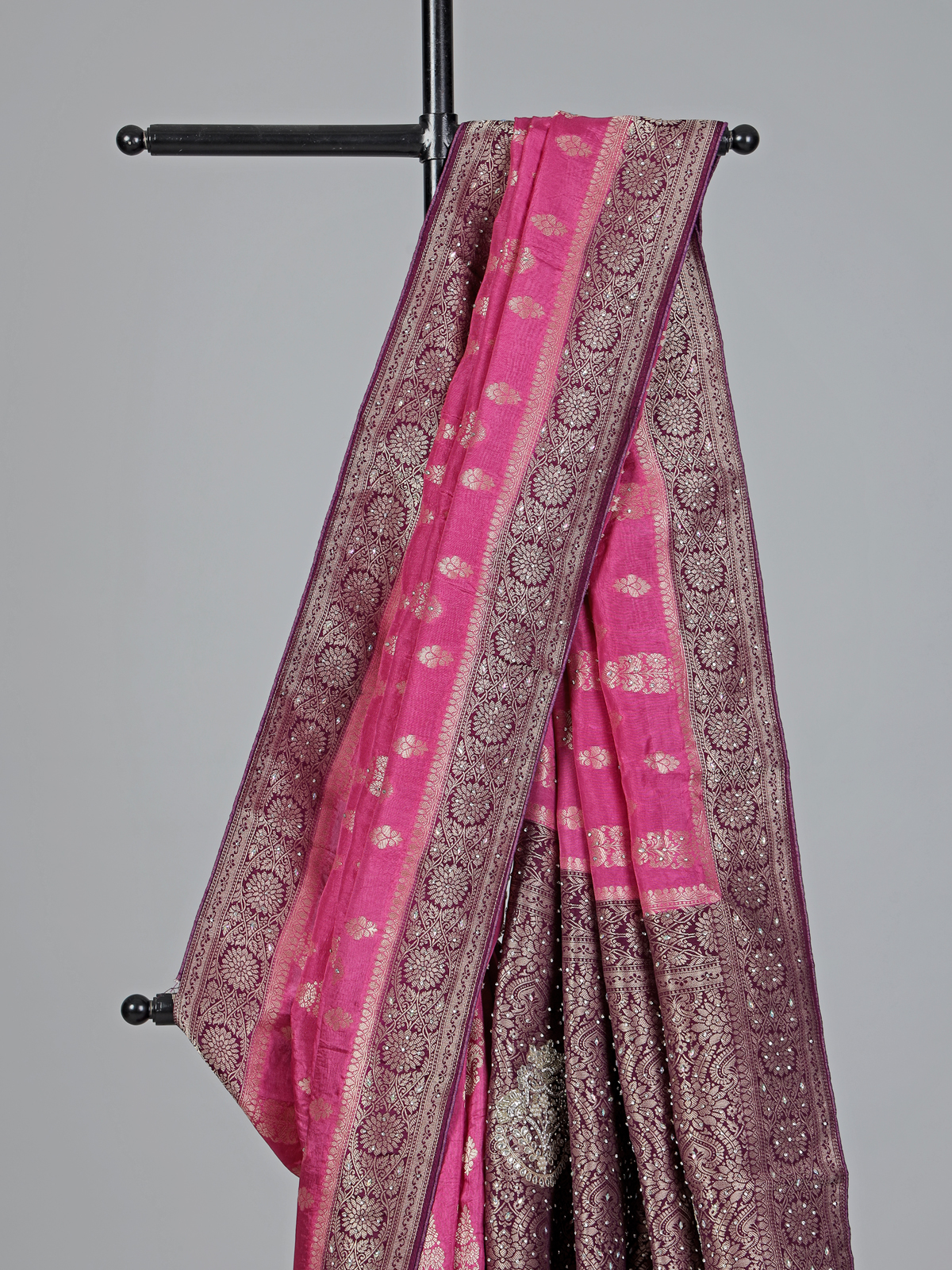 Step into regal sophistication with this purple dola silk saree, intricately adorned with stone and zari detailing. The rich wine contrast border and pallu elevate its festive appeal, creating a graceful silhouette. Perfect for weddings and celebrations, it comes with an unstitched blouse piece for a tailored finish.