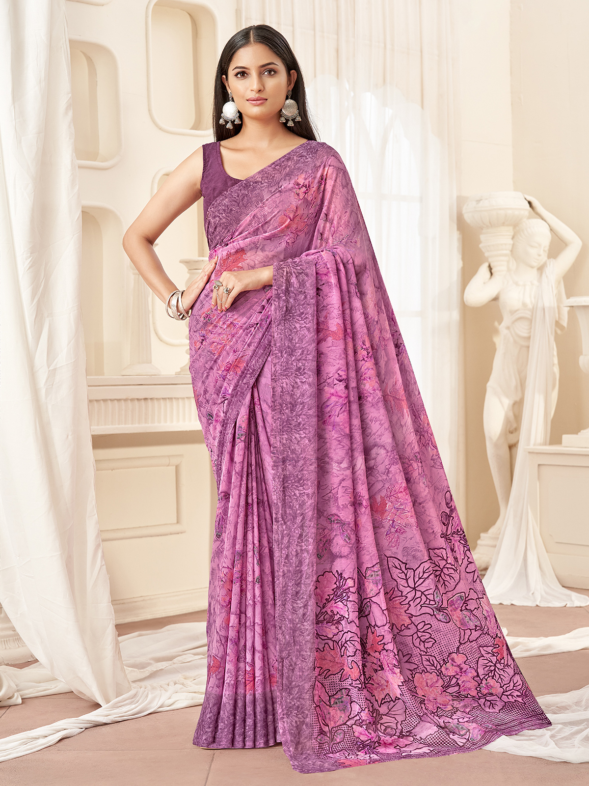 This purple georgette saree showcases delicate floral motifs enhanced with gentle shading for a graceful finish. Airy and easy to carry, it drapes beautifully. Paired with an unstitched blouse, it is perfect for casual wear, puja rituals, and festive occasions.