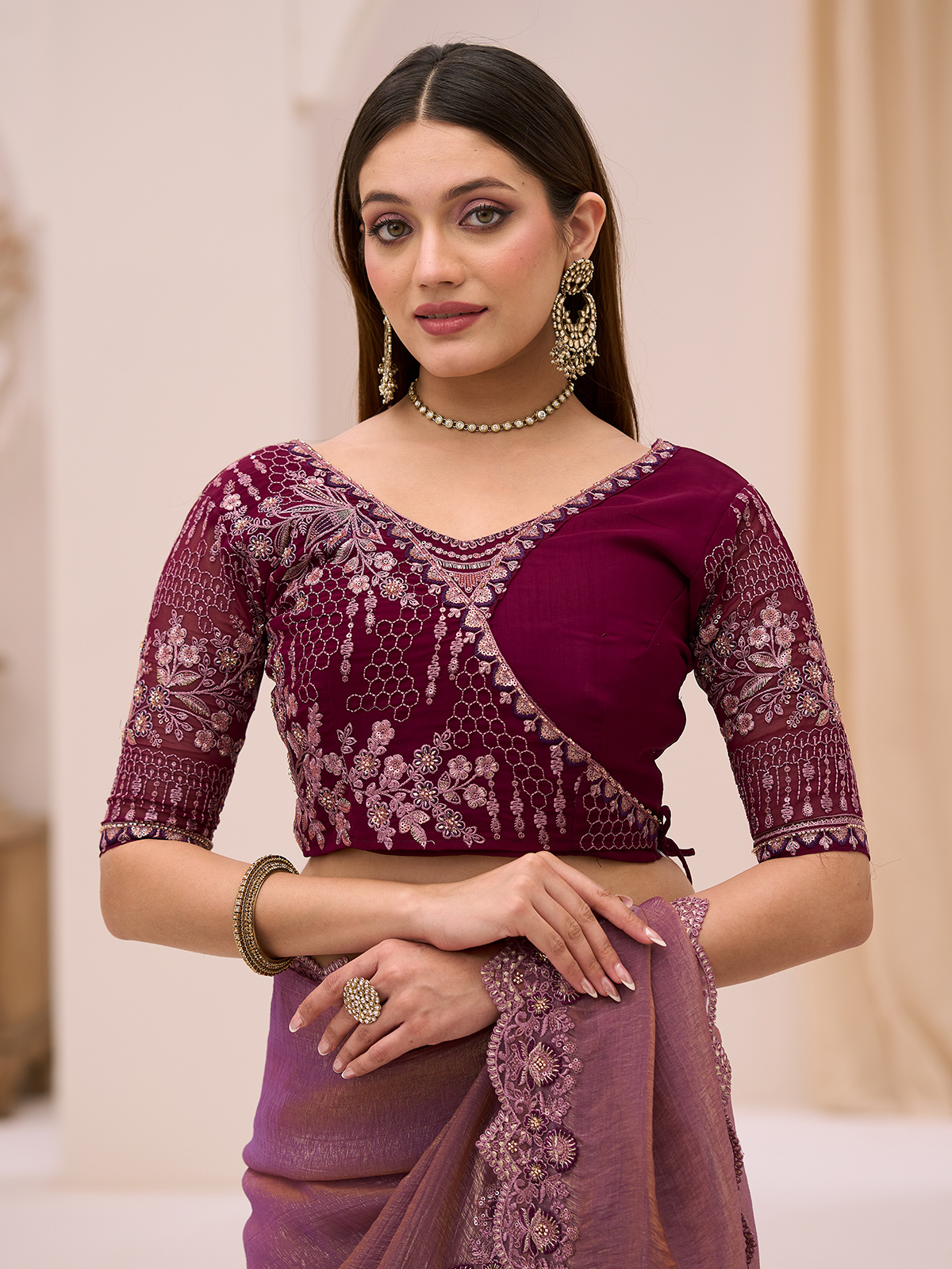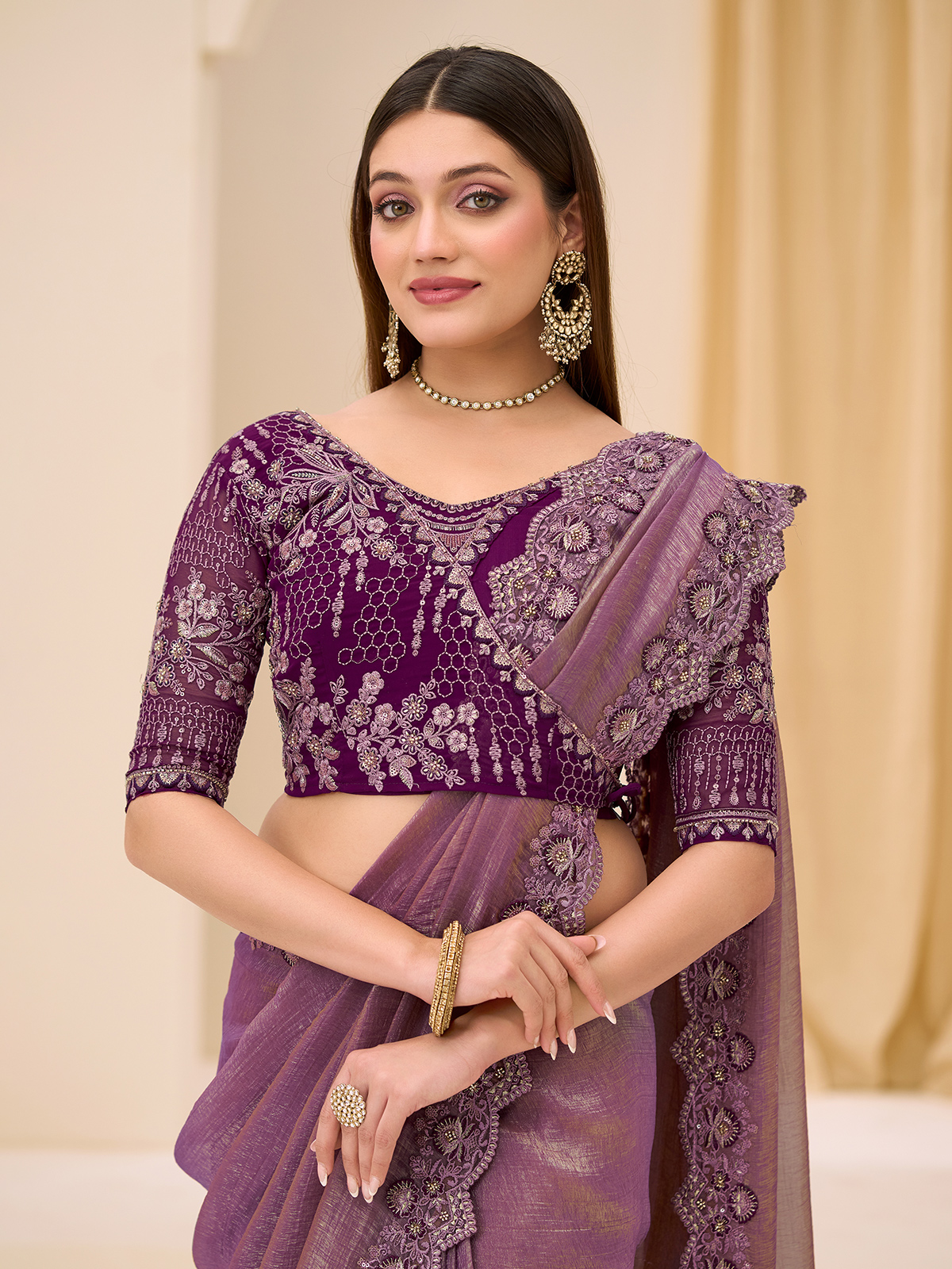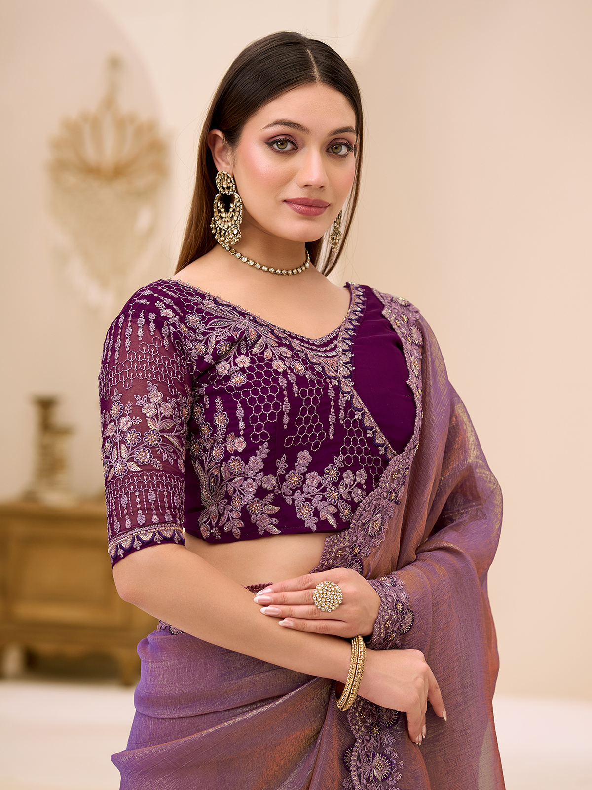 Captivating elegance flows through this purple georgette tissue saree designed for modern festive charm with a graceful and fluid drape. Adorned with resham, cutdana and sequins work on the border, it offers rich texture and sparkling detail. Ideal for festive occasions and party wear, paired with an unstitched blouse for customization.