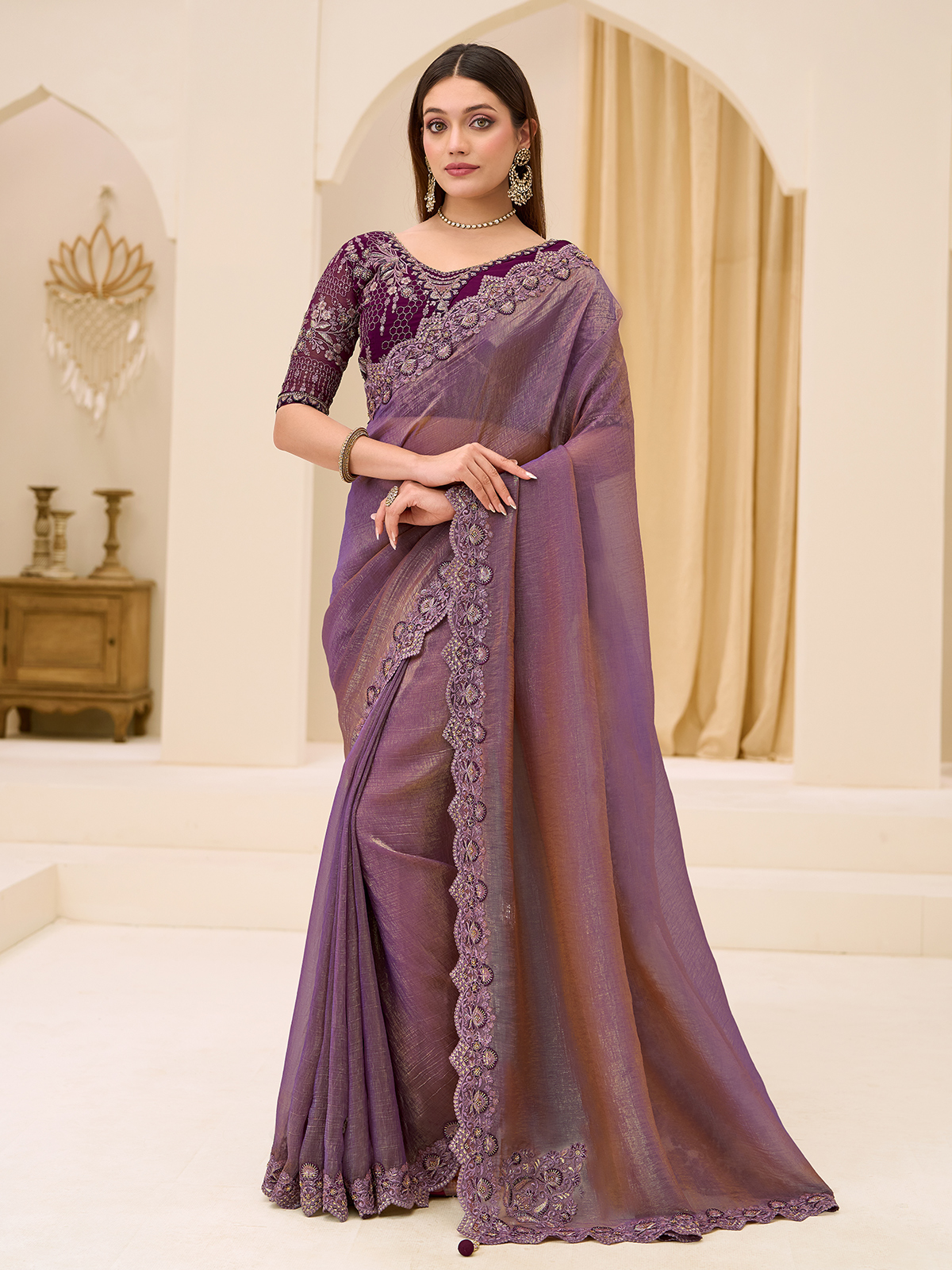 Purple Georgette Tissue Saree With Embellished Border
