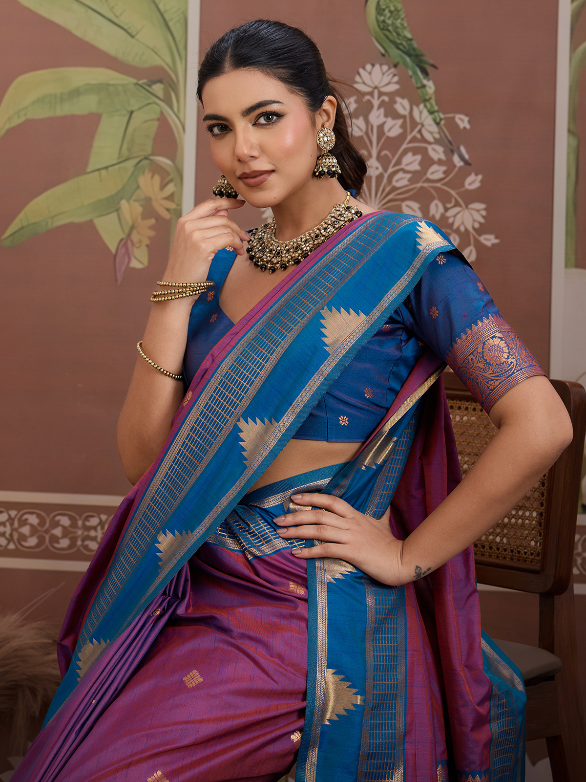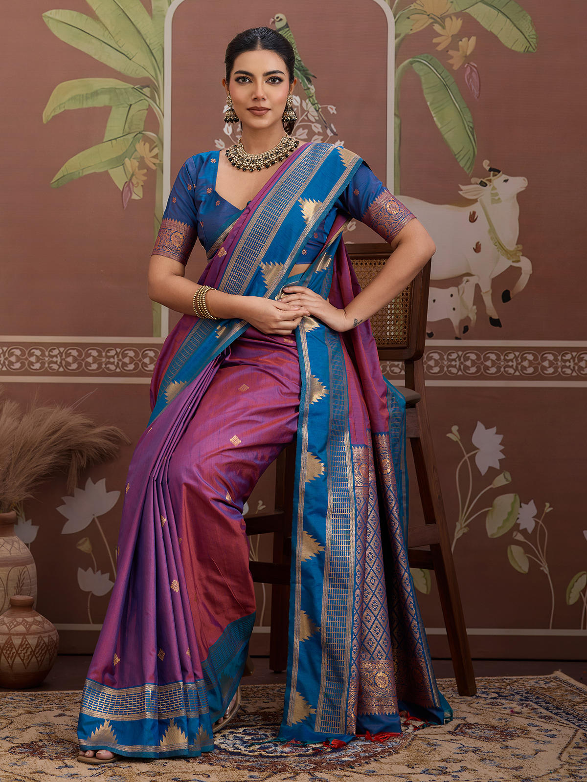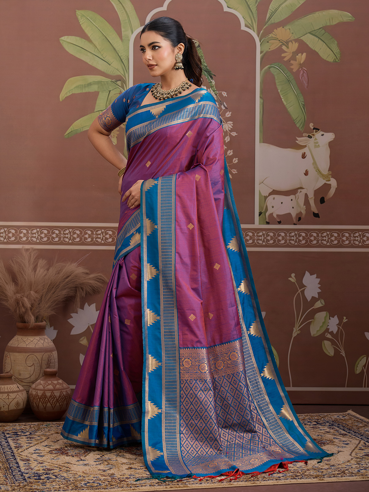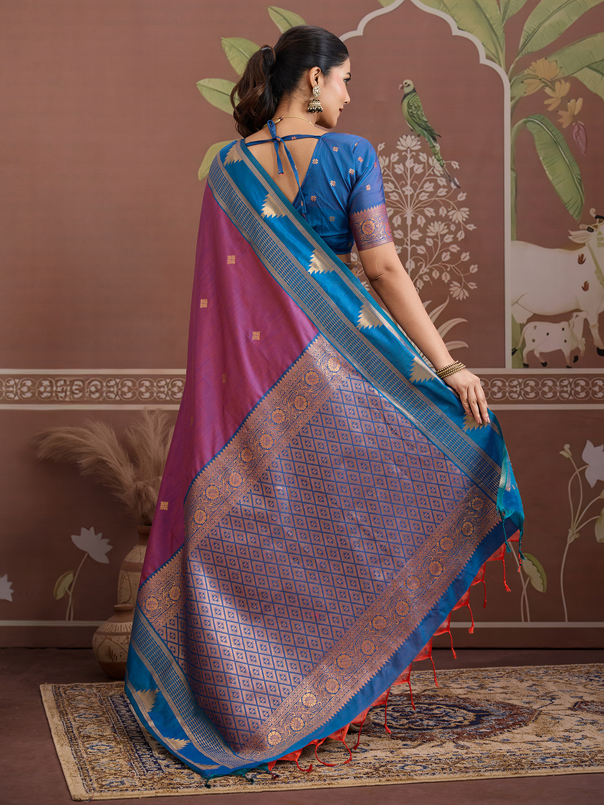 Designed in an elegant purple shade, this tussar silk saree features refined handloom zari weaving that reflects artisanal beauty. Finished with an unstitched blouse piece, it offers a sophisticated ethnic look perfect for festive occasions and cultural gatherings.
