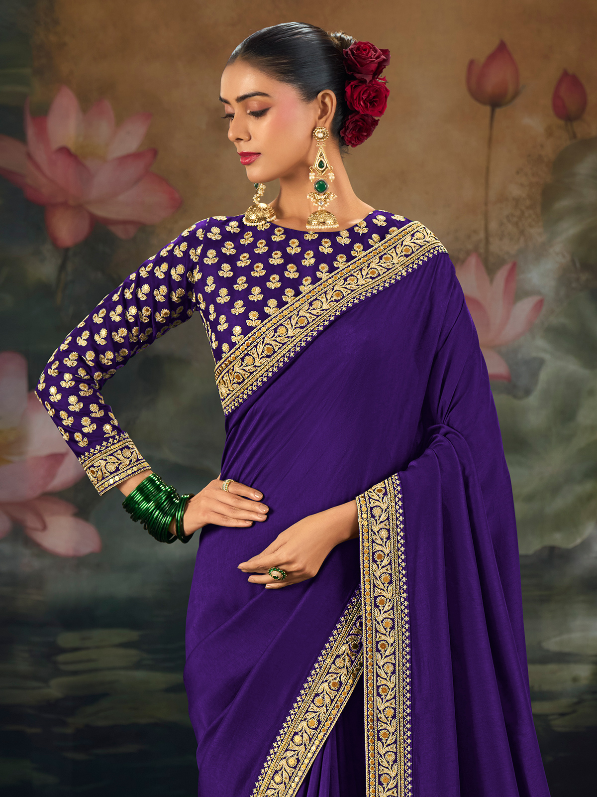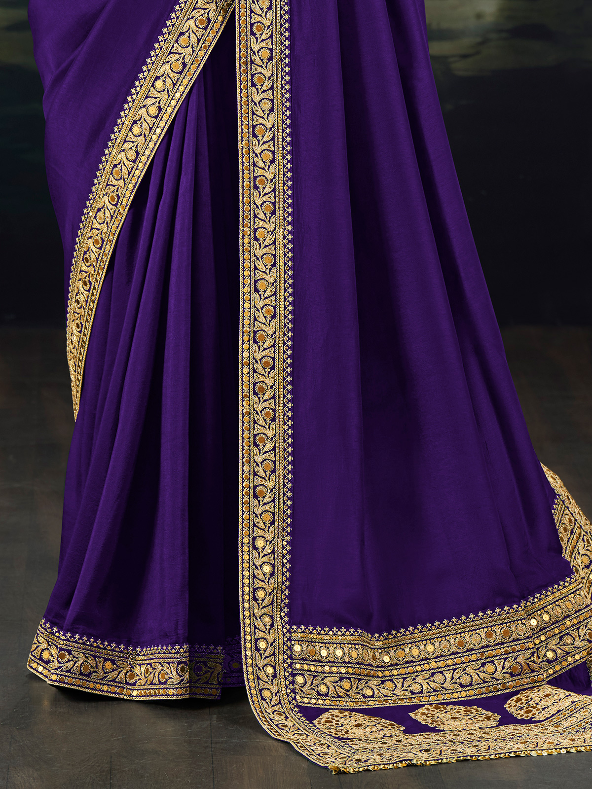 Classic and alluring, this purple saree highlights refined ethnic artistry. Made from high-sheen pure munga silk, it features a luxurious golden border with detailed resham and sequin floral work. The ensemble includes a richly embroidered unstitched blouse with gold buttis, ideal for festive and wedding occasions.