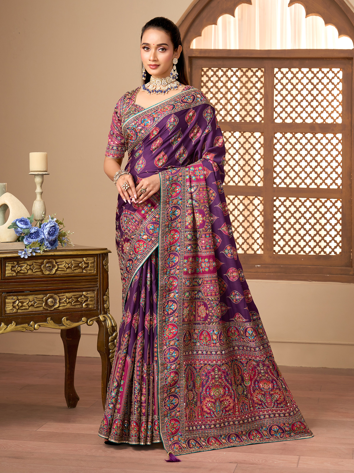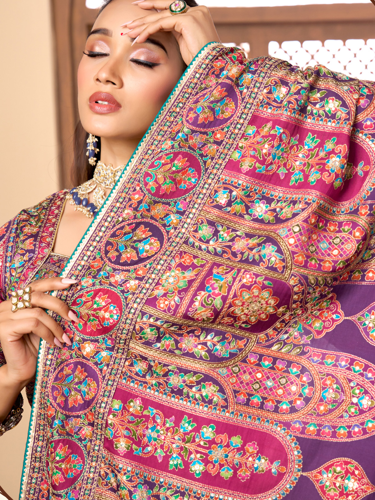 Crafted in soft purple printed satin silk saree is beautifully enhanced with resham and sequin work that adds graceful festive shimmer. Lightweight and fluid in drape, it comes paired with a coordinated ready made blouse. Perfect for weddings, festive celebrations and sangeet evenings with timeless ethnic charm.