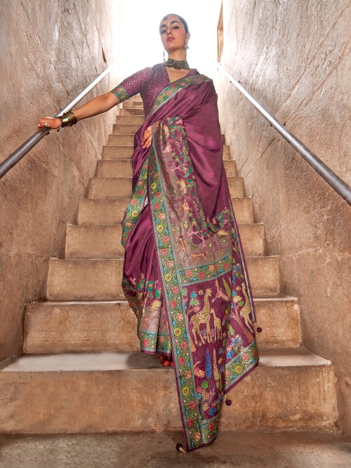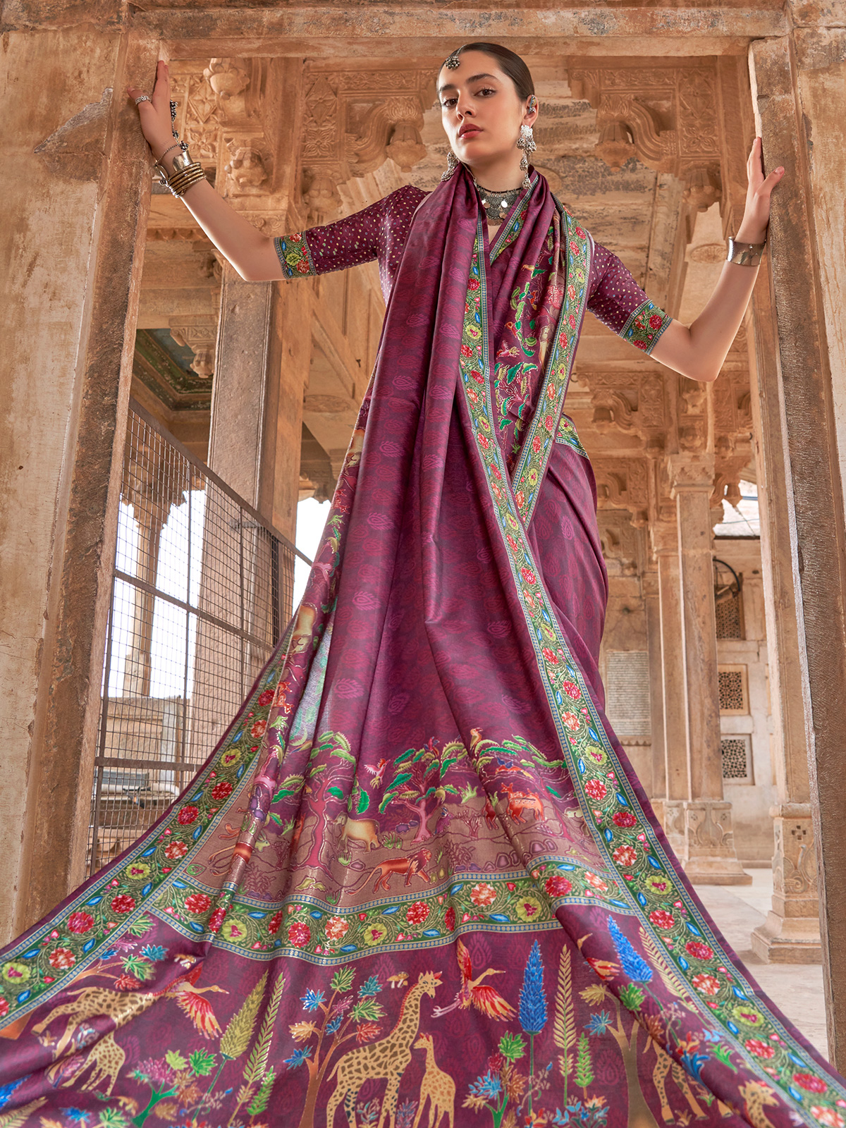 With the richness of twilight, this purple silk saree glows with quiet grandeur. Its printed motifs flow like soft hymns on evening winds. Accompanied by an unstitched blouse piece, it’s well-suited for festivals steeped in elegance and grace.
