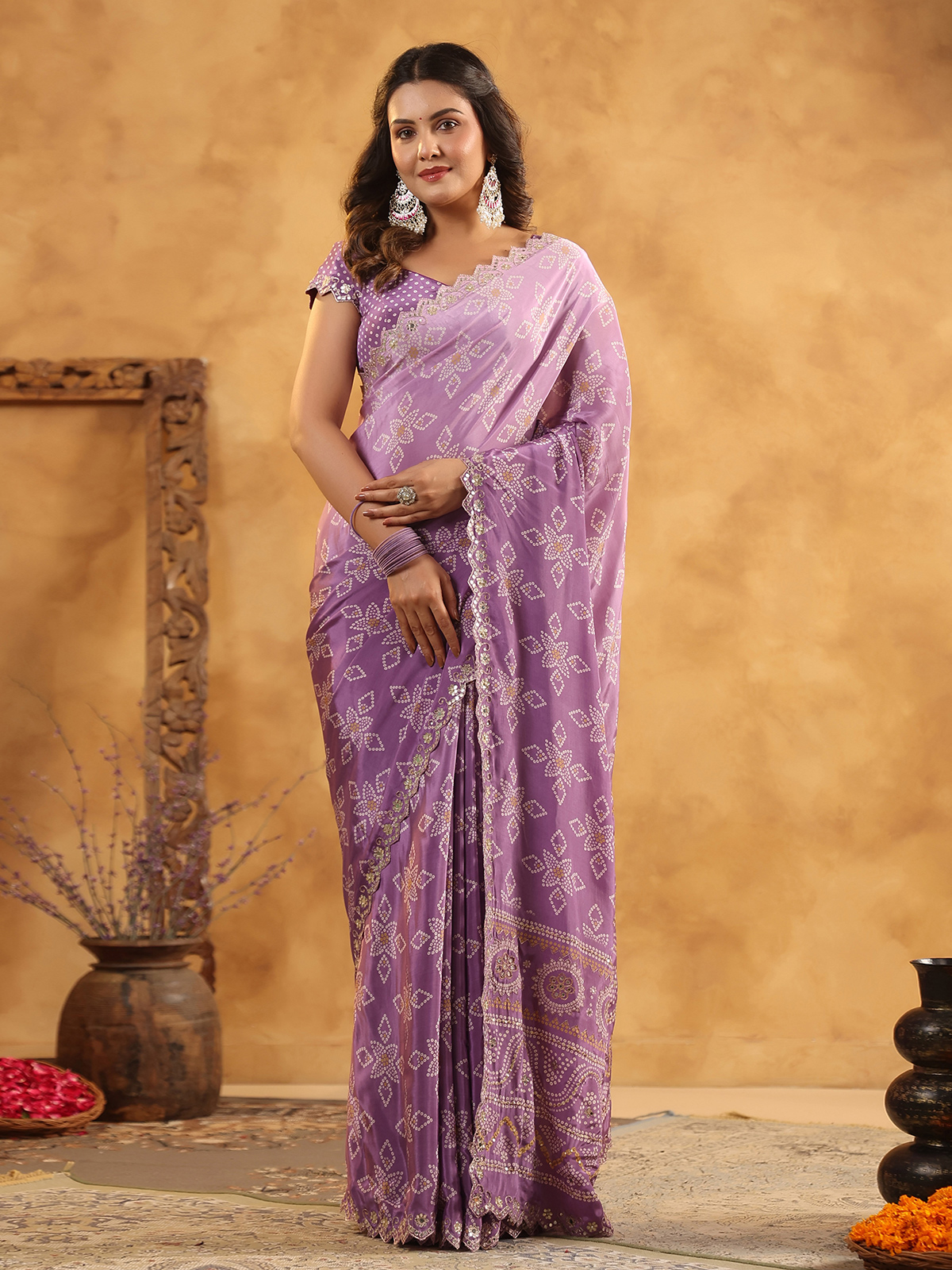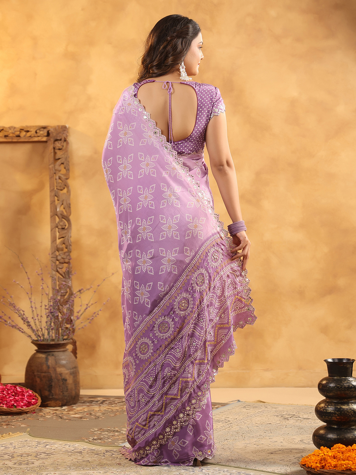Modern elegance flows through the purple silk printed saree, luminous in texture. Aabla, resham, gota, beads, and sequins craft sparkling motifs. Paired with an unstitched blouse piece for festive celebrations.