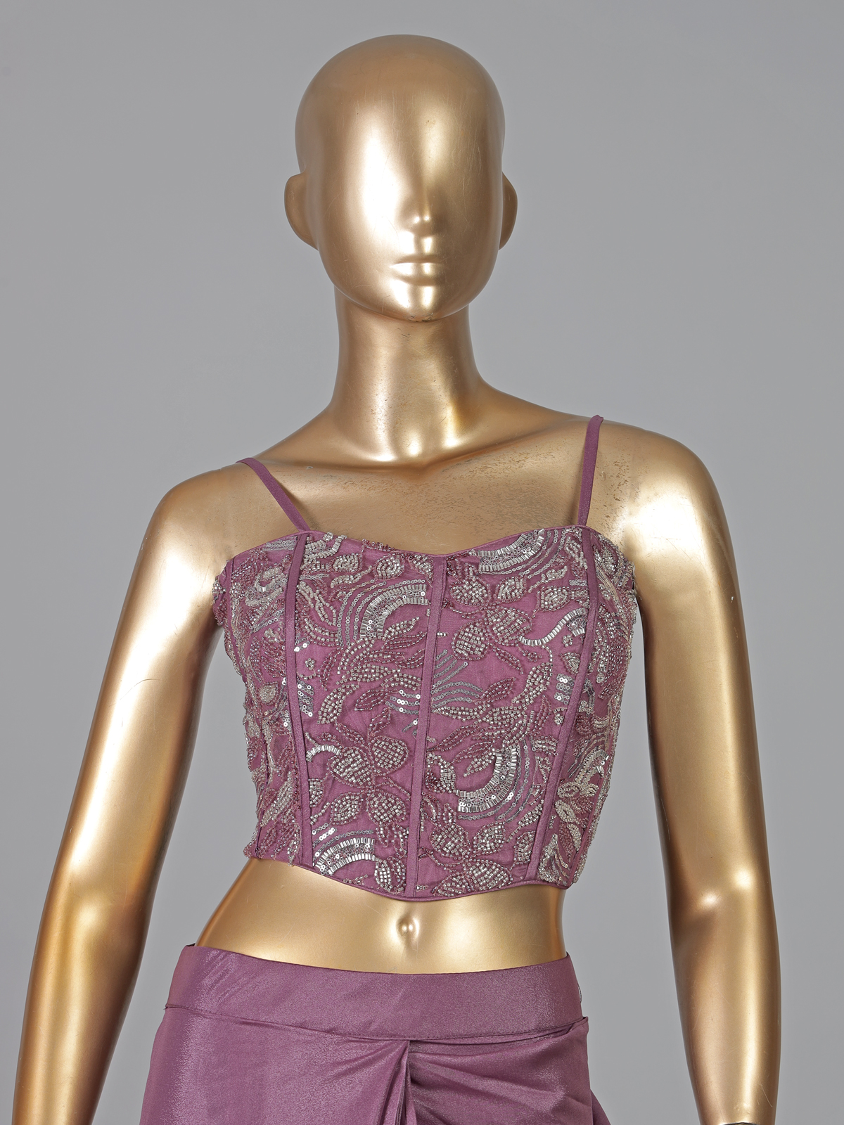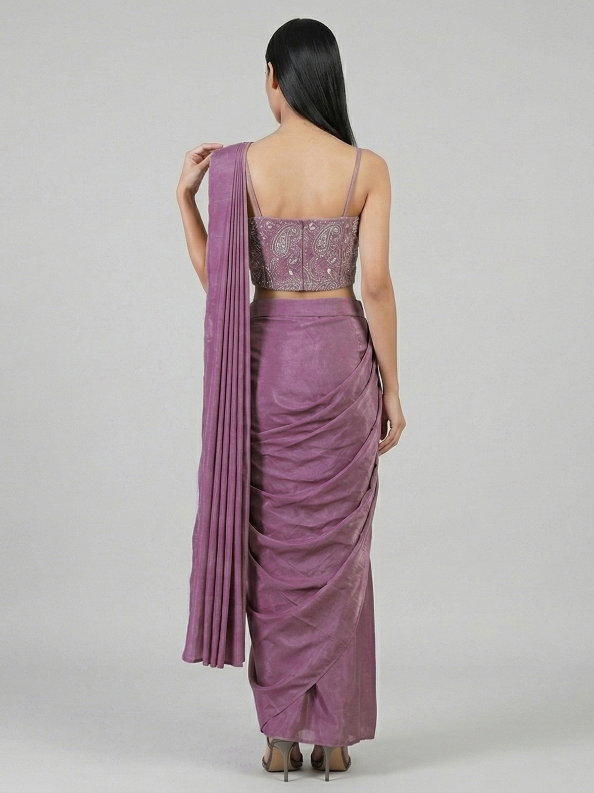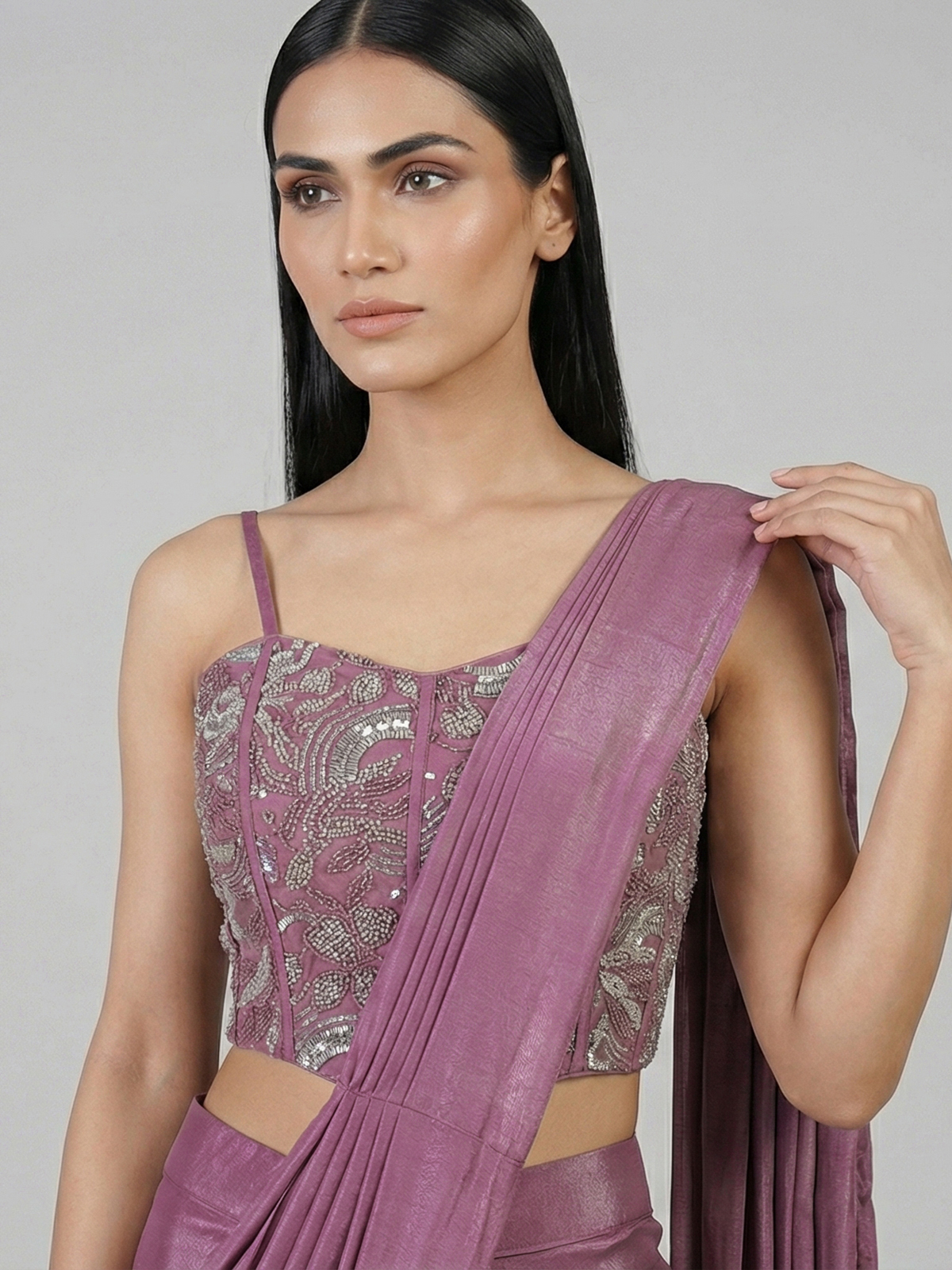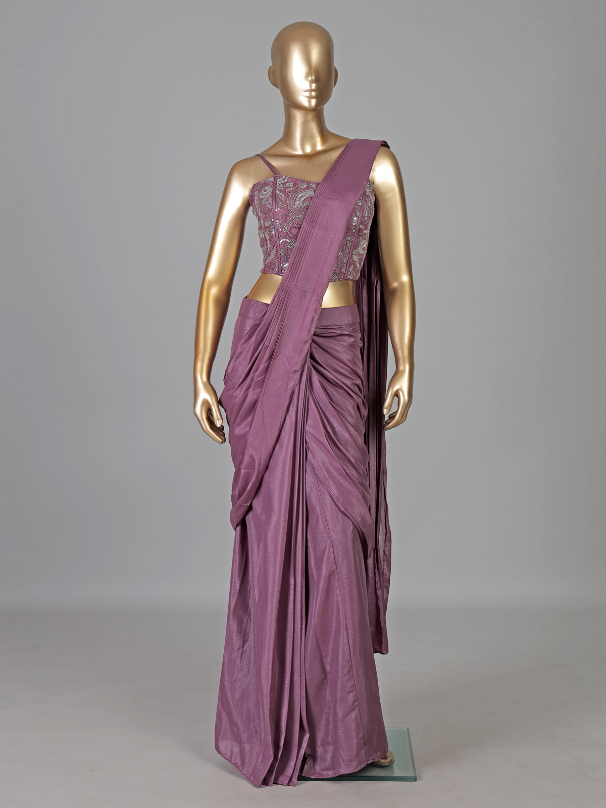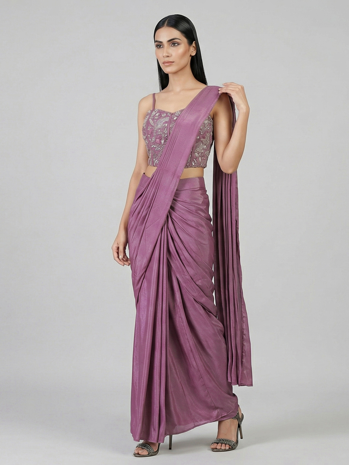 Lustrous and captivating purple satin silk ready to wear saree exudes modern elegance with its fluid drape. Adorned with shimmering cutdana and sequins work. It reflects a radiant festive glow. Designed for effortless styling, it offers a graceful silhouette, making it a perfect choice for weddings, sangeet, receptions and glamorous party occasions.