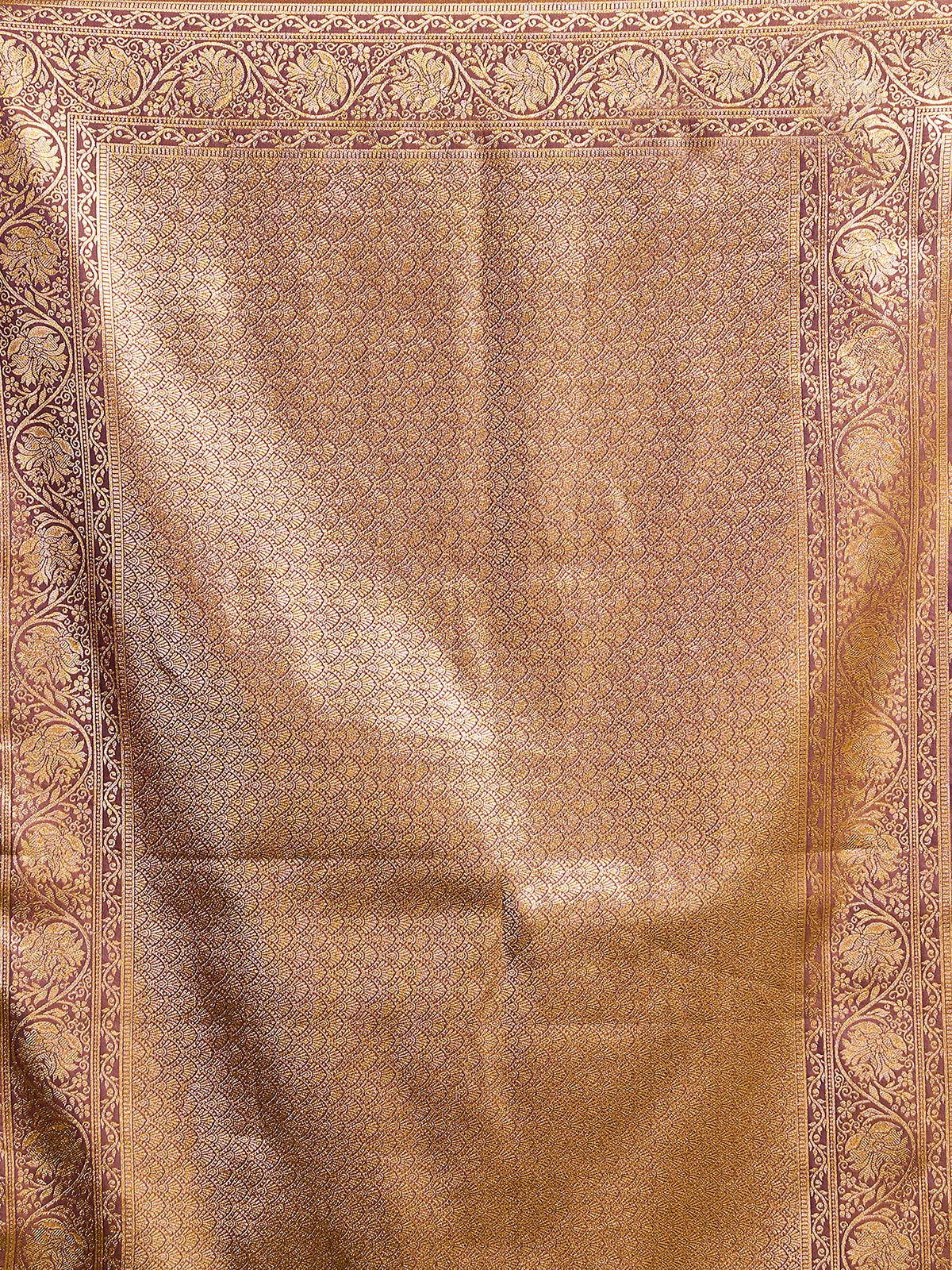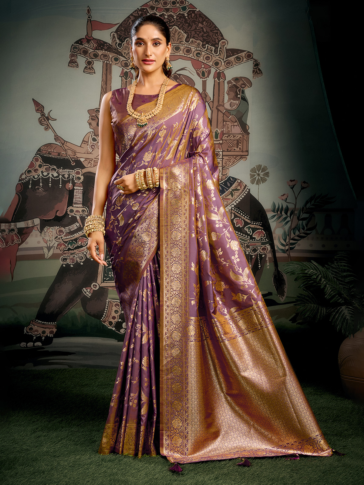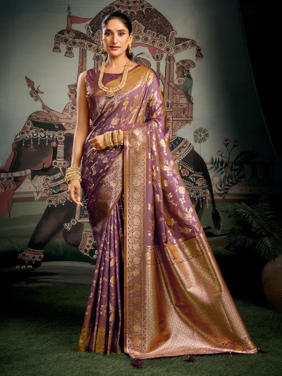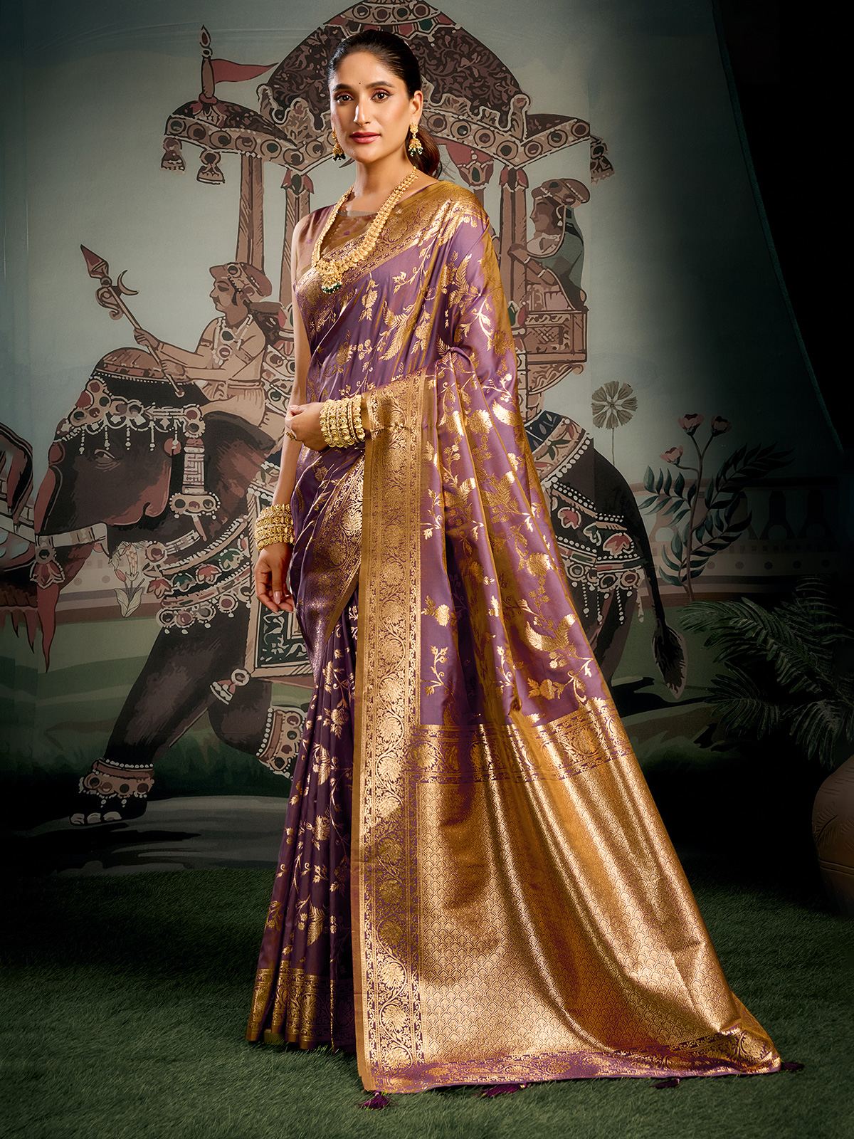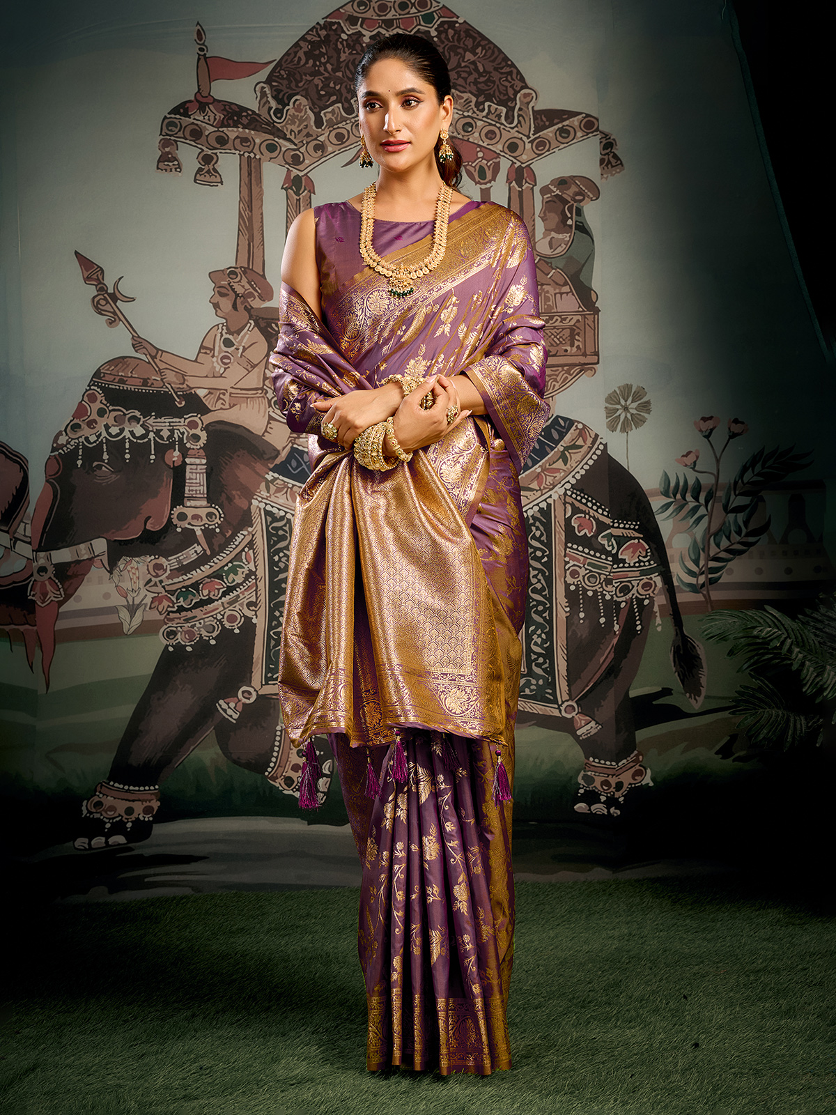 Purple silk brings a regal lustre to this saree, elevated by zari artistry that glows like quiet twilight patterns across every fold. The look is completed with an unstitched blouse piece, making it ideal for festive gatherings, wedding celebrations, receptions, and sophisticated party occasions.