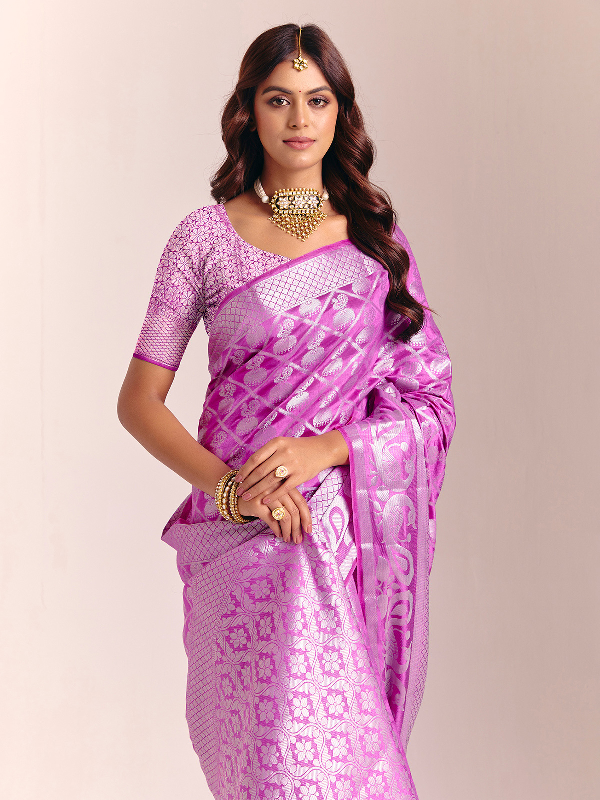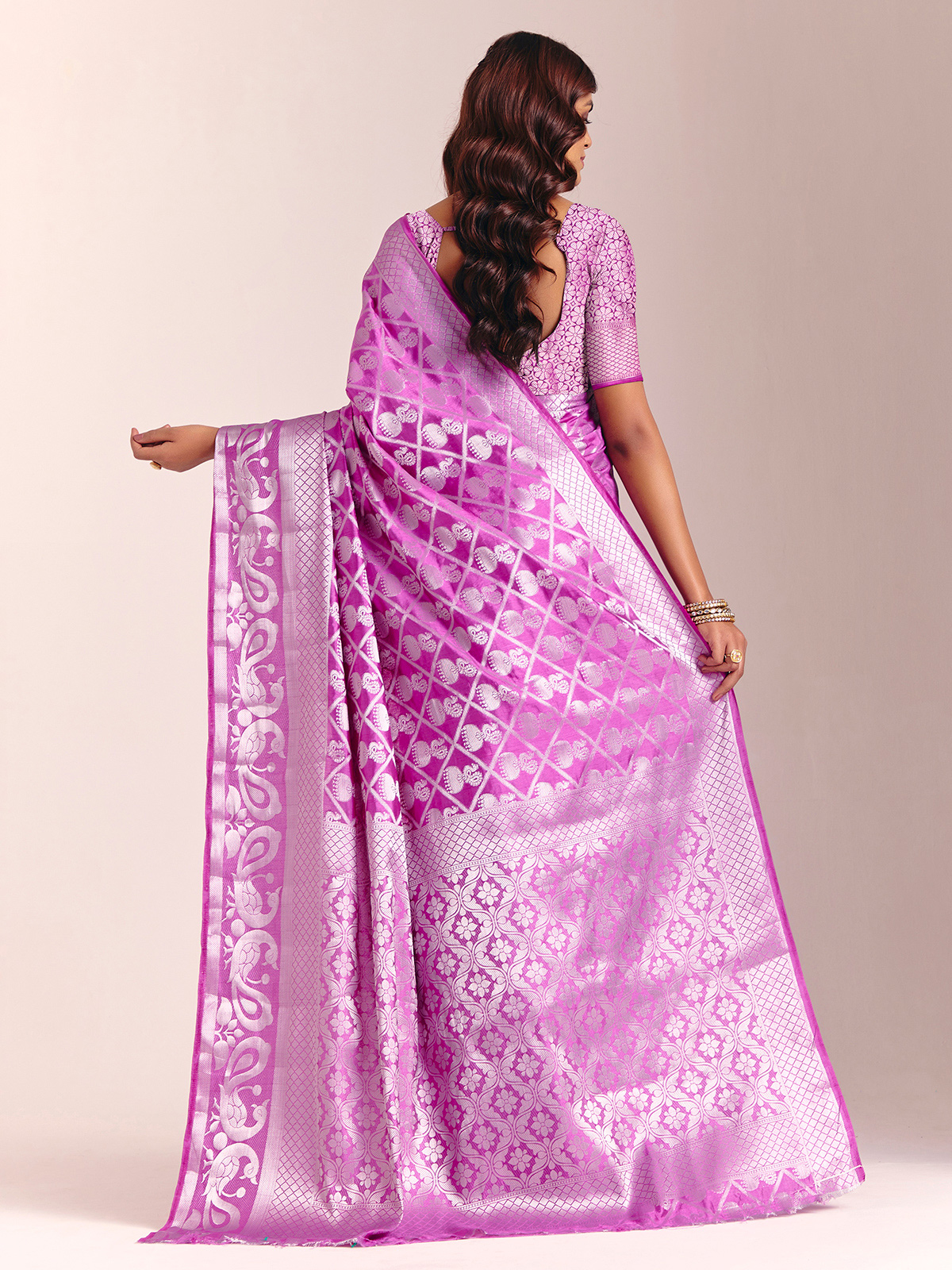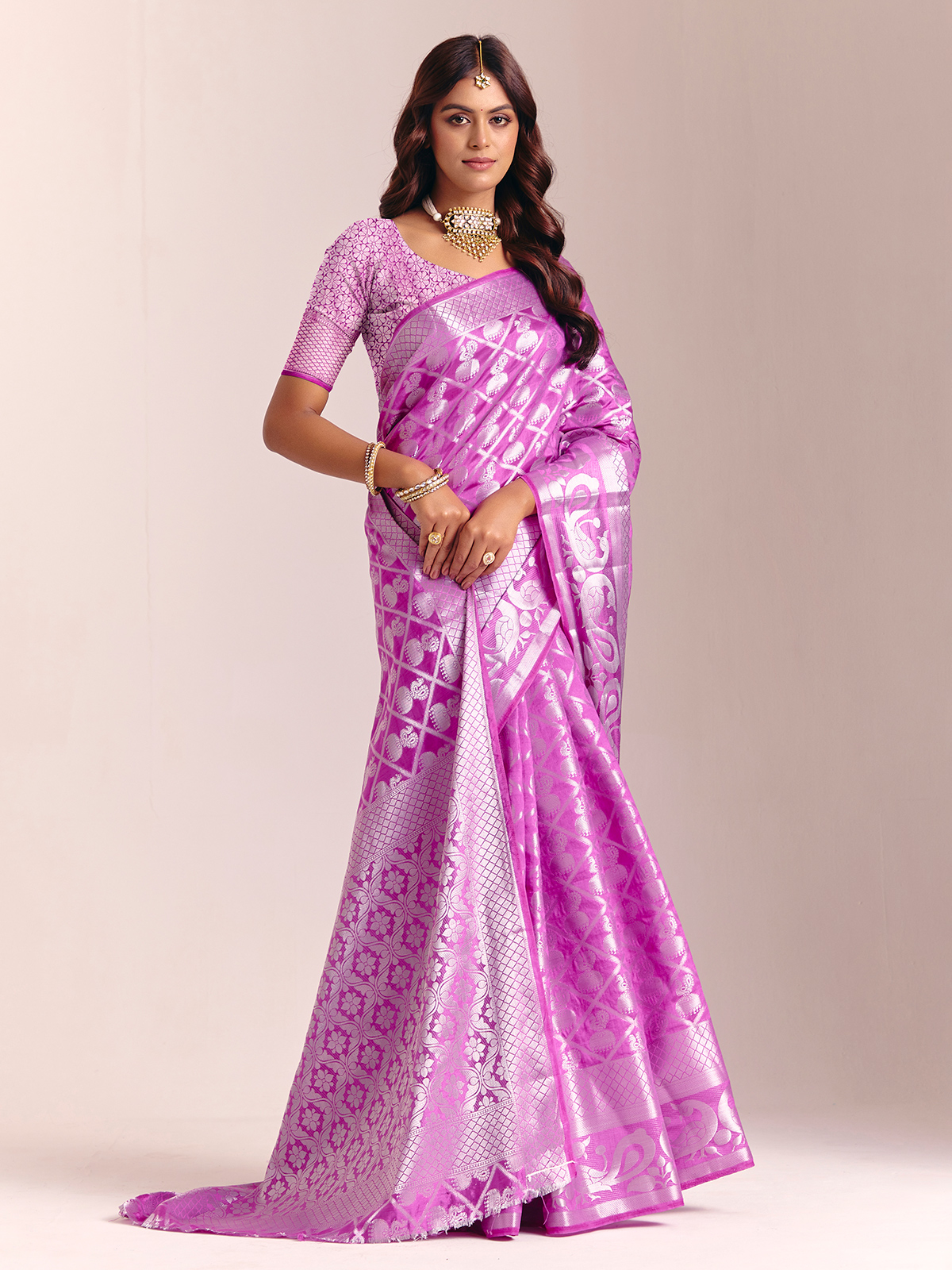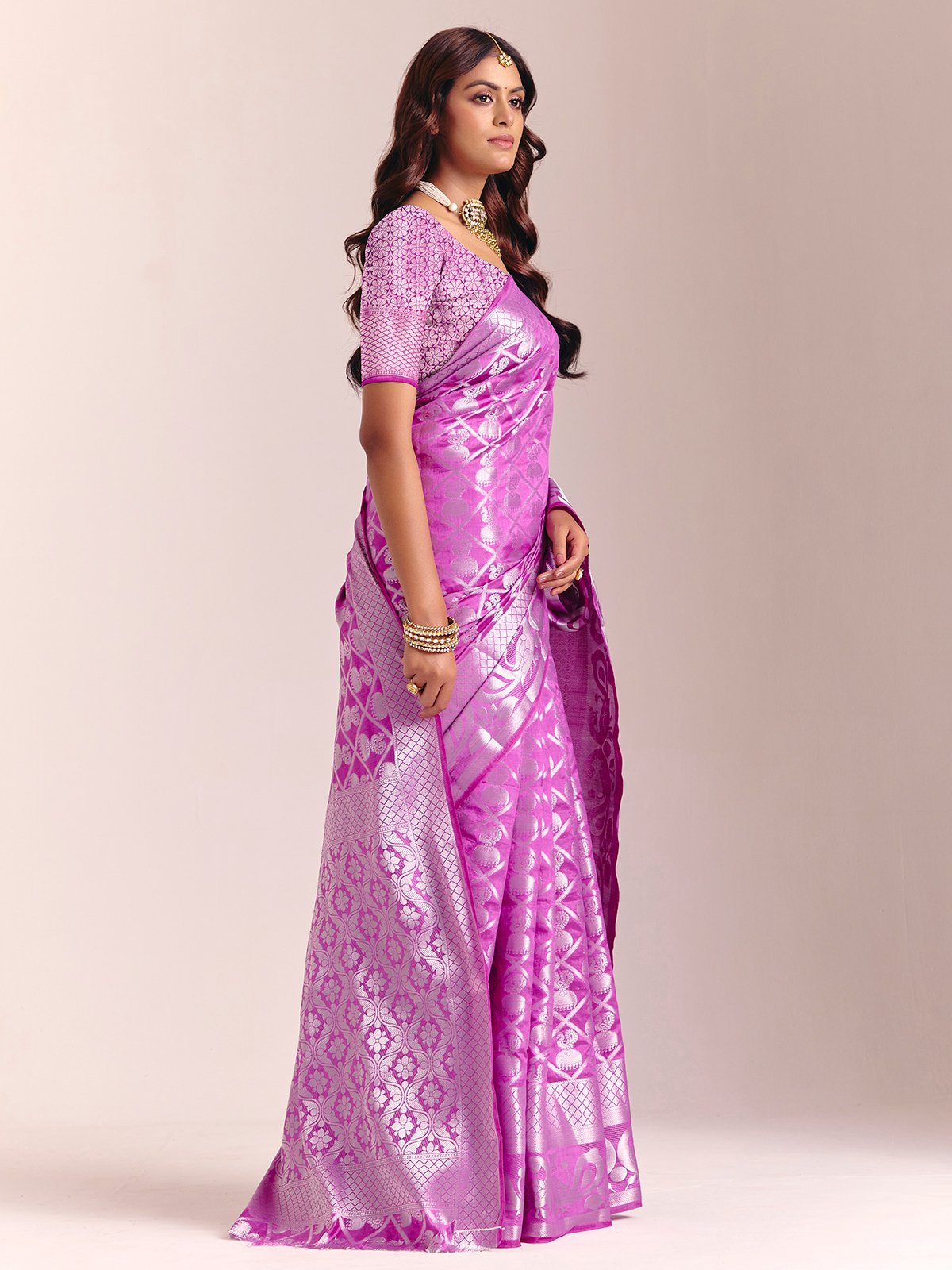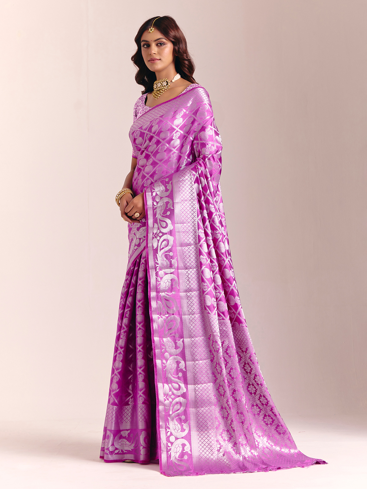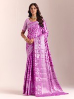 This purple silk saree is adorned with stunning zari embellishments that bring a rich, majestic glow. The fluid drape creates a poised, elegant look, complemented by an unstitched blouse piece for your custom fit. Ideal for weddings, receptions and festive celebrations.