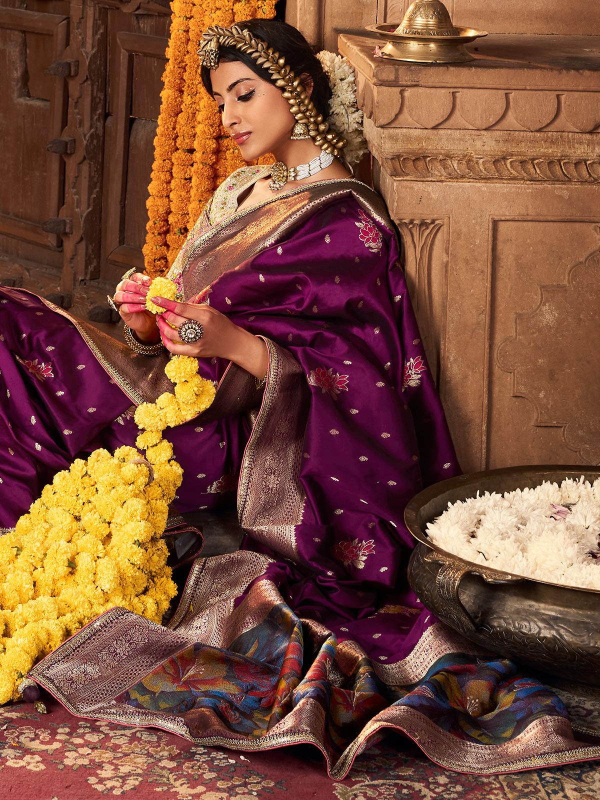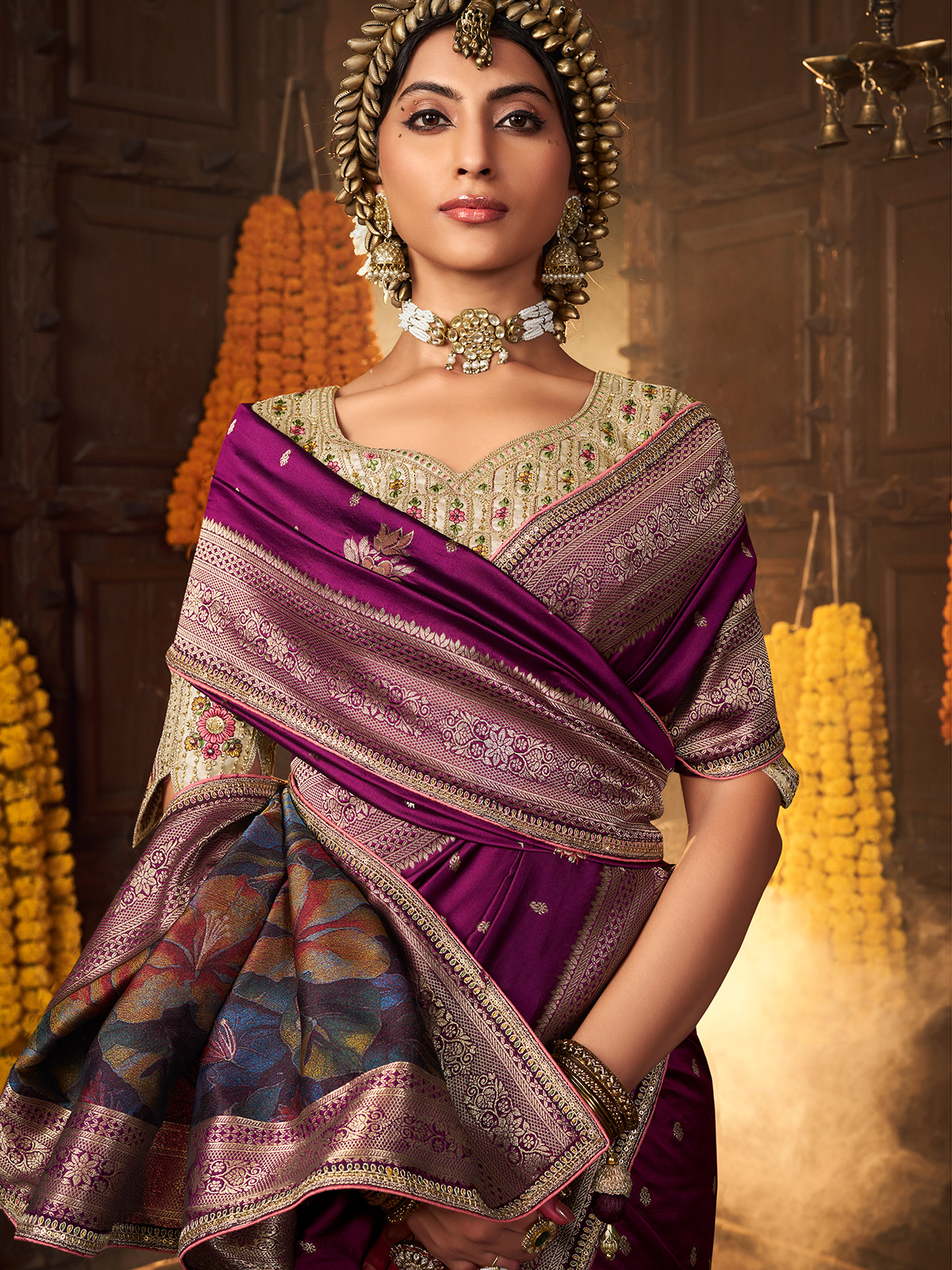 Turn heads in this luxurious purple silk saree, detailed with glowing gold zari borders. Paired with a beautifully adorned unstitched blouse featuring sequin and resham work, it's a perfect choice for weddings, receptions, or grand celebrations.