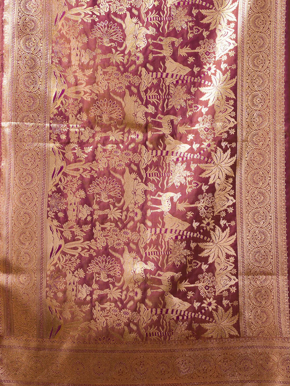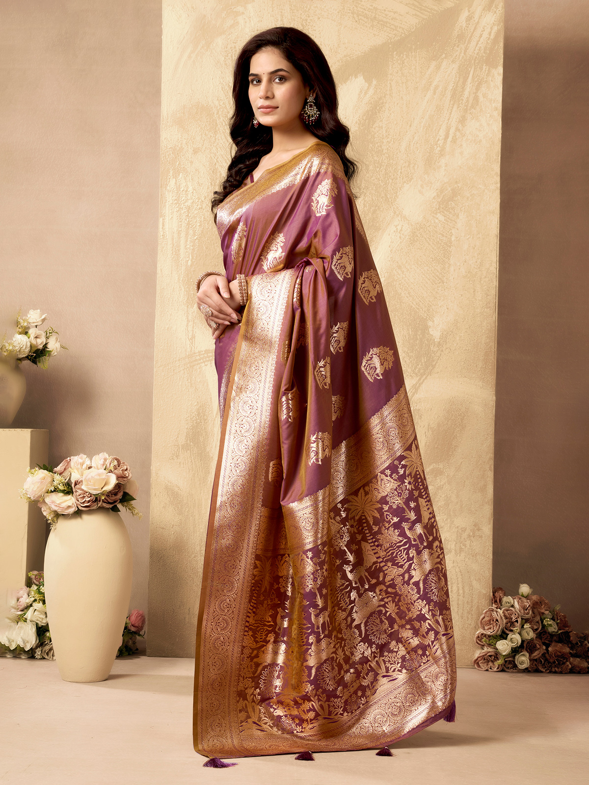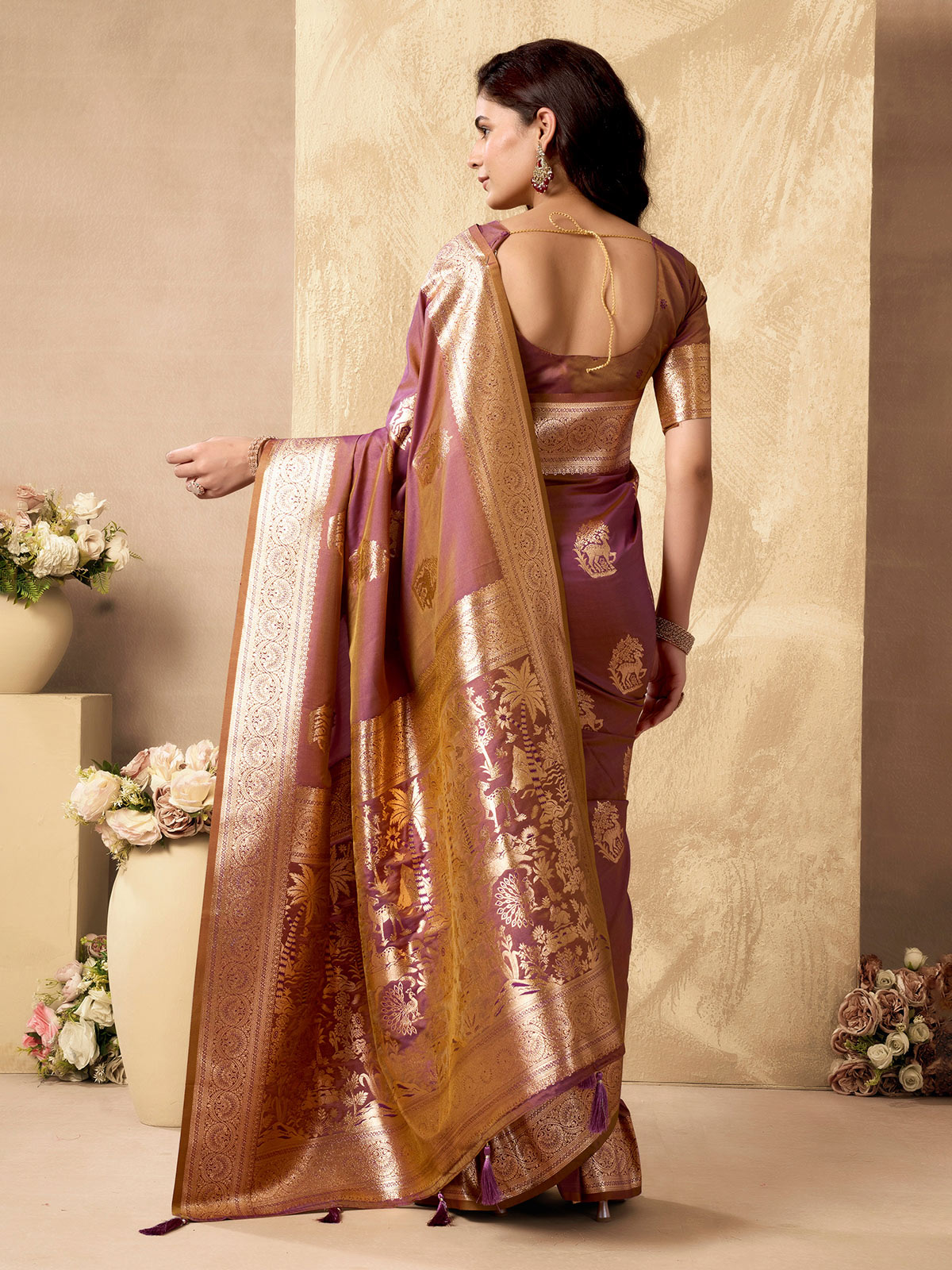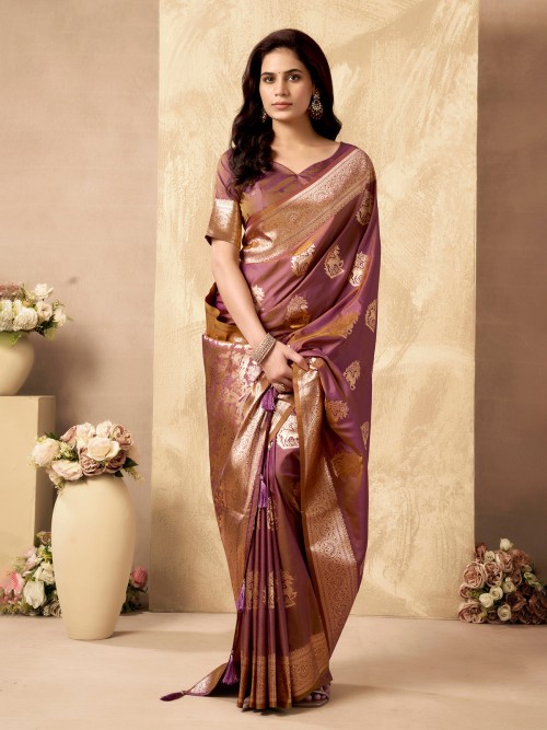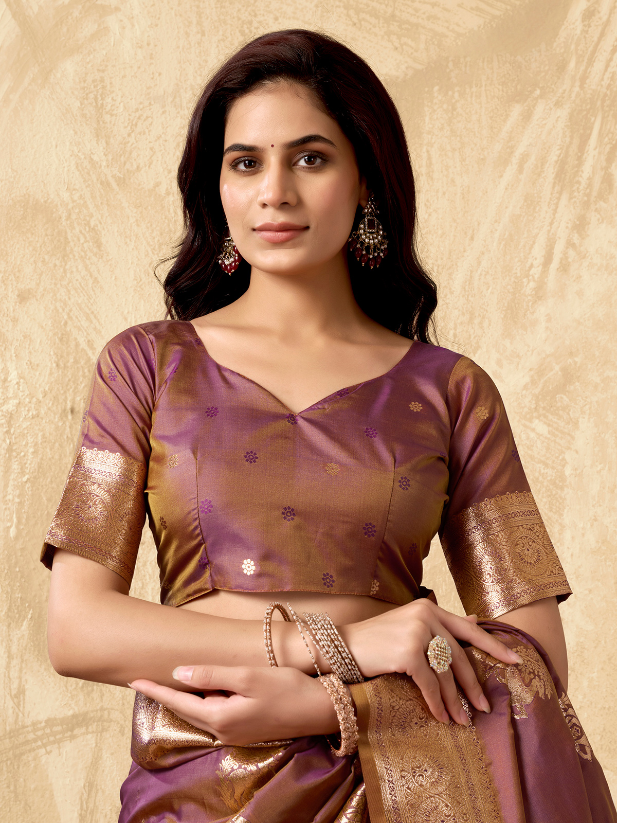 Glow effortlessly in this purple silk saree, designed with shimmering zari weaving for a modern festive vibe. Ideal for parties and traditional functions, it includes an unstitched blouse to help you personalize a chic and confident ethnic look.