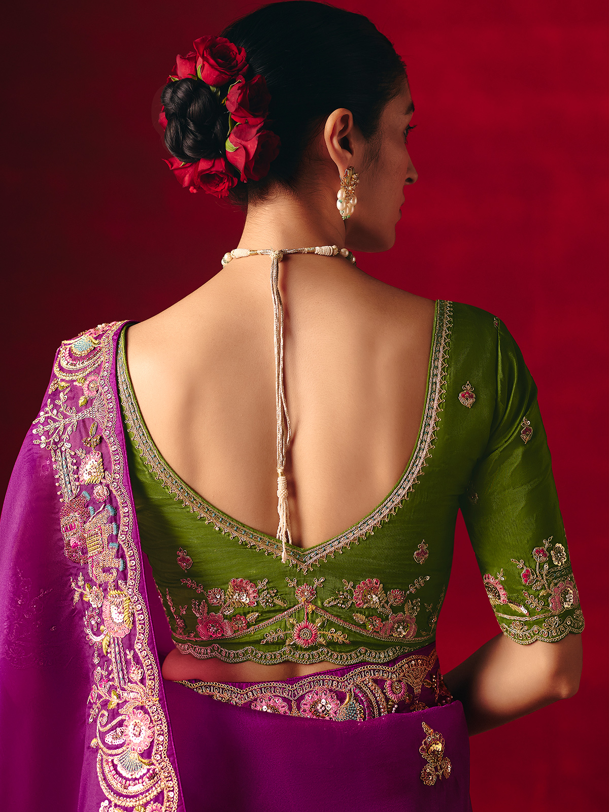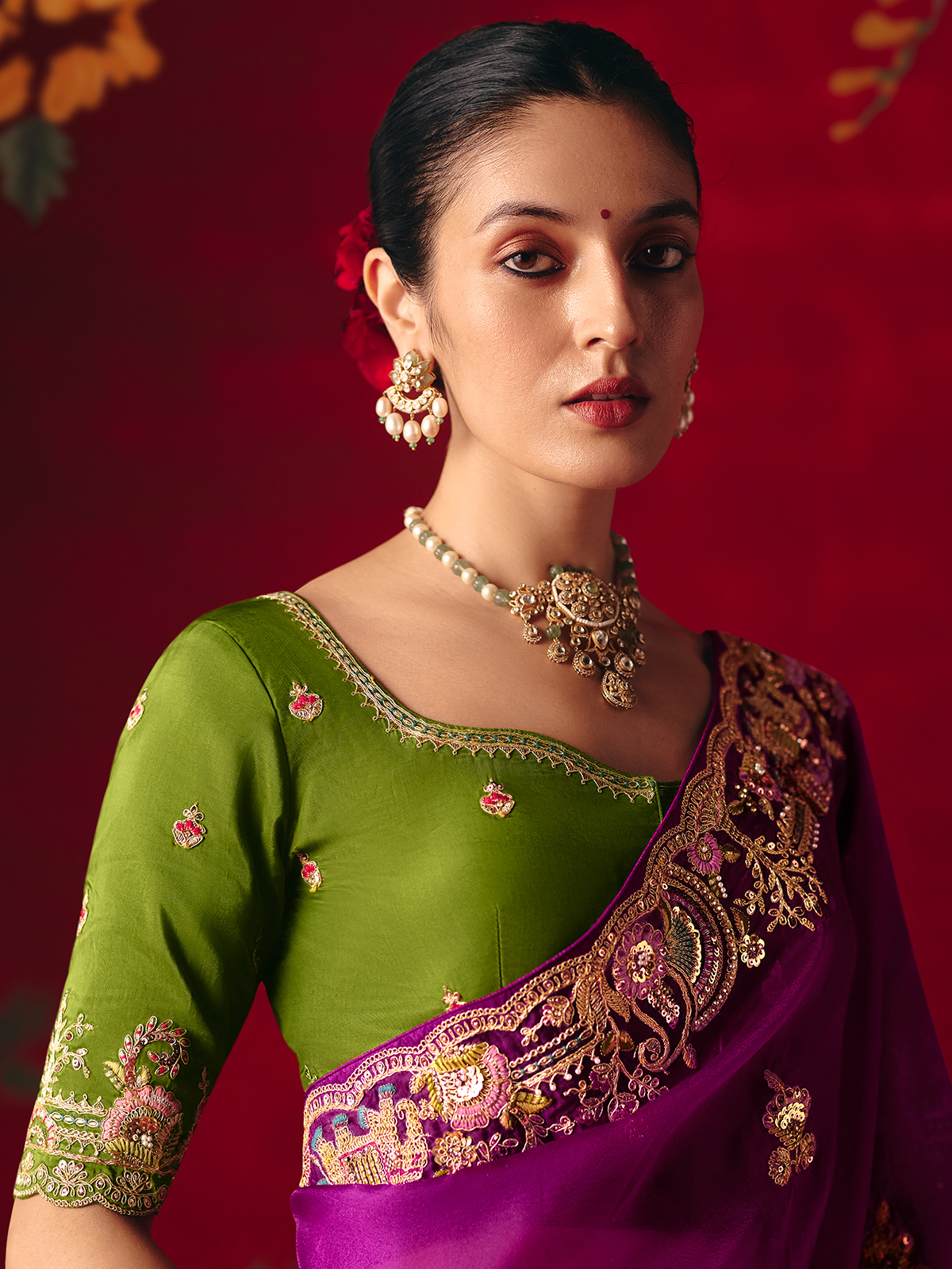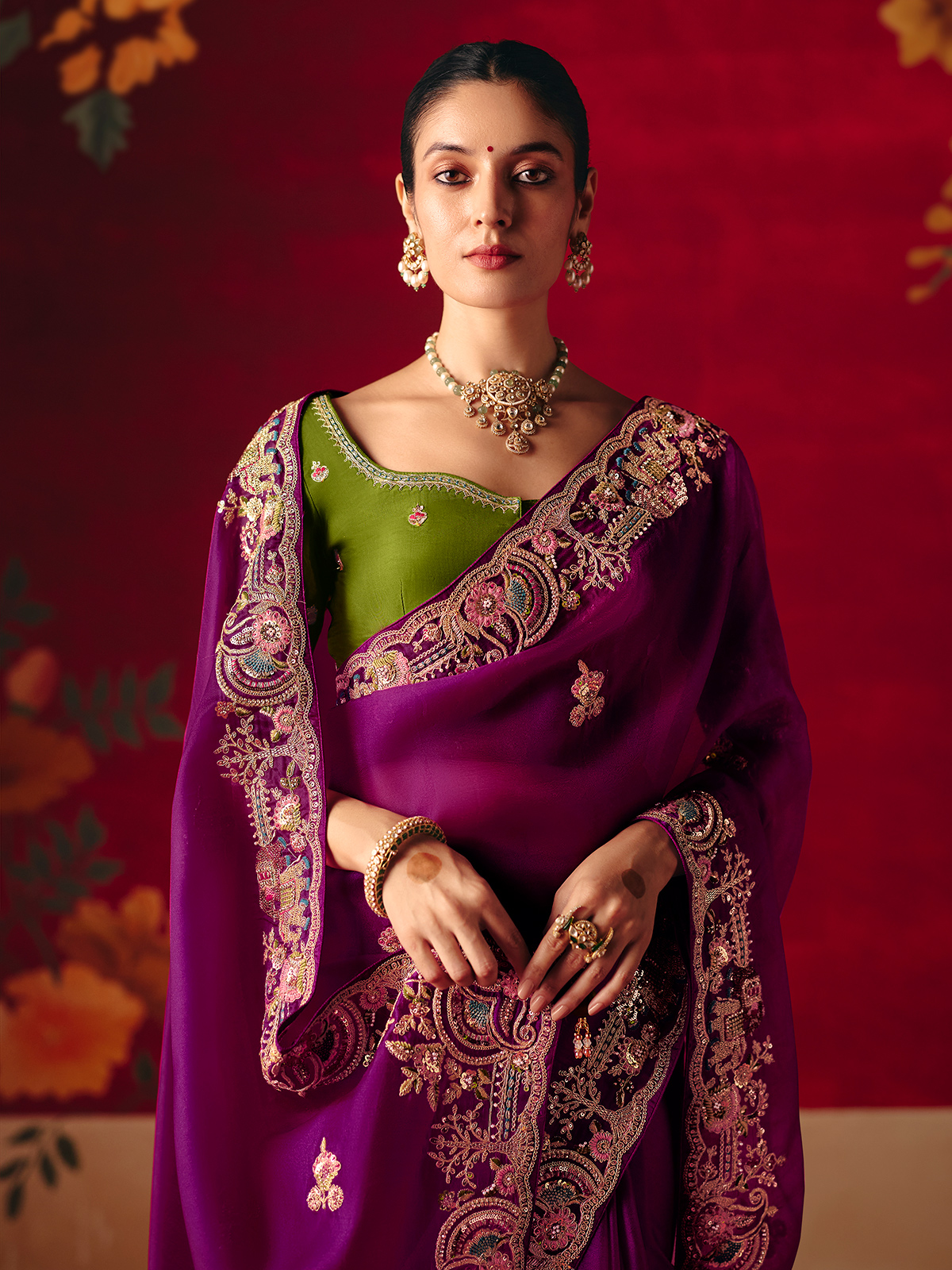 Styled in deep purple tissue organza, this saree showcases elaborate embroidery enriched with sequins, pearls, stone and resham work. Paired with a contrast unstitched blouse piece, it creates a regal statement for weddings, festive functions and reception celebrations.