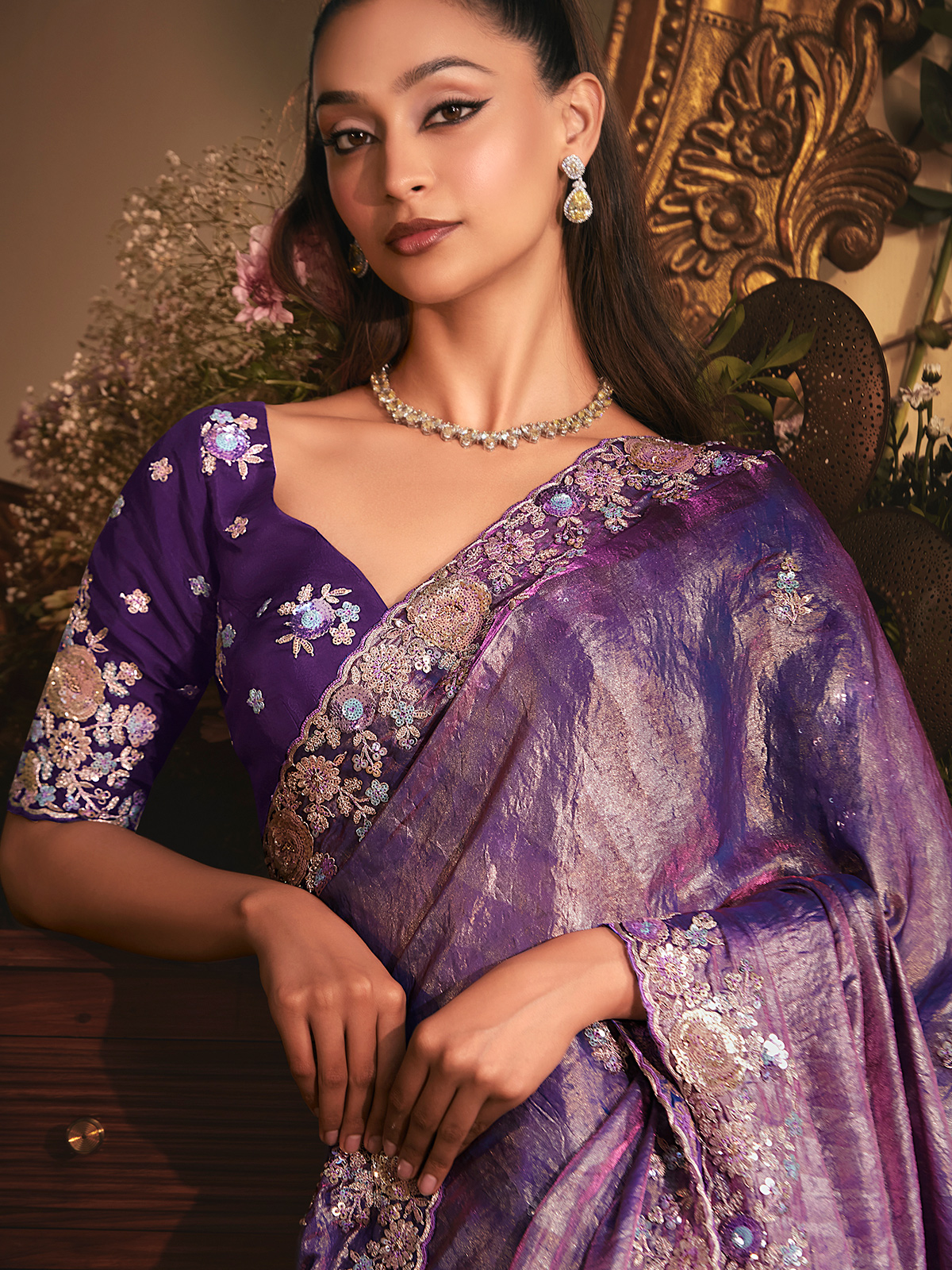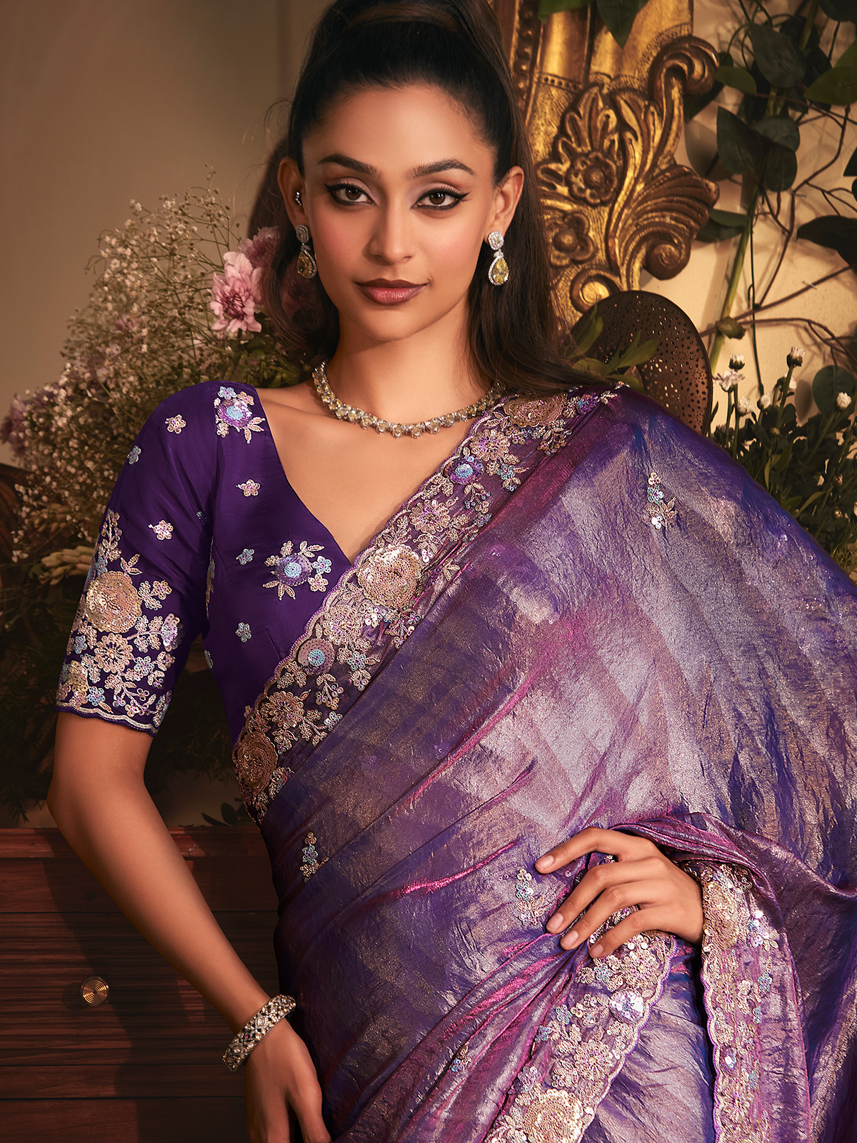 Deep purple tissue organza gives this saree a mesmerizing richness with an effortlessly fluid silhouette. Resham and sequins illuminate the fabric in delicate highlights, adding a contemporary flourish to its timeless charm. Accompanied by an unstitched blouse piece, it suits festive celebrations, radiant weddings, and elegant reception nights flawlessly.