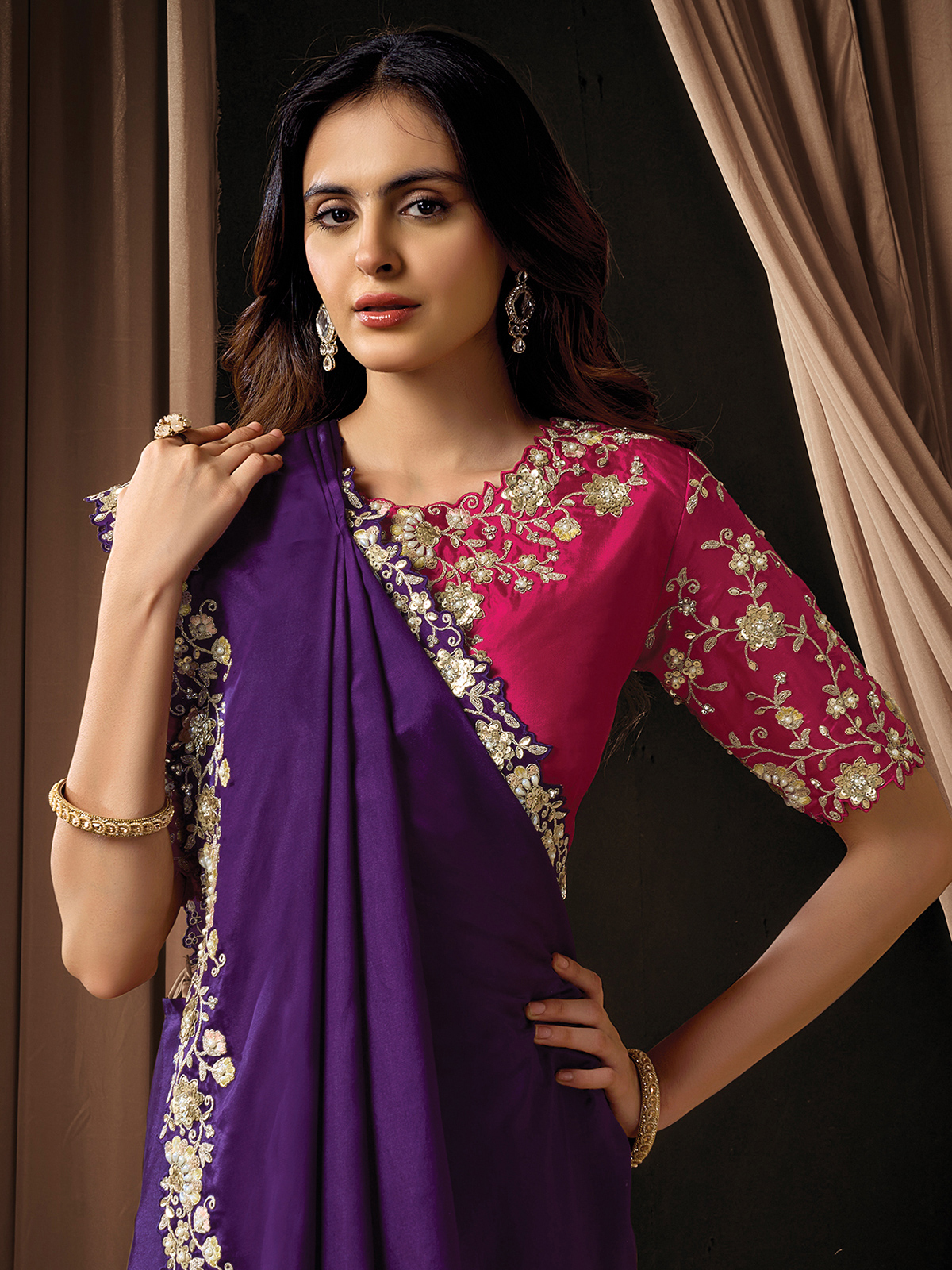 Adding a regal touch to feminine beauty, this purple uppada silk saree blends heritage with modern finesse. Enhanced with resham, sequins, diamonds, and pearl work, it shimmers gracefully across the drape. Designed for festivals, receptions, and weddings, it is paired with an unstitched heavily worked blouse.