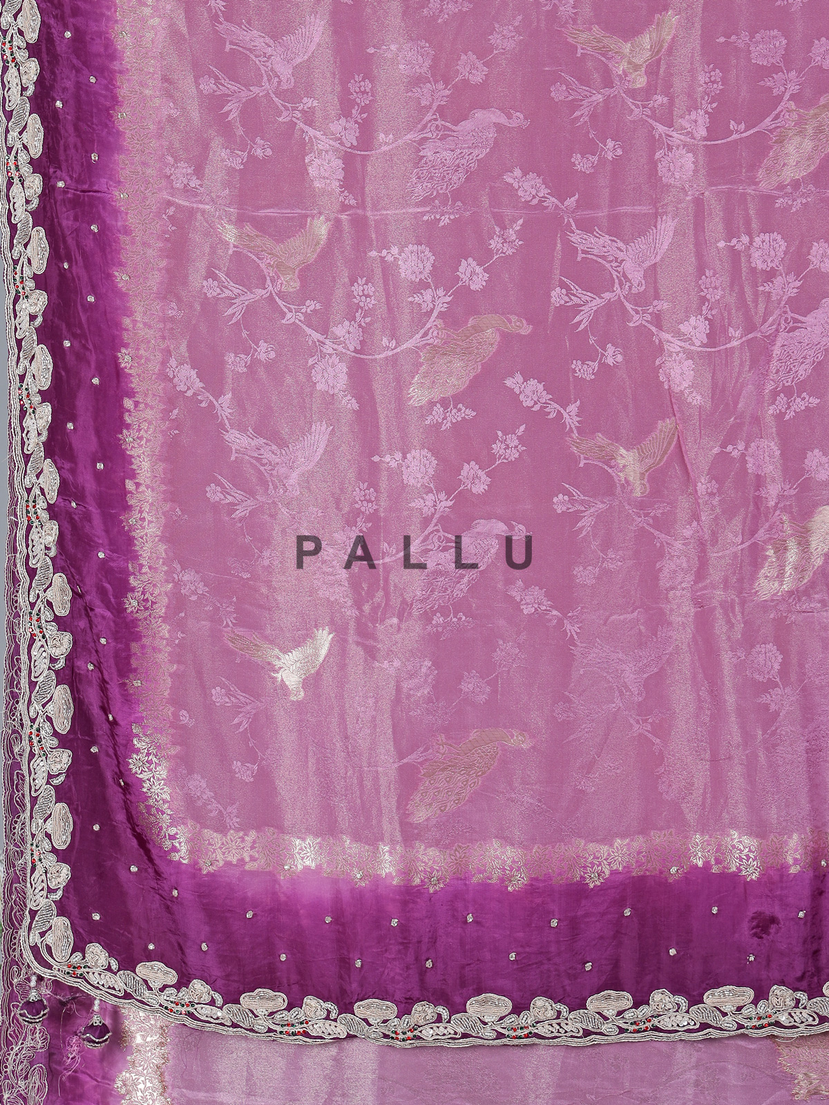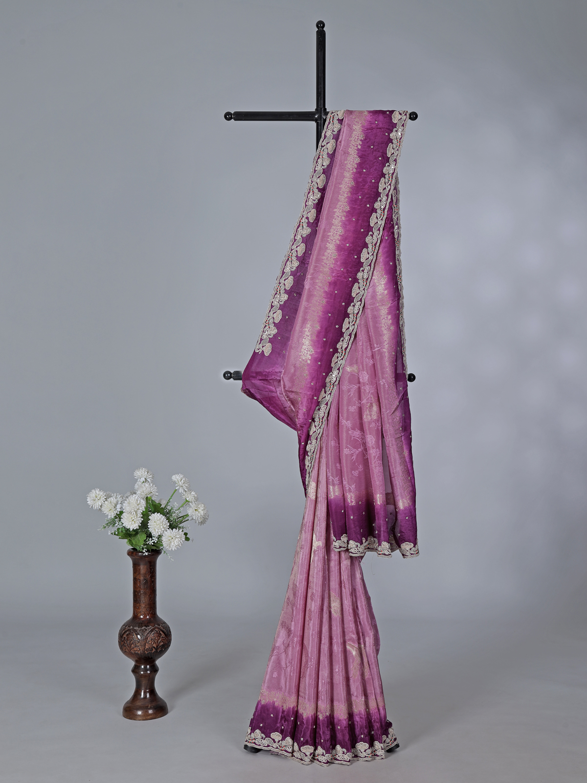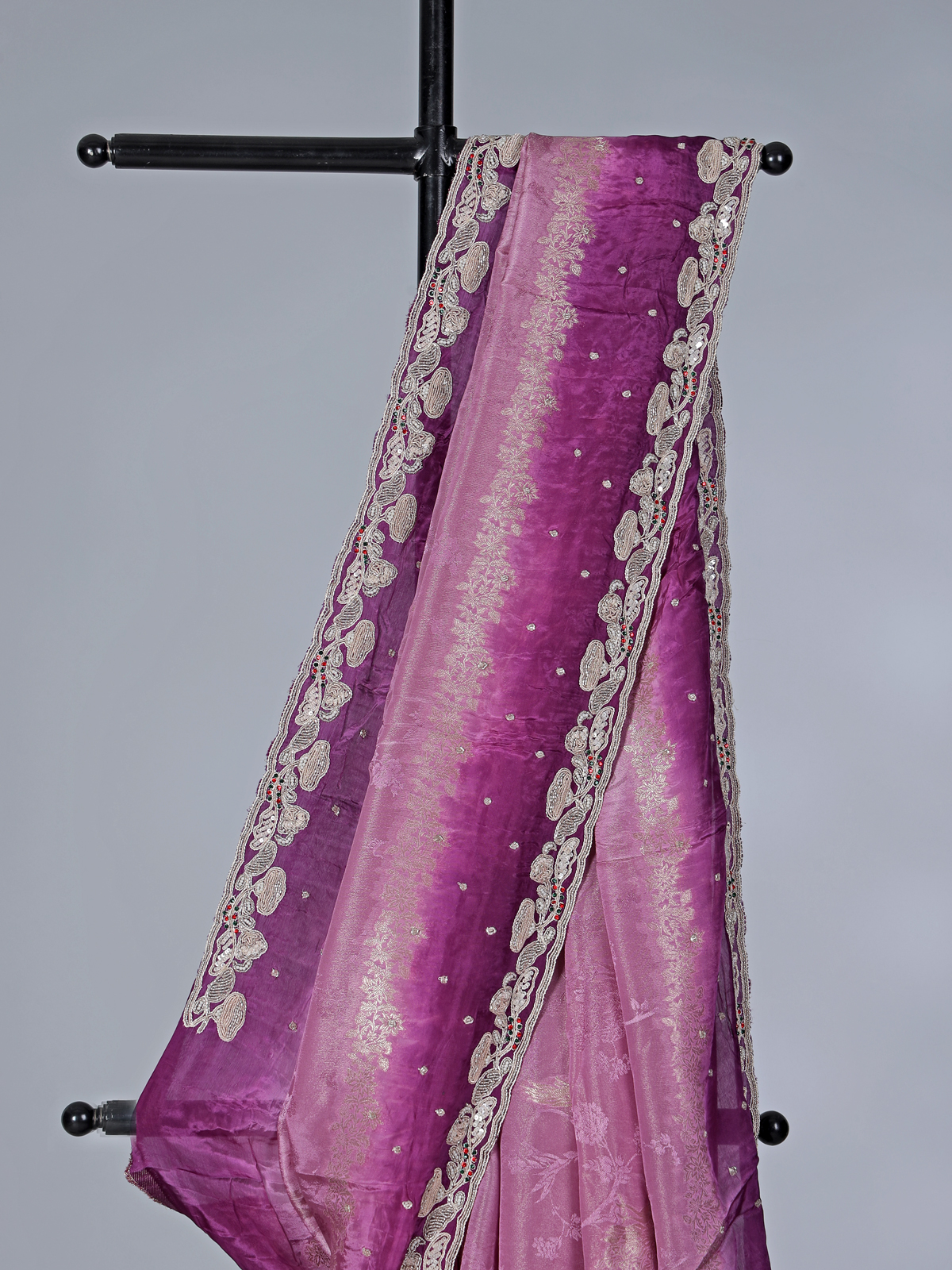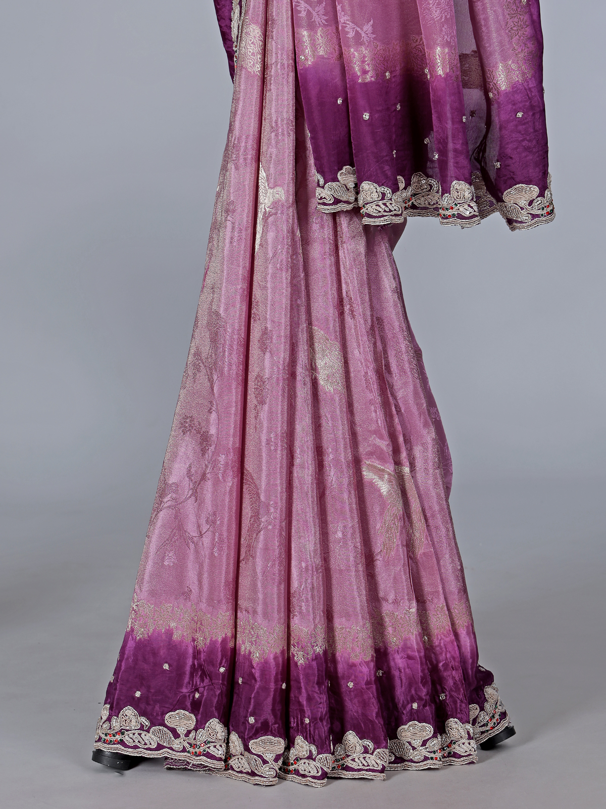 Radiating regal sophistication and festive beauty, this shaded purple chiniya silk saree enhances feminine elegance with its rich gradient hues and smooth texture. Designed with zari, beads, sequins, cutdana and resham embellishments, it reflects exquisite craftsmanship. A graceful pick for festivals, parties and weddings, it is paired with an unstitched blouse piece.