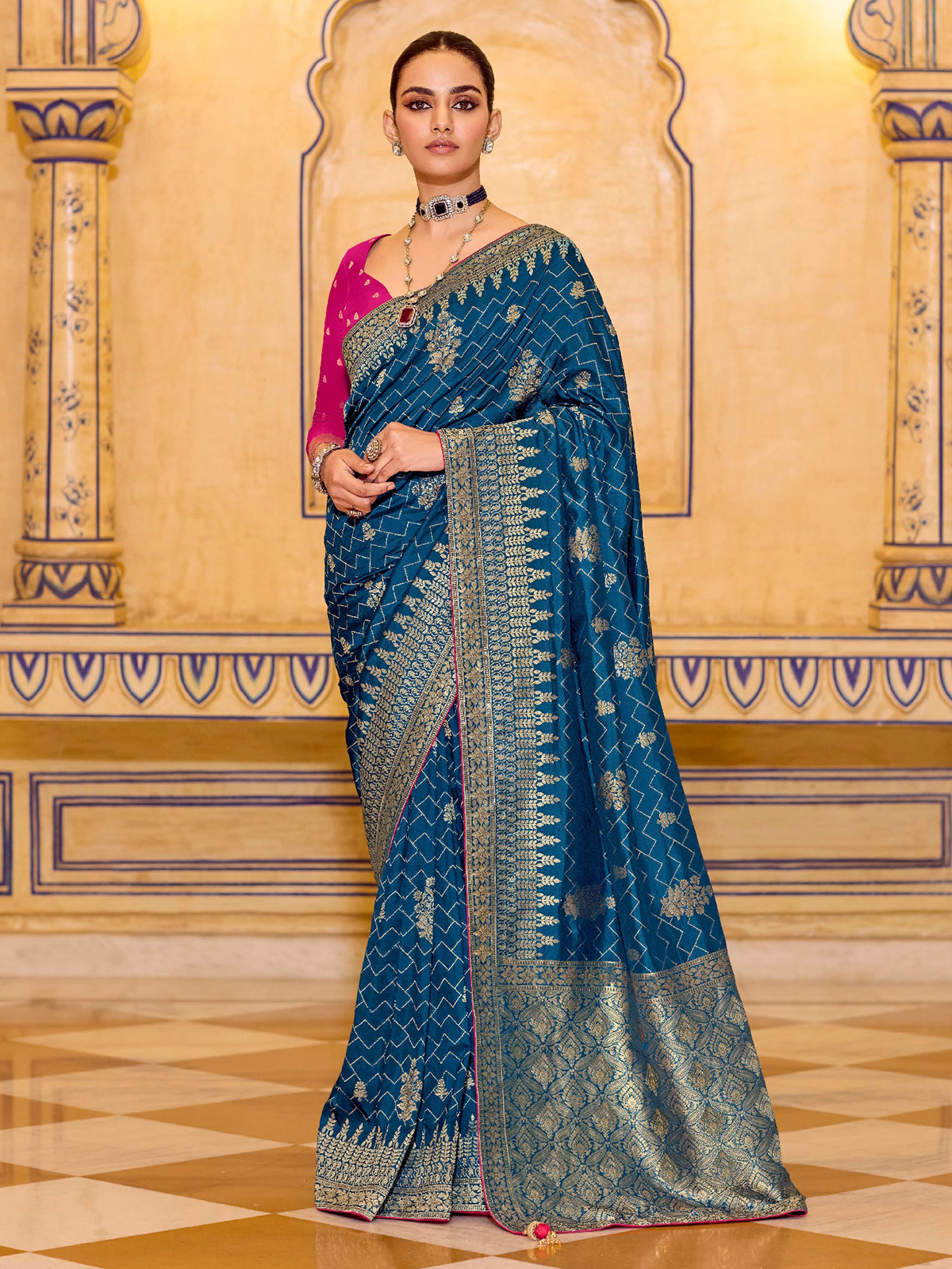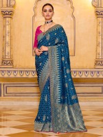 This radiant rama blue banarasi crepe silk saree showcases exquisite zari work that highlights its regal elegance. Perfect for weddings, festive gatherings, and puja moments, it drapes beautifully with a luxurious fall. The included unstitched blouse allows effortless personalization for any special occasion.