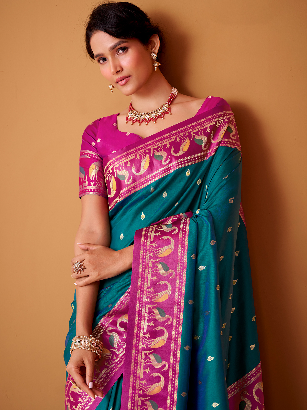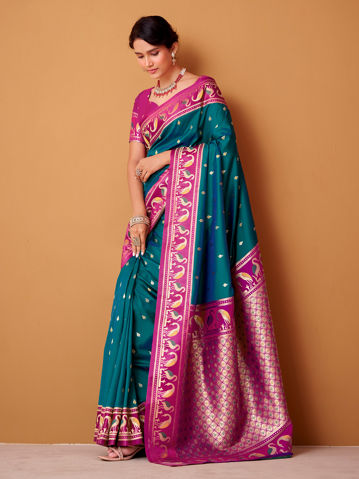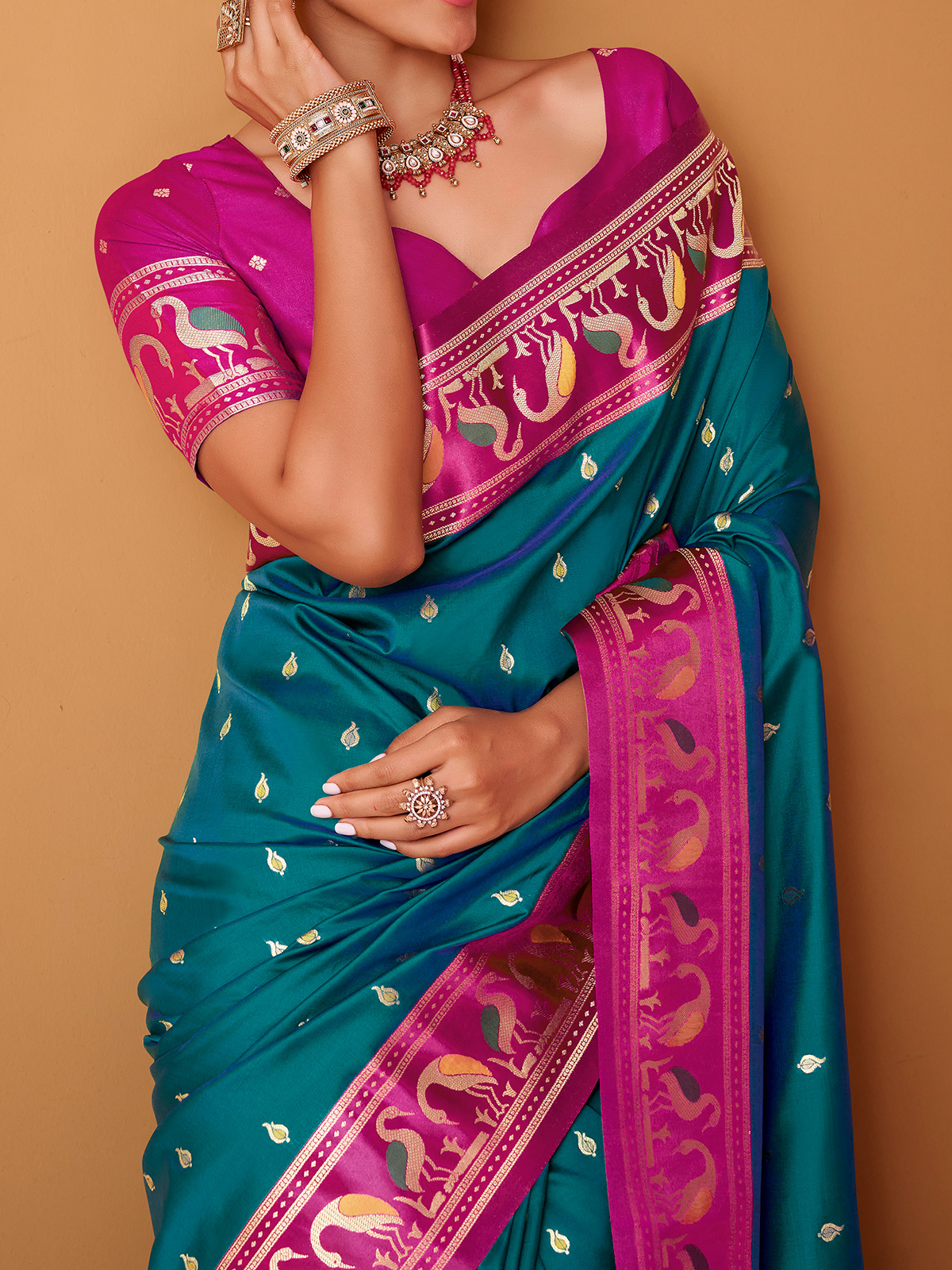 Elegant and eye-catching, this rama blue soft satin silk saree features a lustrous finish and fluid silhouette. The saree is enhanced with a bold contrast pink border detailed in rich zari craftsmanship, adding regal charm. Completed with a pink unstitched blouse piece, it is ideal for weddings and festive gatherings.