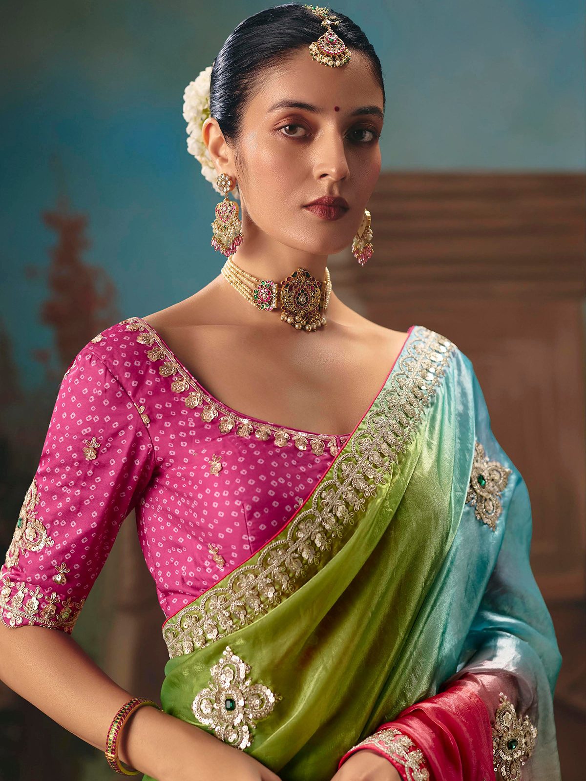 Elegant rama blue fancy tissue silk saree adorned with delicate butti motifs highlighted by embroidery, sequins and resham work. Paired with an unstitched blouse piece, its graceful drape makes it ideal for weddings, festive celebrations, sangeet functions and reception wear.
