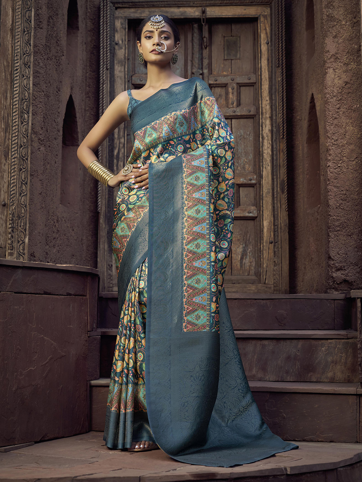 This ramablue silk saree showcases fine zari artistry, lending a polished festive shimmer to its elegant drape. Paired with an unstitched blouse, it is ideal for weddings, receptions and festive celebrations. The soothing shade and graceful finish make it a standout ethnic addition.