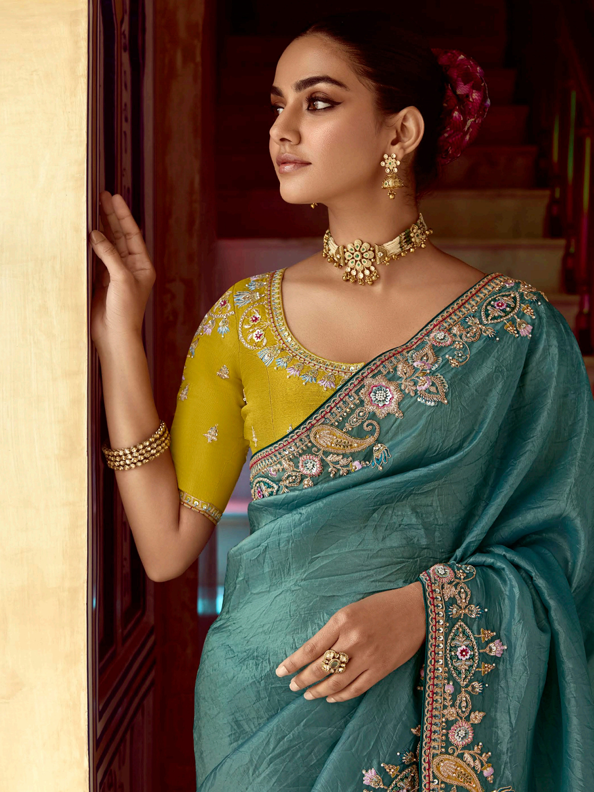 Rama Blue Tissue Silk Saree With Resham Detailing