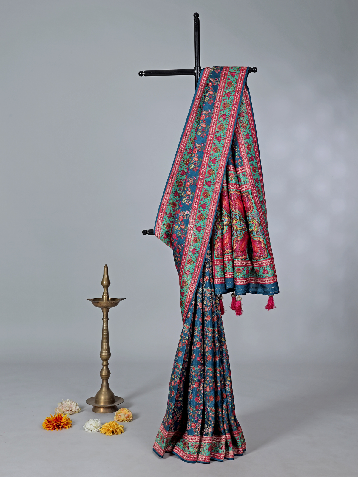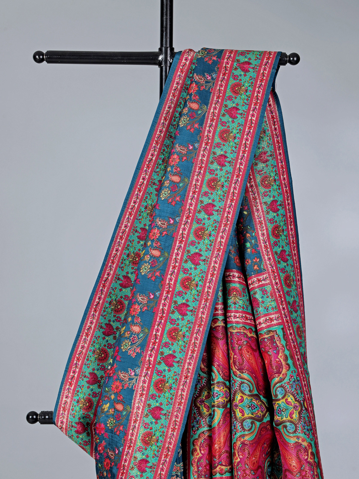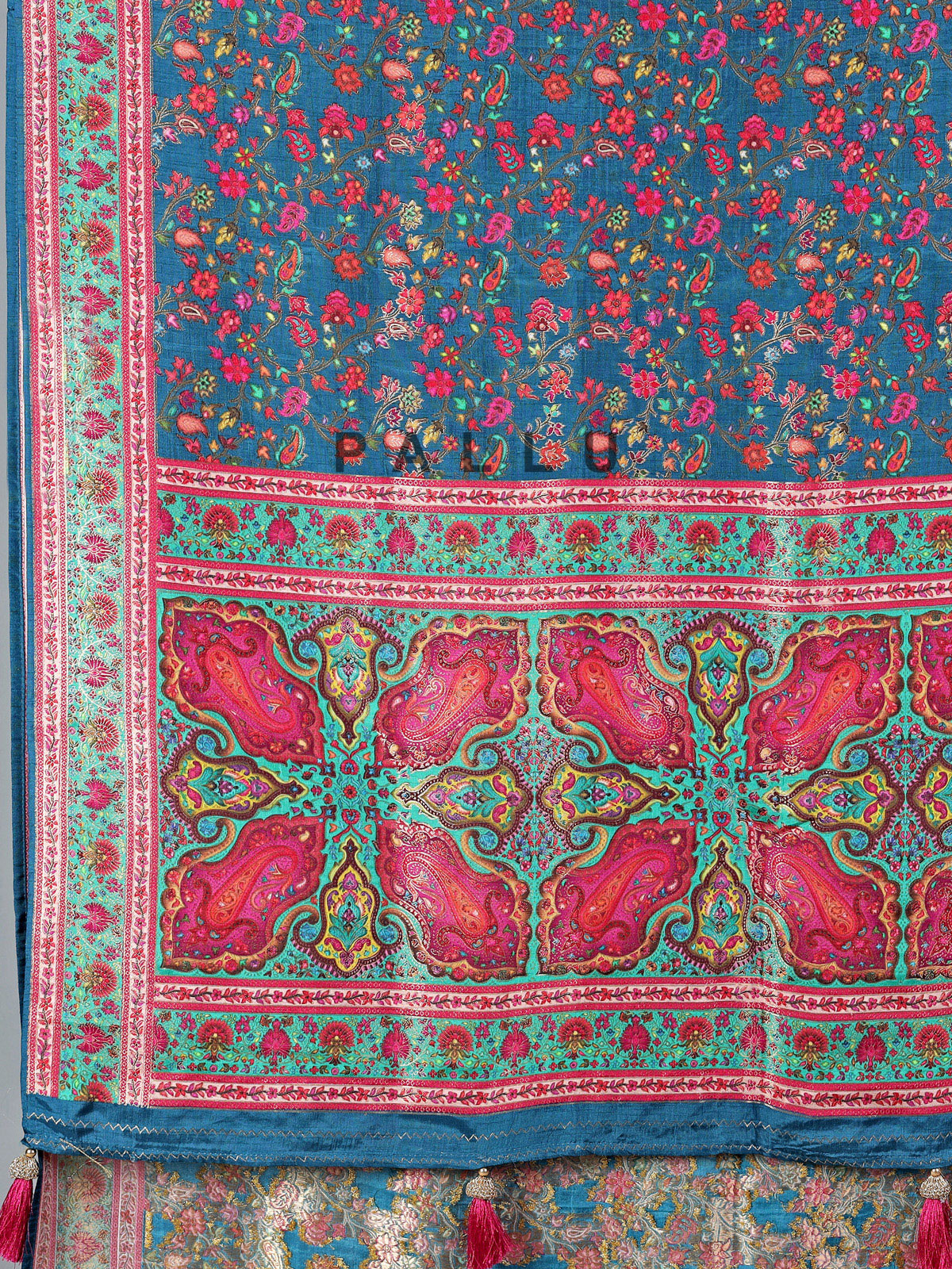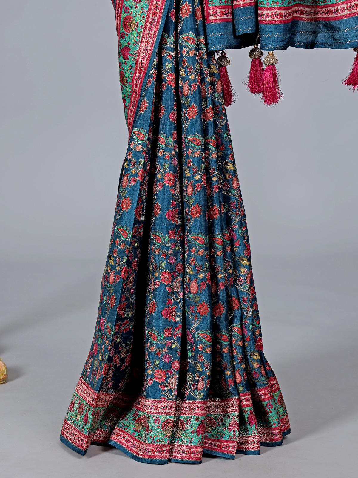 Elegant rama blue tones bring refined sophistication to this semi pashmina silk saree crafted for festive wear. Highlighted with zari and colorful motif weaving, it blends classic charm with vibrant appeal. Ideal for weddings, sangeet, and celebrations, it is paired with an unstitched contrast blouse for a polished finish.