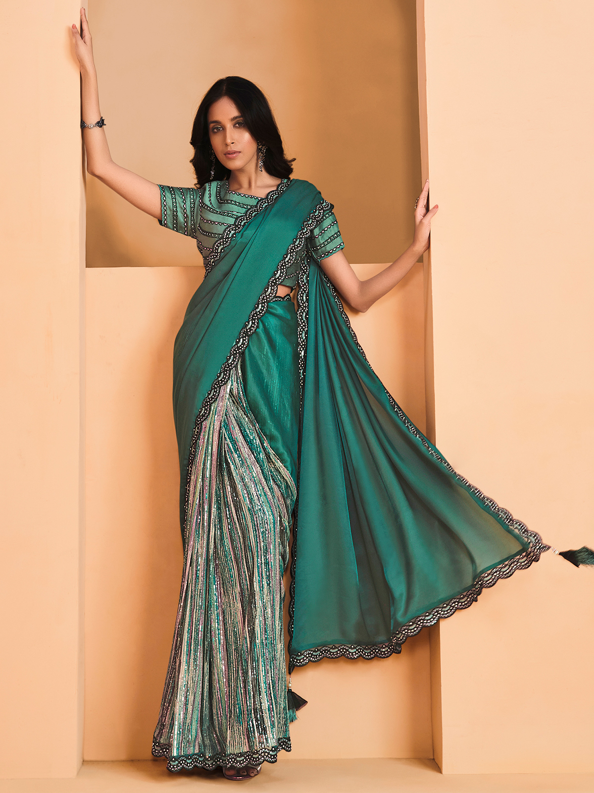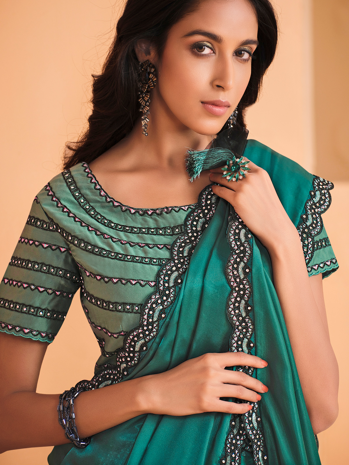 This rama green satin crepe silk saree showcases dazzling digital sequins, Swarovski accents, and detailed stone craftsmanship. Designed for modern women, it comes with an unstitched blouse piece for custom styling. Soft, breathable fabric with graceful shine makes it ideal for partywear, sangeet, and mehendi functions.