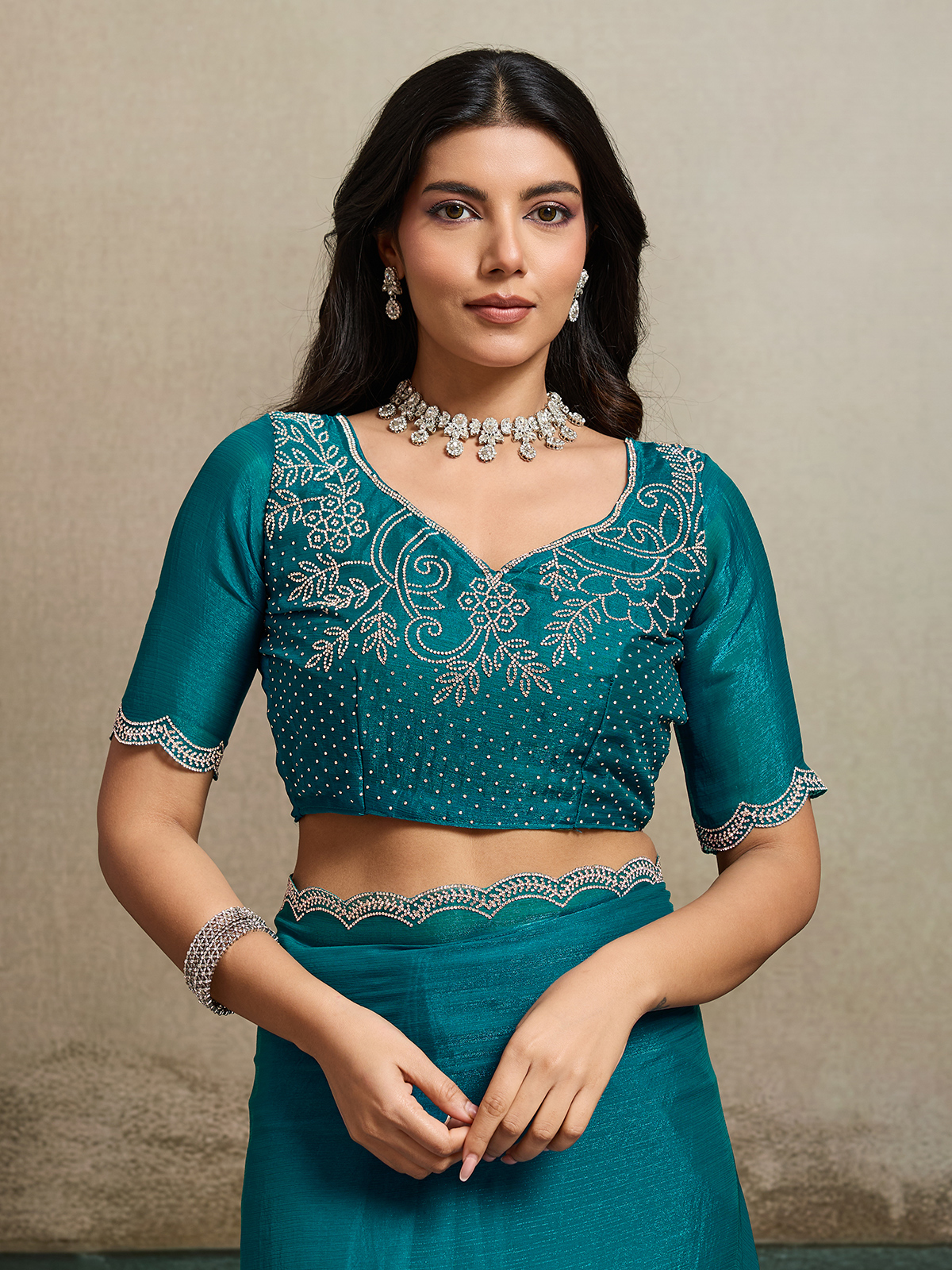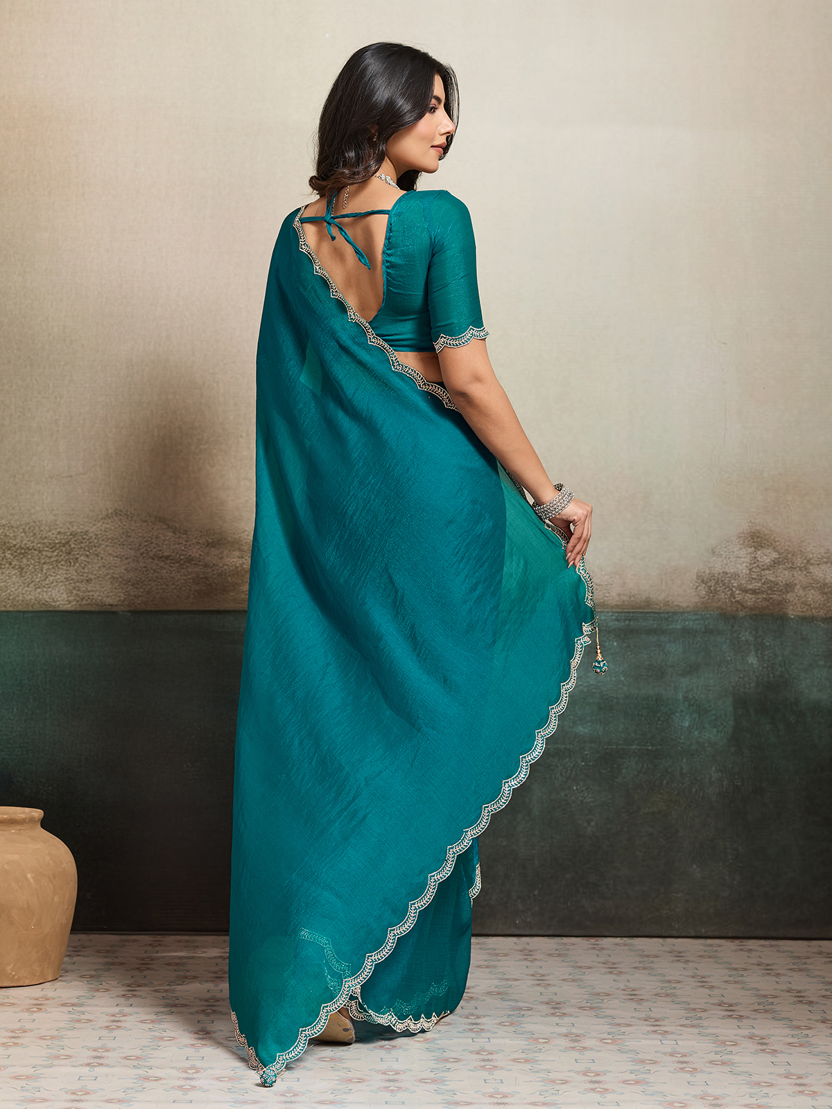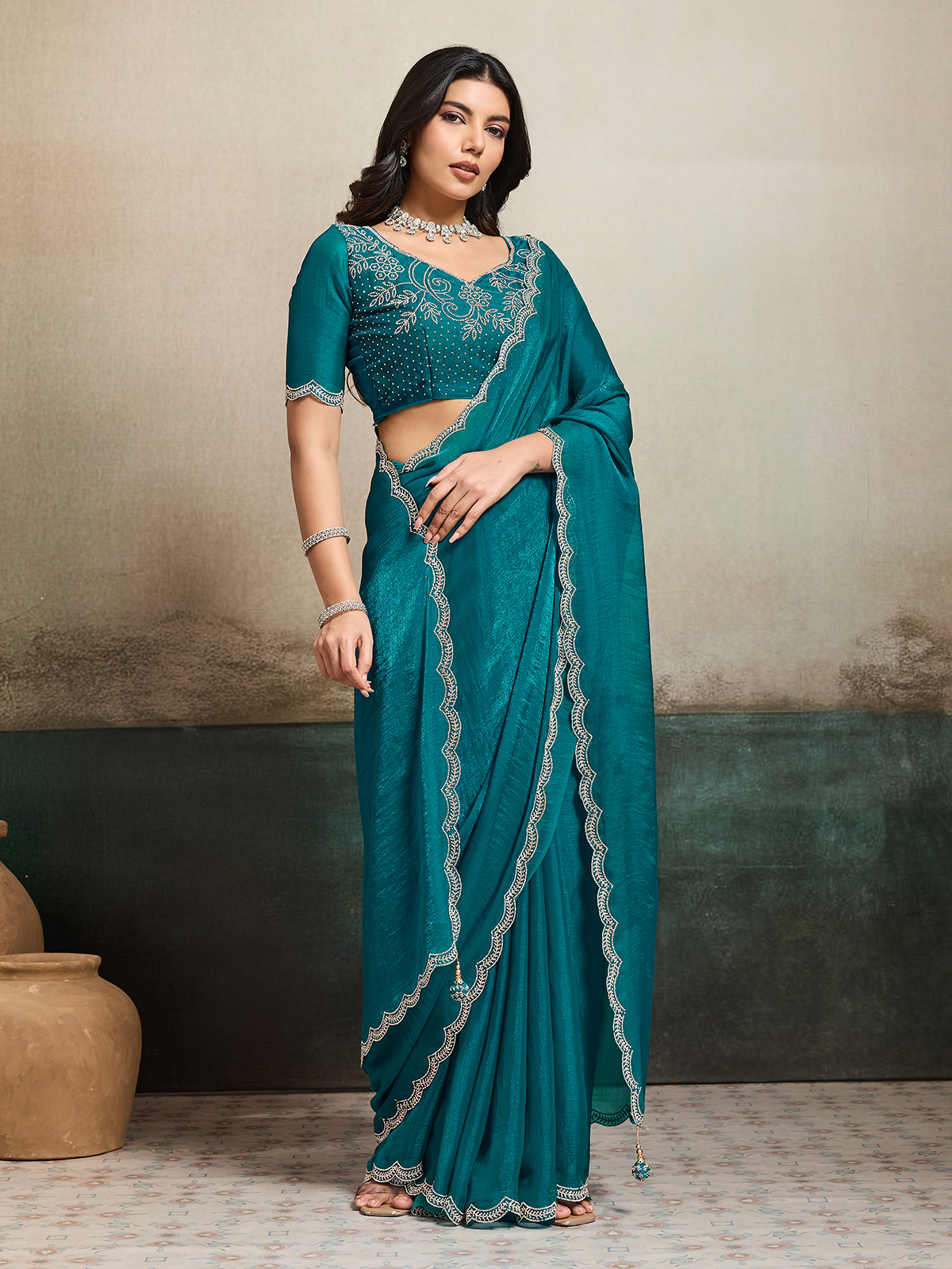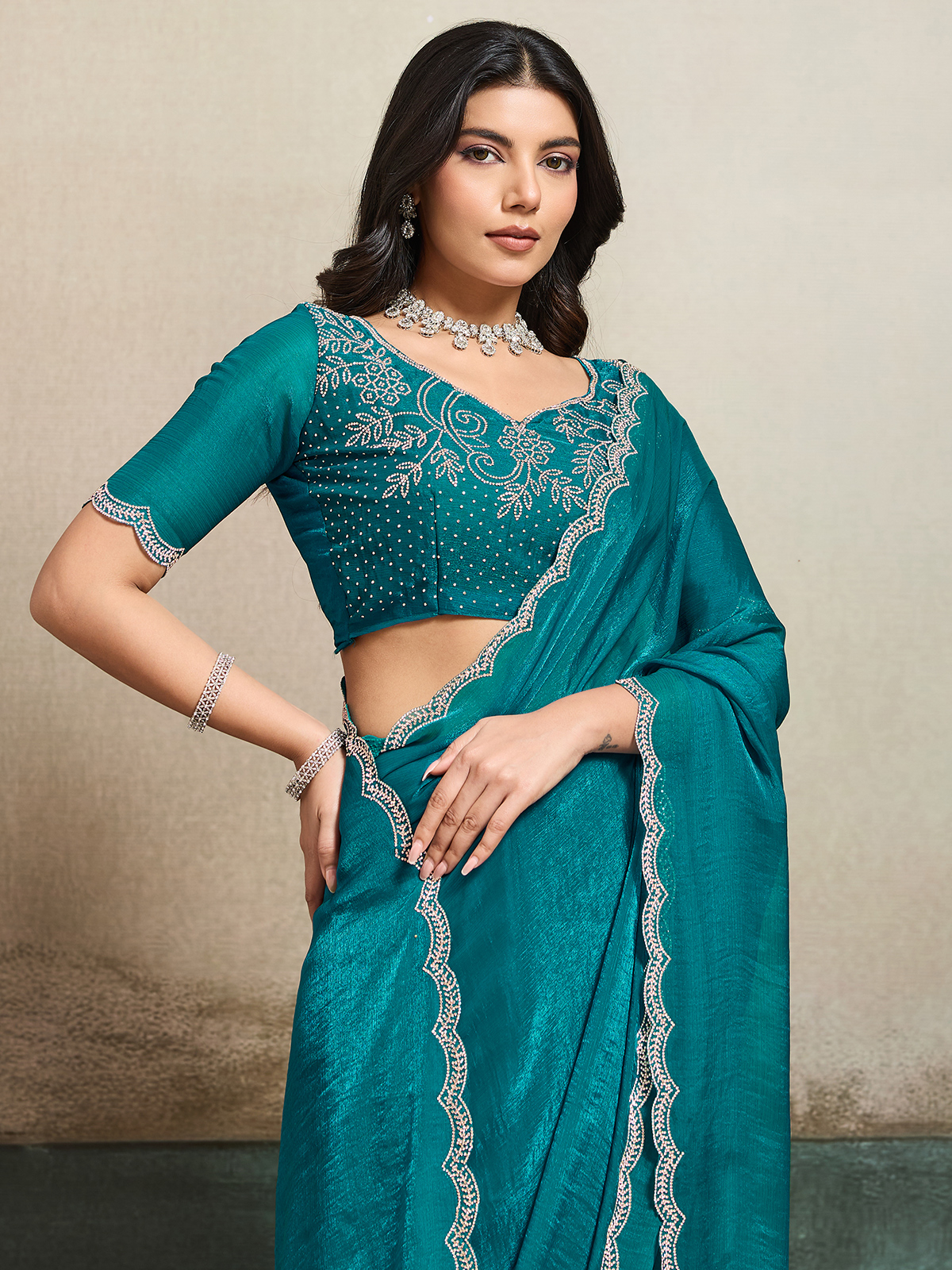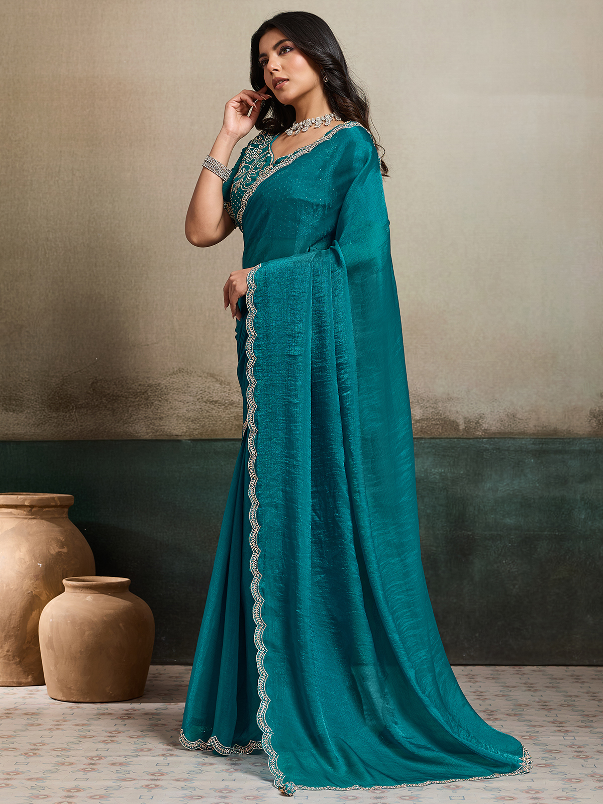 Glow with sophisticated charm in this rama green Fandy chiffon saree, offering lightweight elegance and graceful movement. The border and blouse are enhanced with delicate stone detailing that adds luminous sparkle. Ideal for festivals, parties, and wedding occasions, it is paired with a coordinated unstitched blouse piece.