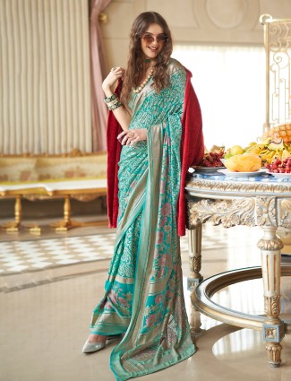 Graceful and lightweight, this rama green georgette saree features an all-over shimmer print that glows with festive charm. It comes with an unstitched blouse piece, giving you full freedom to customize the look.