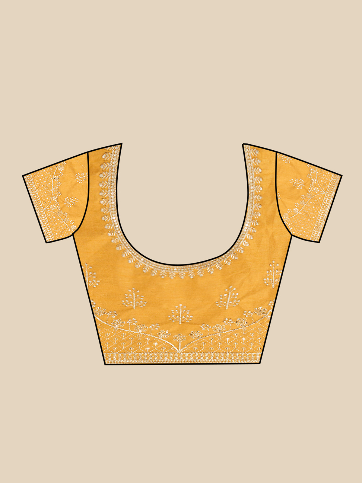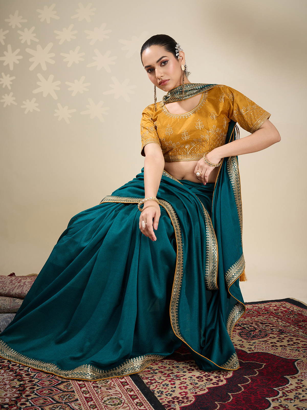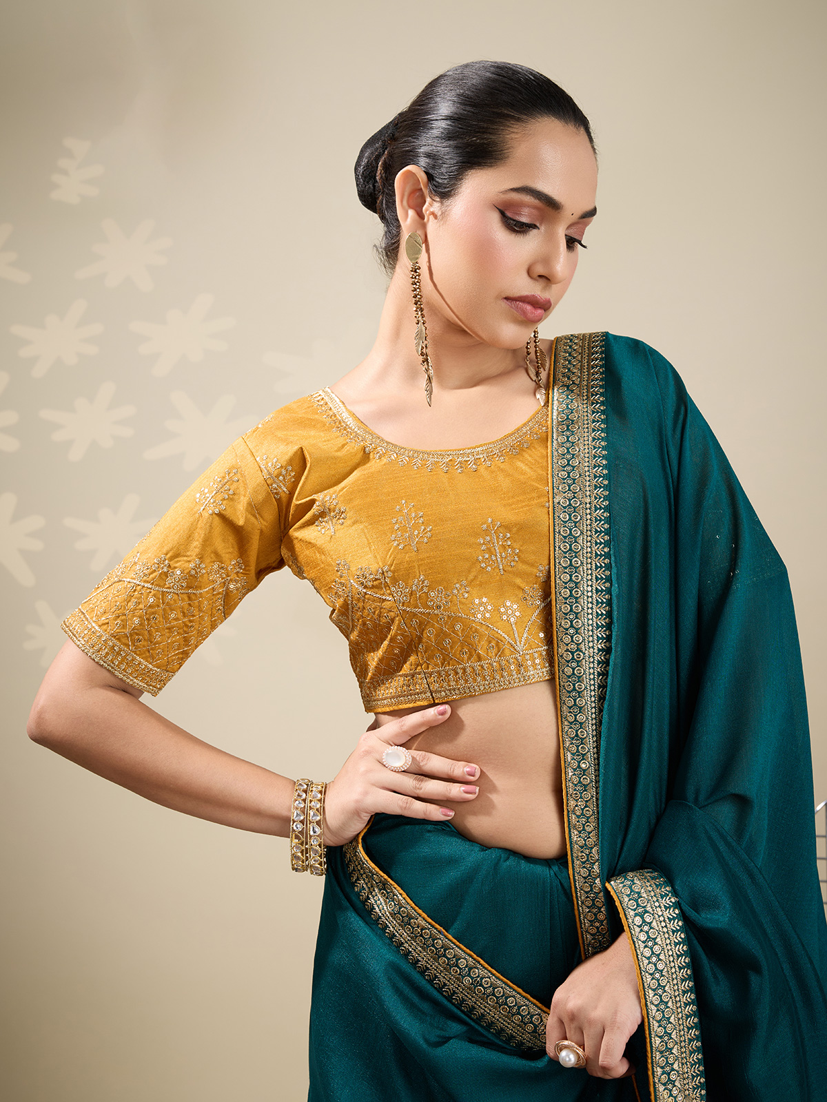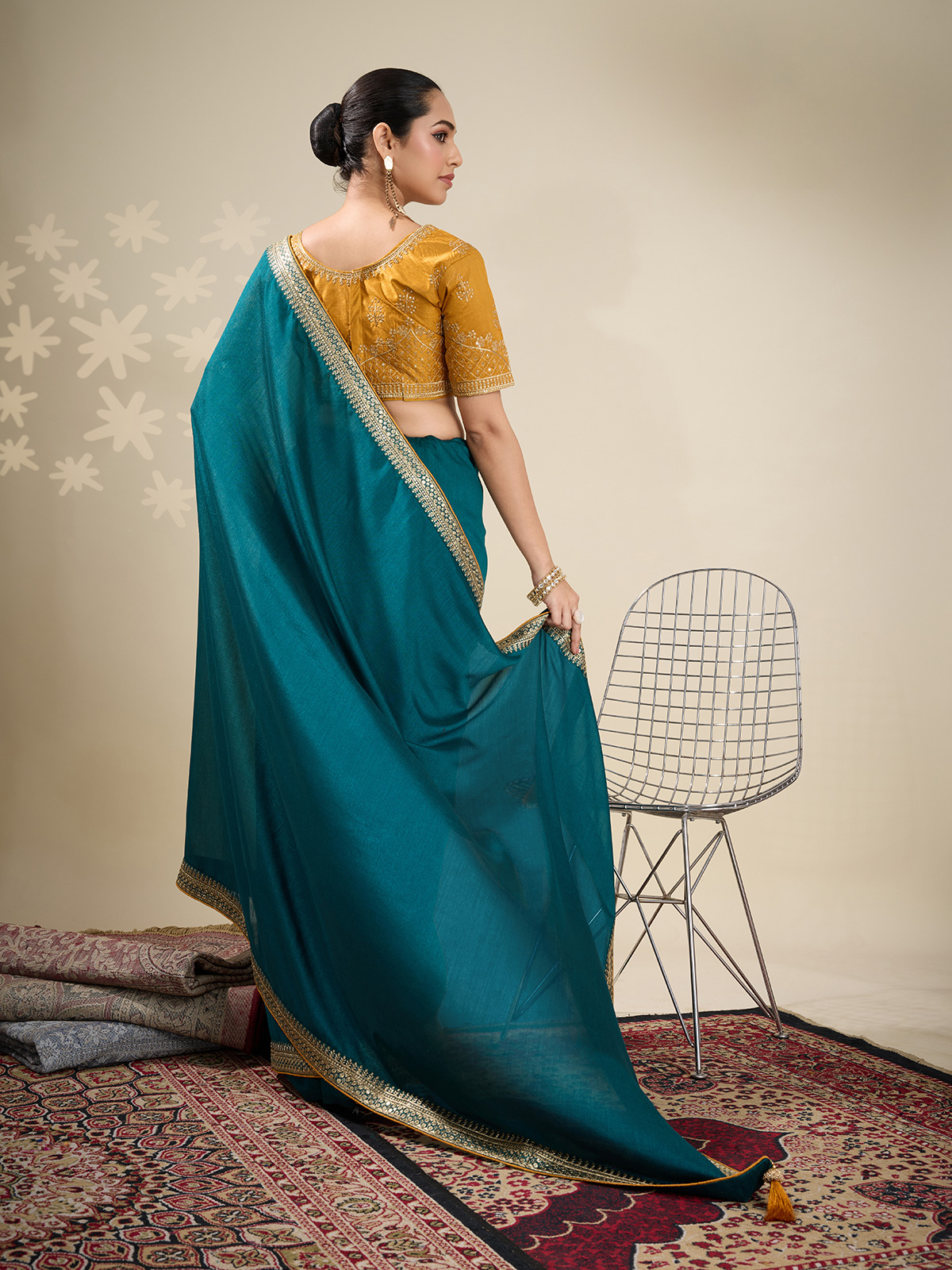 Crafted from vibrant silk, this saree shines with serene elegance and festive brilliance. Its border glimmers with resham and sequins, evoking delicate dewdrops at dawn. Completed with an unstitched contrast blouse piece, this ensemble blends traditional charm with modern allure, ideal for festivals and joyous gatherings.