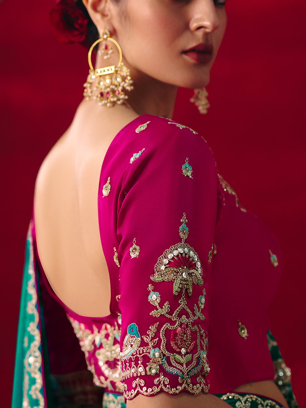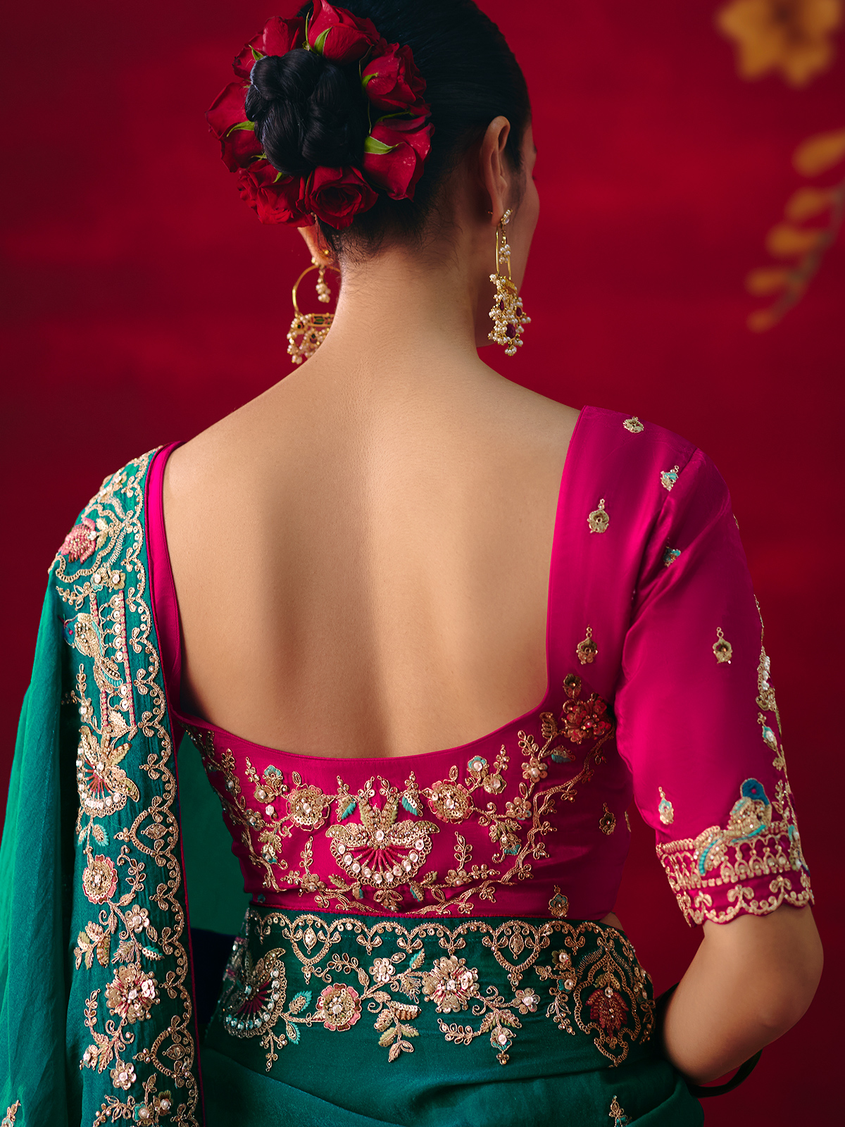 Elegantly crafted in rama green tissue organza, this saree features detailed embroidery enriched with sequins, pearls, stone and resham work. Paired with a contrast unstitched blouse piece, it brings refined sophistication to weddings, festive celebrations and reception occasions.