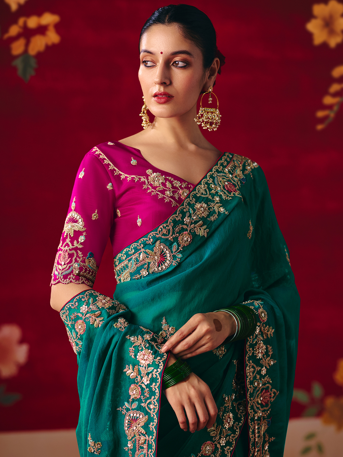 Rama Green Tissue Organza Embroidered Wedding Saree