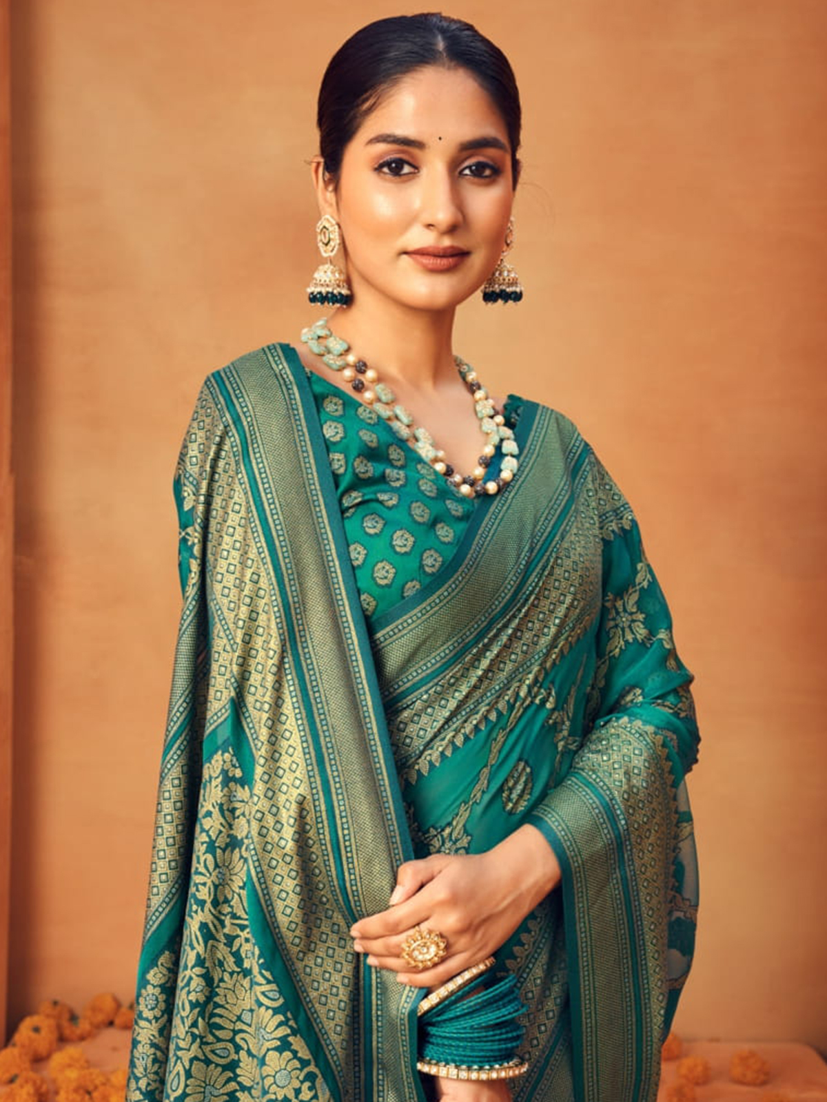 Drape yourself in timeless grace with this rama green saree in lightweight georgette, adorned with bold zari accents. Ideal for festive occasions, it comes with an unstitched blouse piece for a tailored touch.