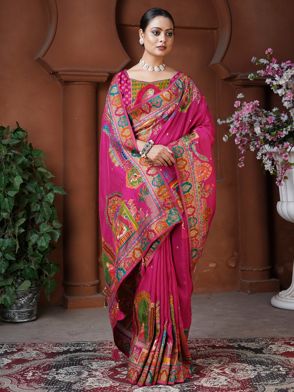 Drape this rani-colored dola silk saree to dazzle the audience. Adorned with resam weaving and zari. Comes with an unstitched blouse piece.