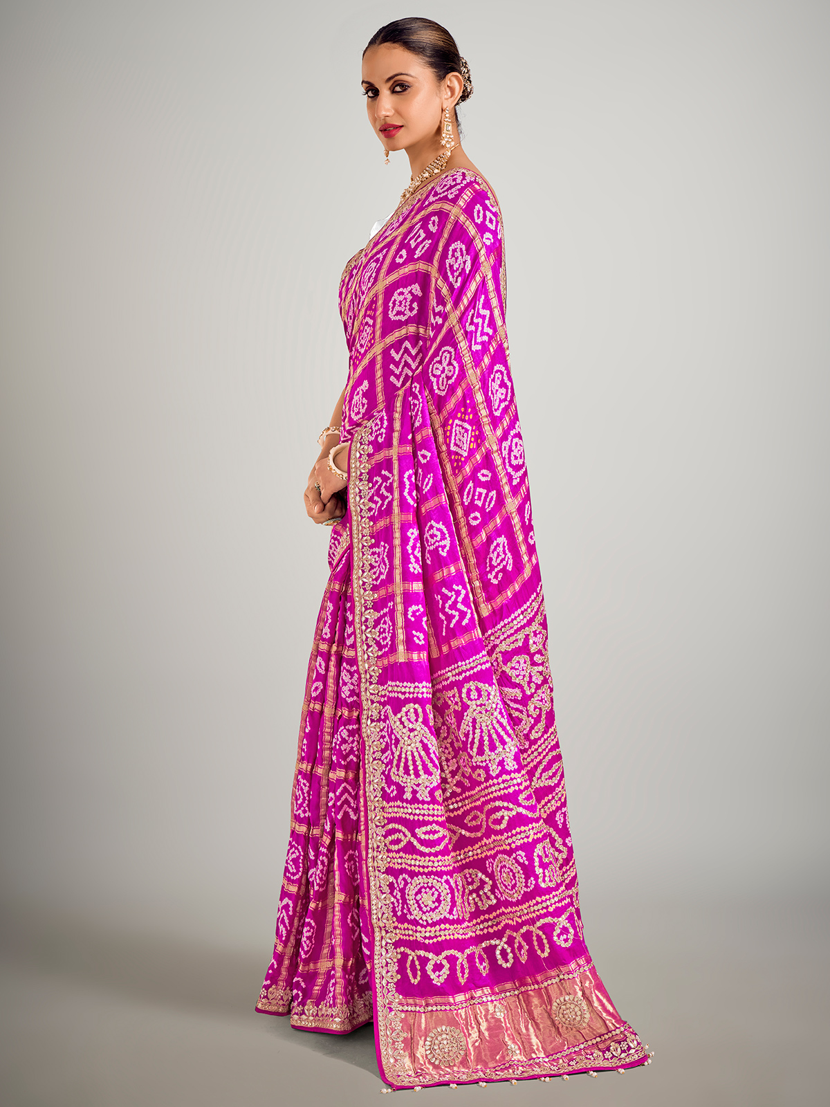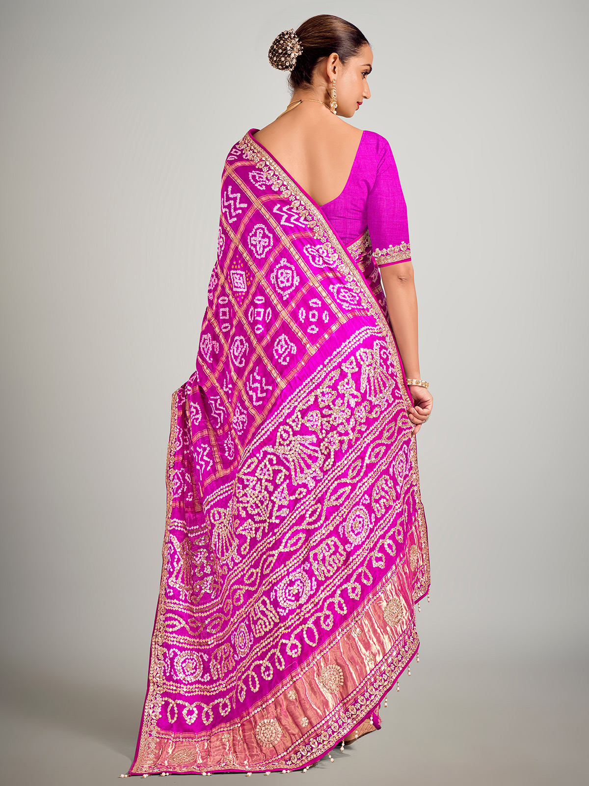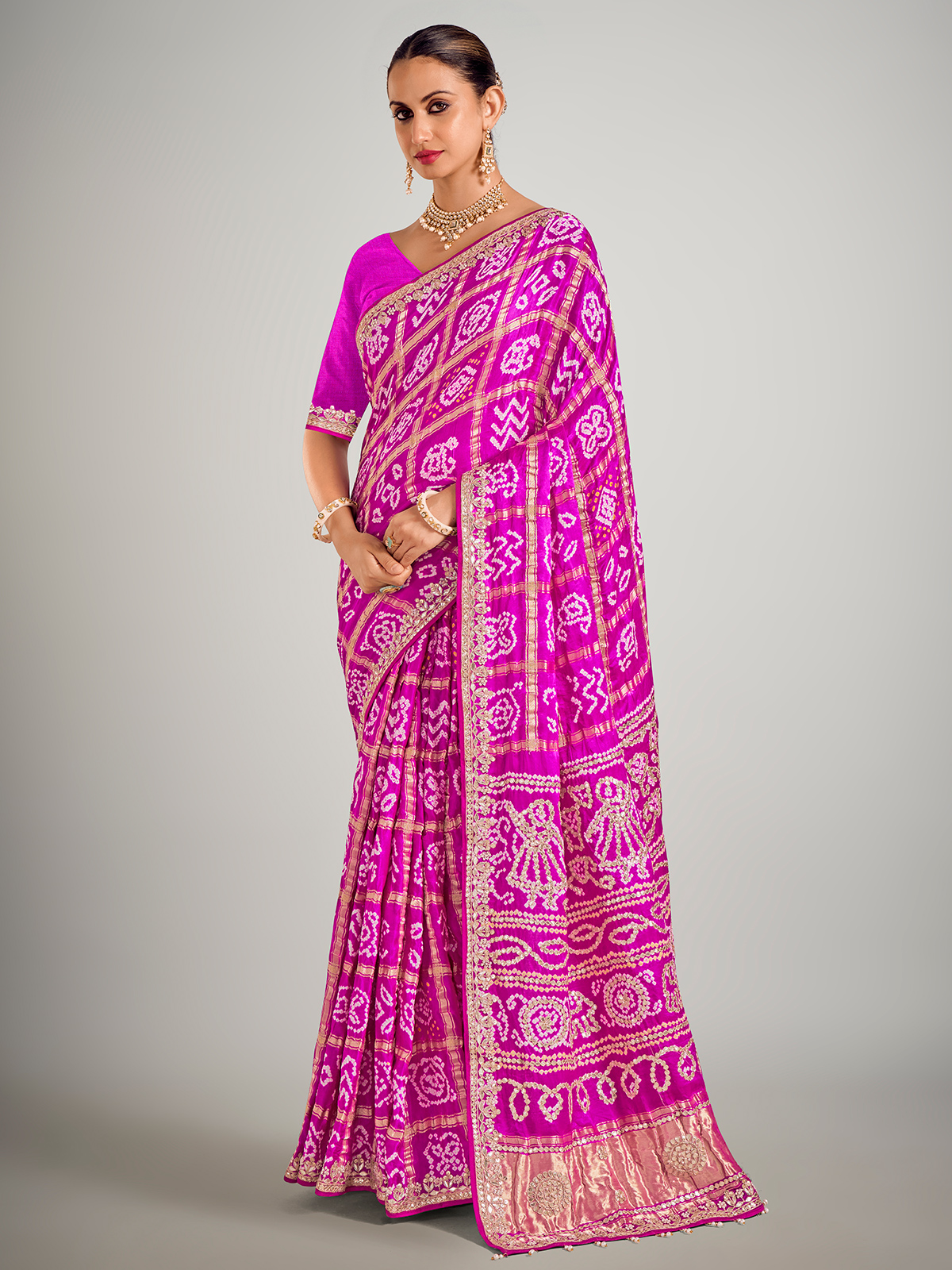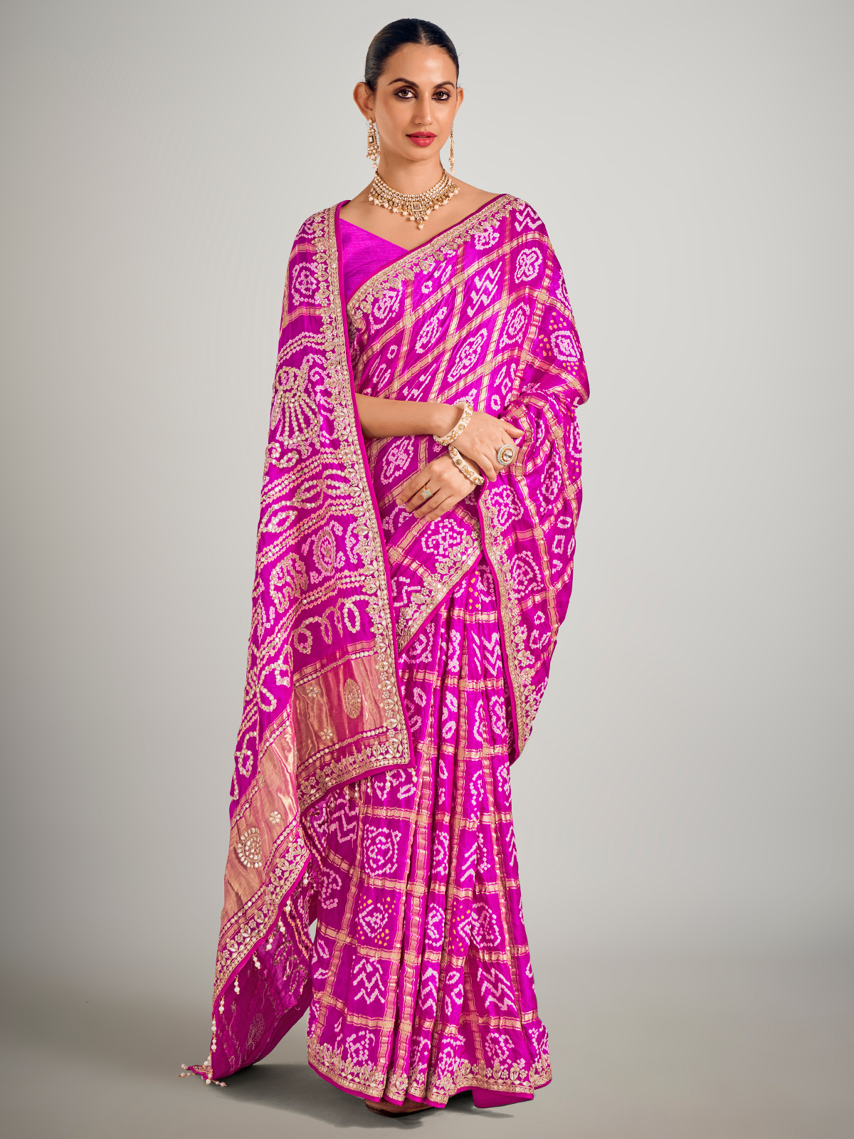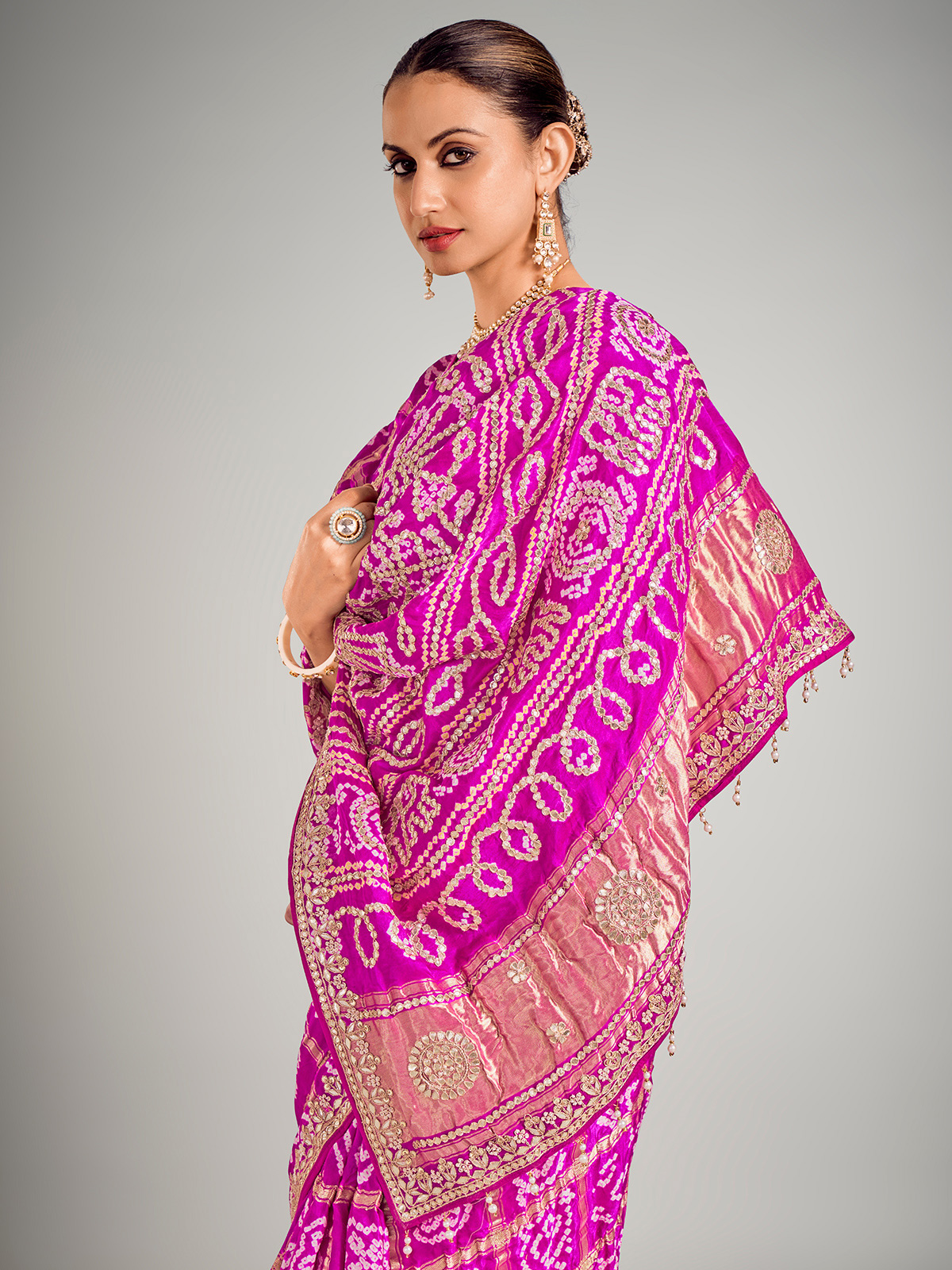 A gorgeous zardosi, gota, beads, sequins, resham, and zari work adorn this traditional Indian rani-colored gajji bridal silk saree, adding to its beauty. Comes with an unstitched blouse.