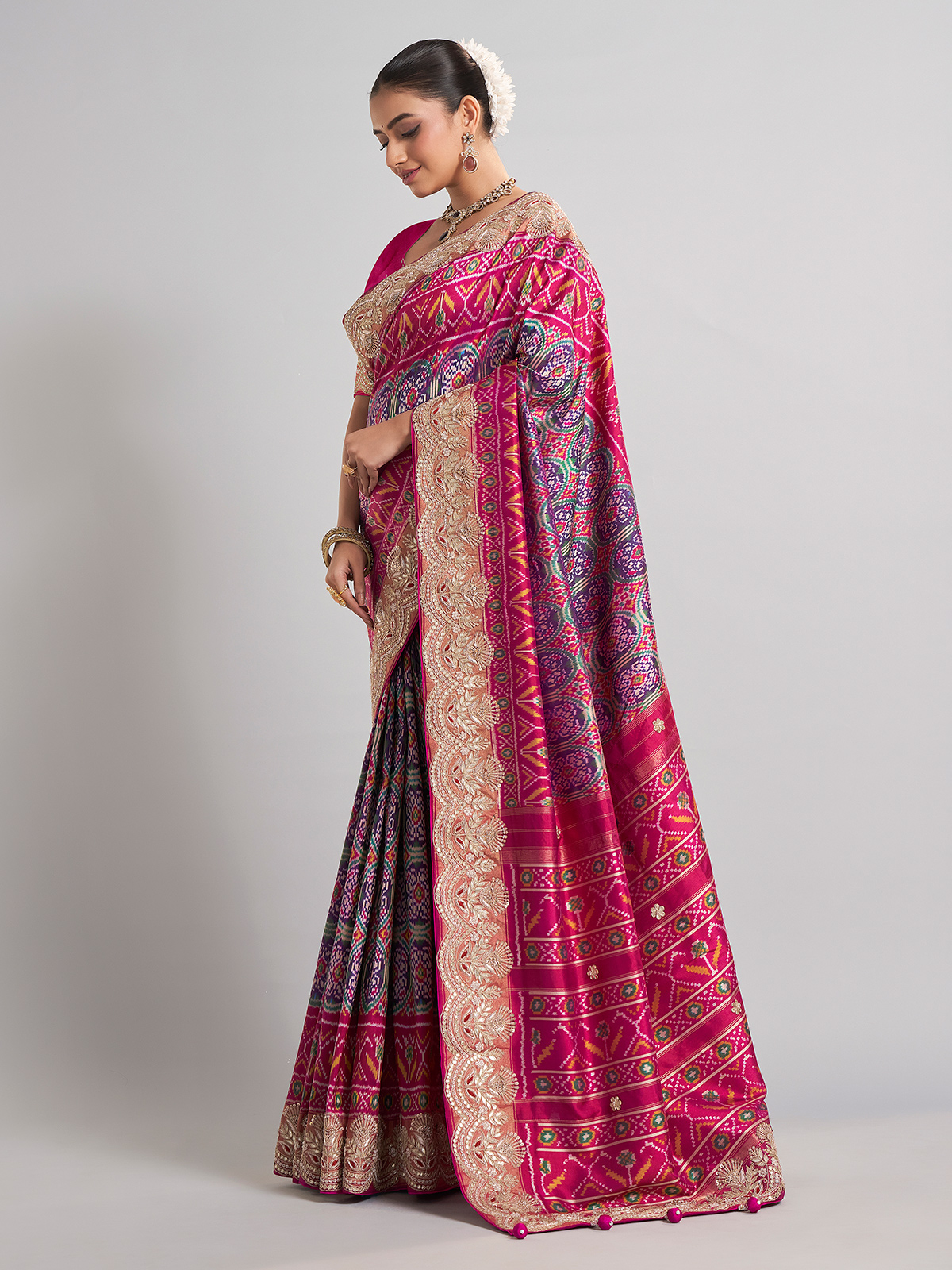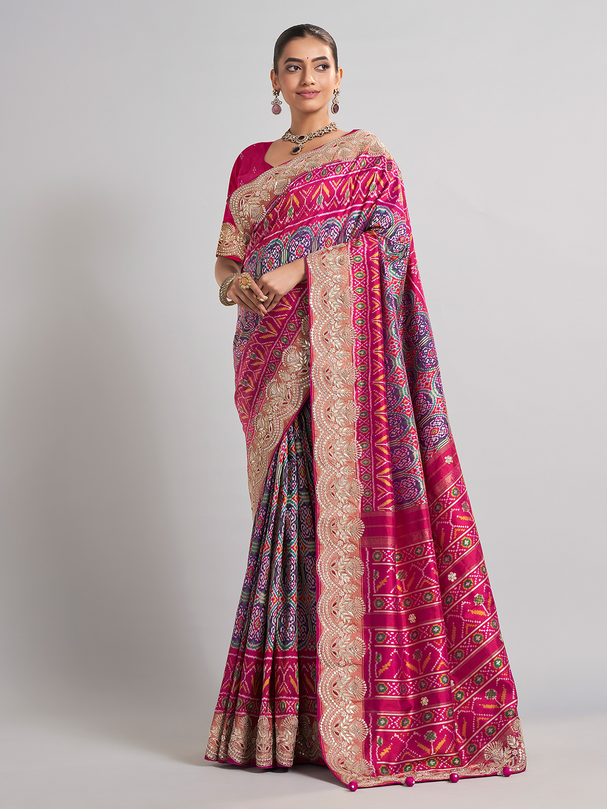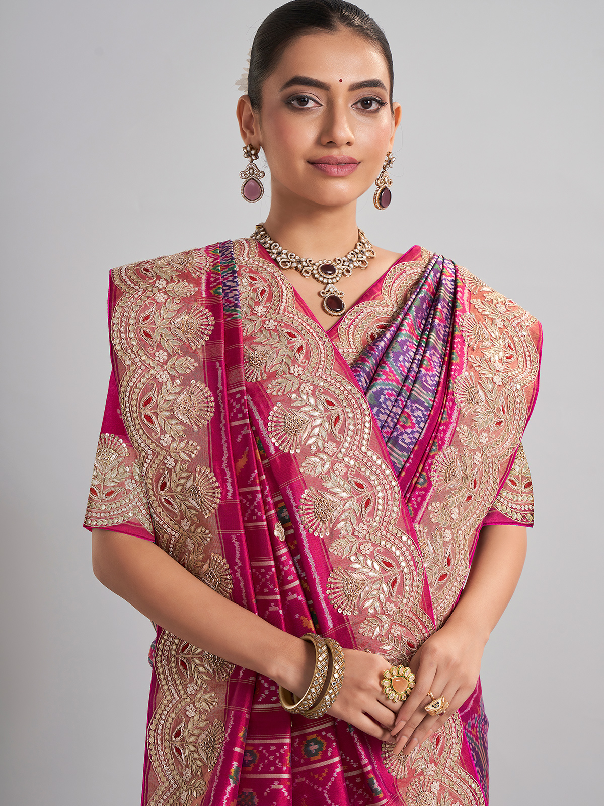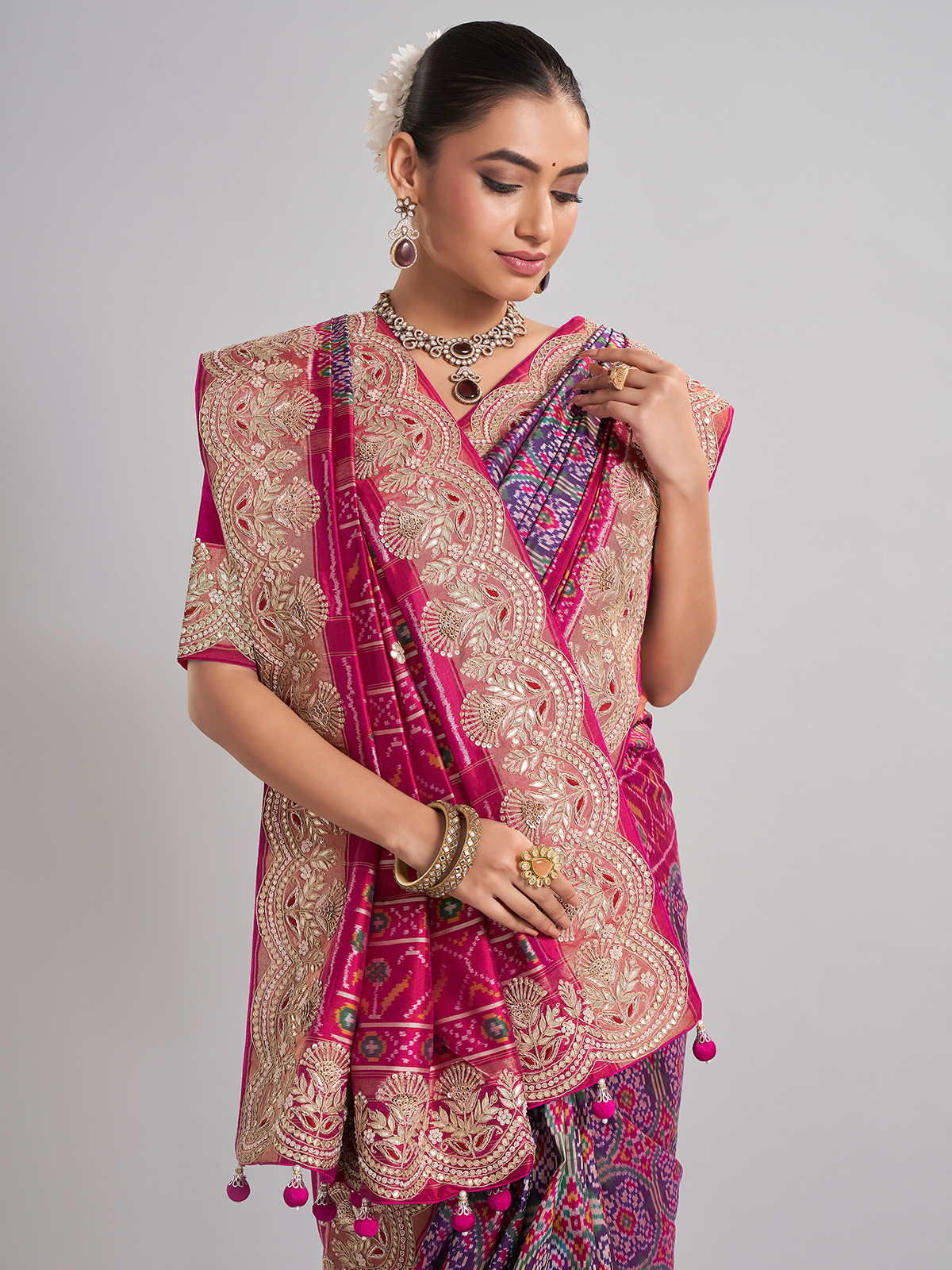 A vibrant tribute to tradition, this rani pink and purple patola silk saree is enriched with zardosi, beads, sequins, gota, pearls, and thread work. The printed base and unstitched blouse piece allow for regal customization.
