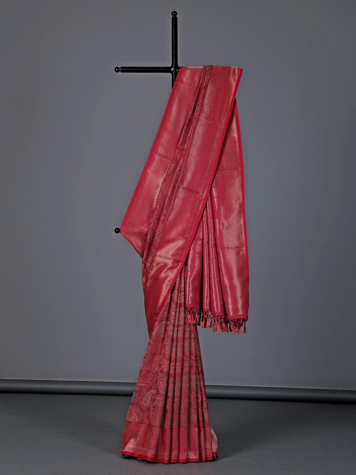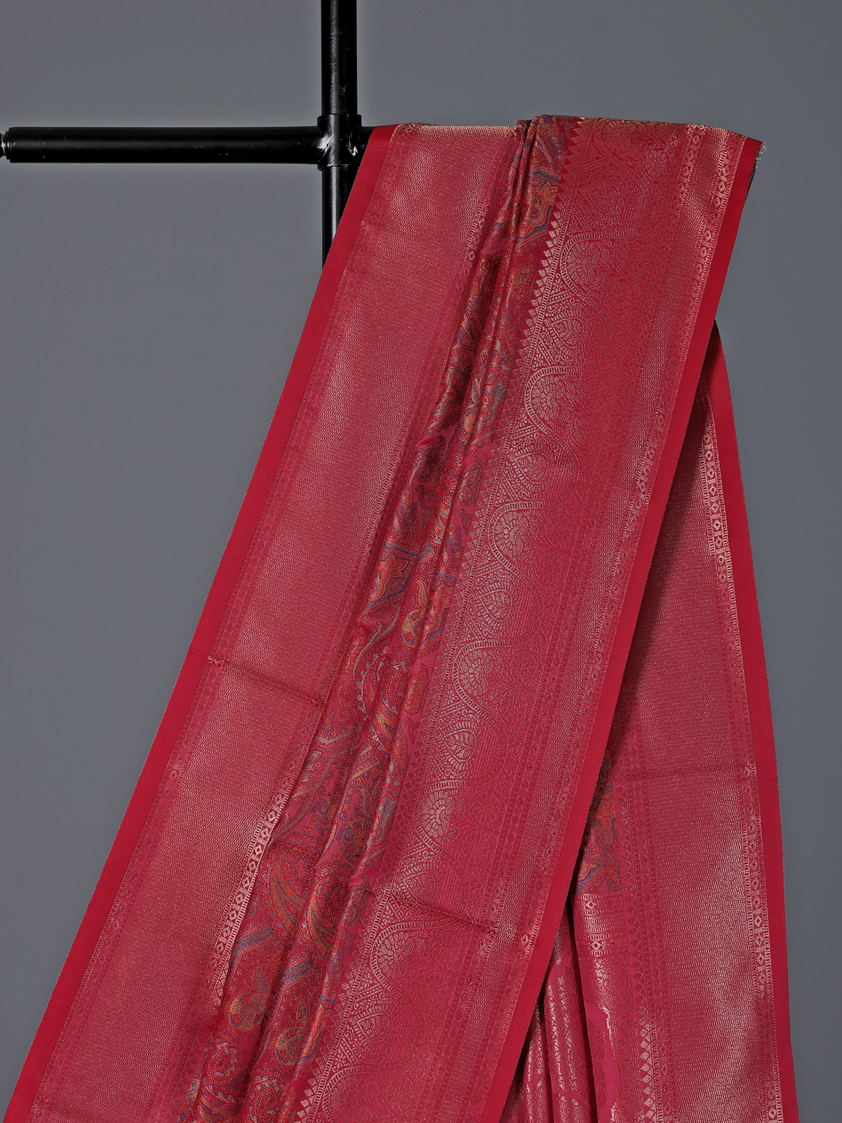 Vibrant and graceful, this rani pink art pashmina silk saree is enhanced with colorful zari motifs that add festive beauty. The soft texture drapes effortlessly, creating a refined silhouette. Ideal for weddings, receptions and celebrations, it includes an unstitched blouse piece for a customized and elegant finish.