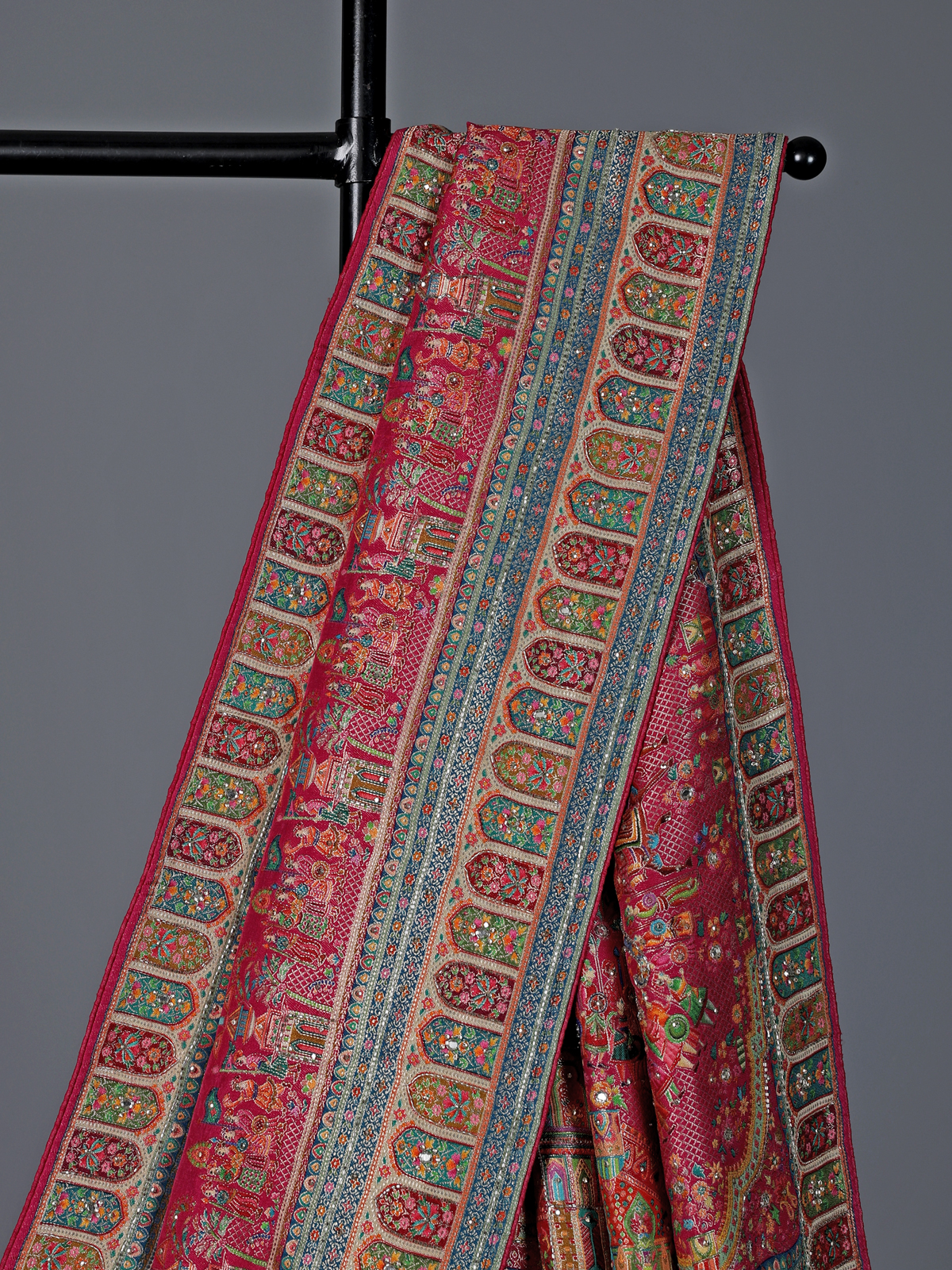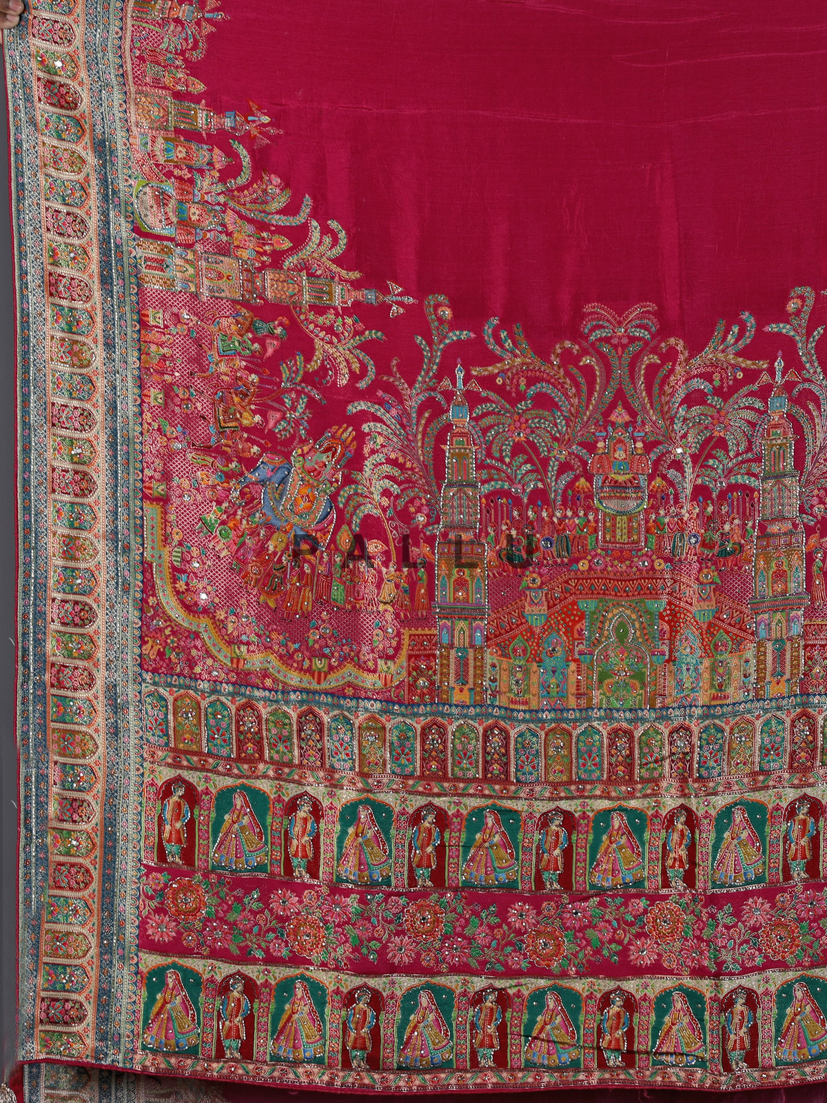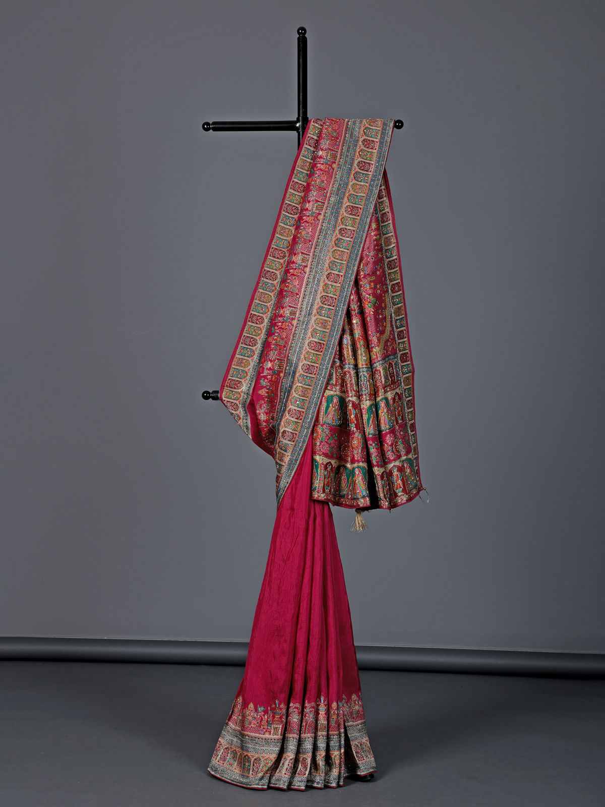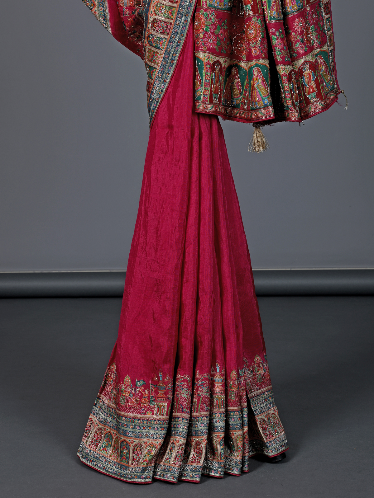 Bright and celebratory rani pink art silk saree features playful colorful motifs enriched with cutdana, mirror and diamond embellishments. It brings a lively festive glow, perfect for weddings and sangeet. Comes with an unstitched blouse piece for a customized stylish look.