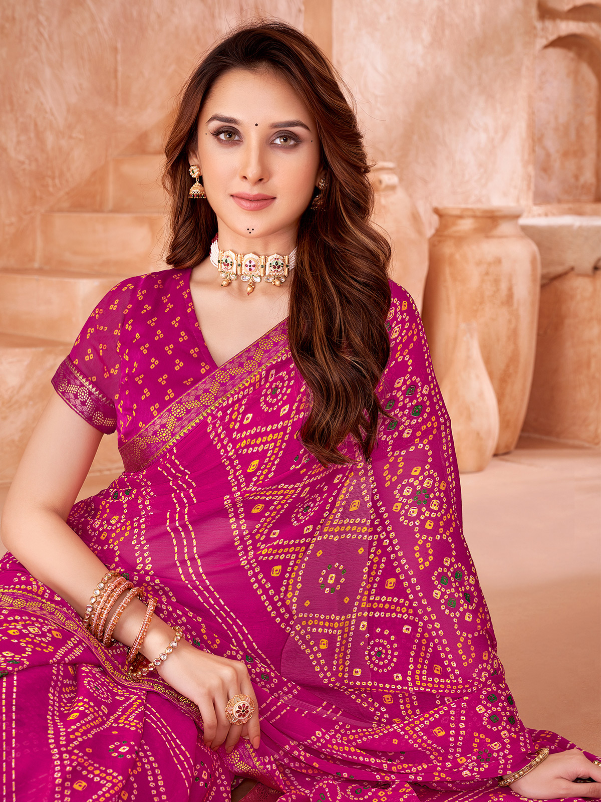 Chic and sophisticated, this rani pink chiffon saree is elevated with intricate bandhani print and a delicate lace border. Perfect for evening celebrations and wedding festivities. Comes with an unstitched blouse piece.