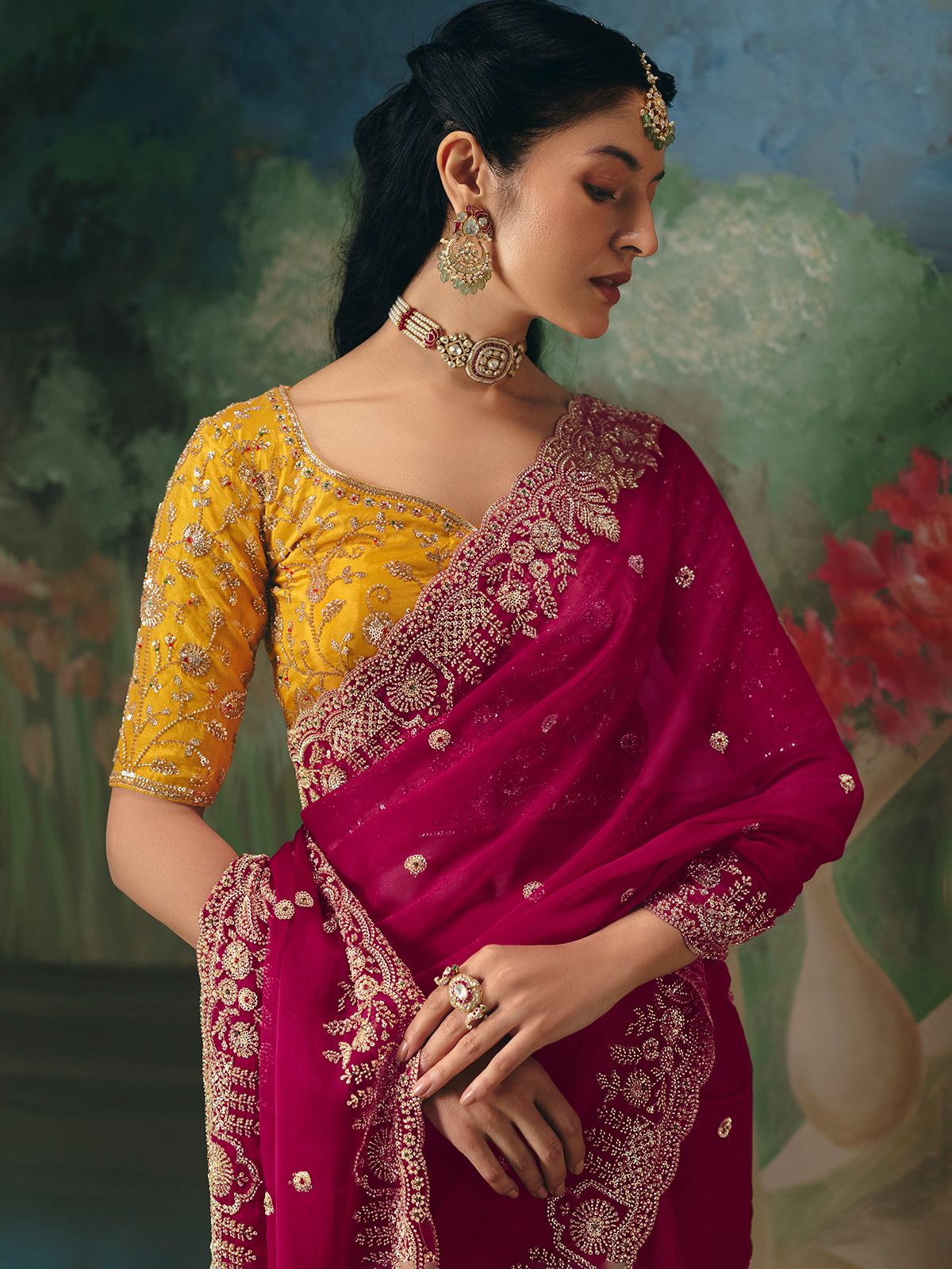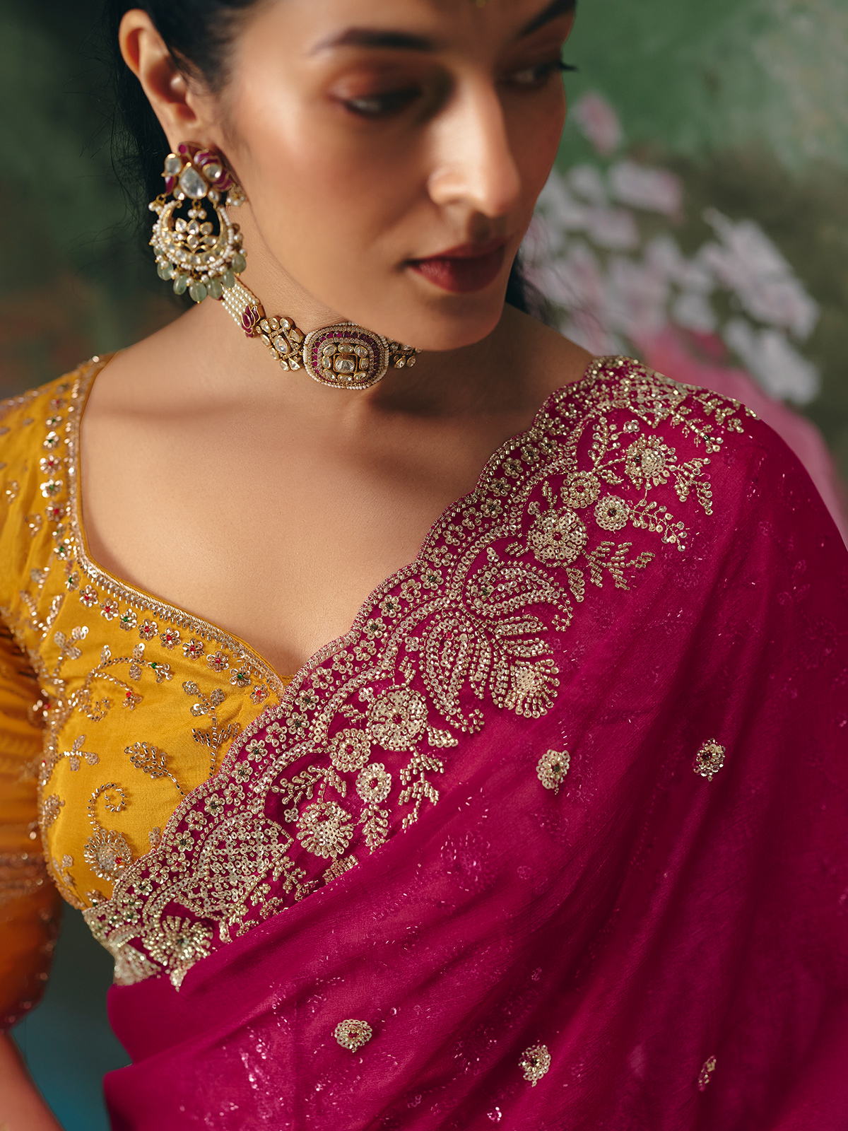 This vibrant rani pink chinon silk saree. Enhanced with cutdana, beads and sequins work. The graceful drape and rich blouse detailing make it perfect for weddings, receptions, sangeet and festive celebrations. Comes with a heavy work contrast unstitched blouse