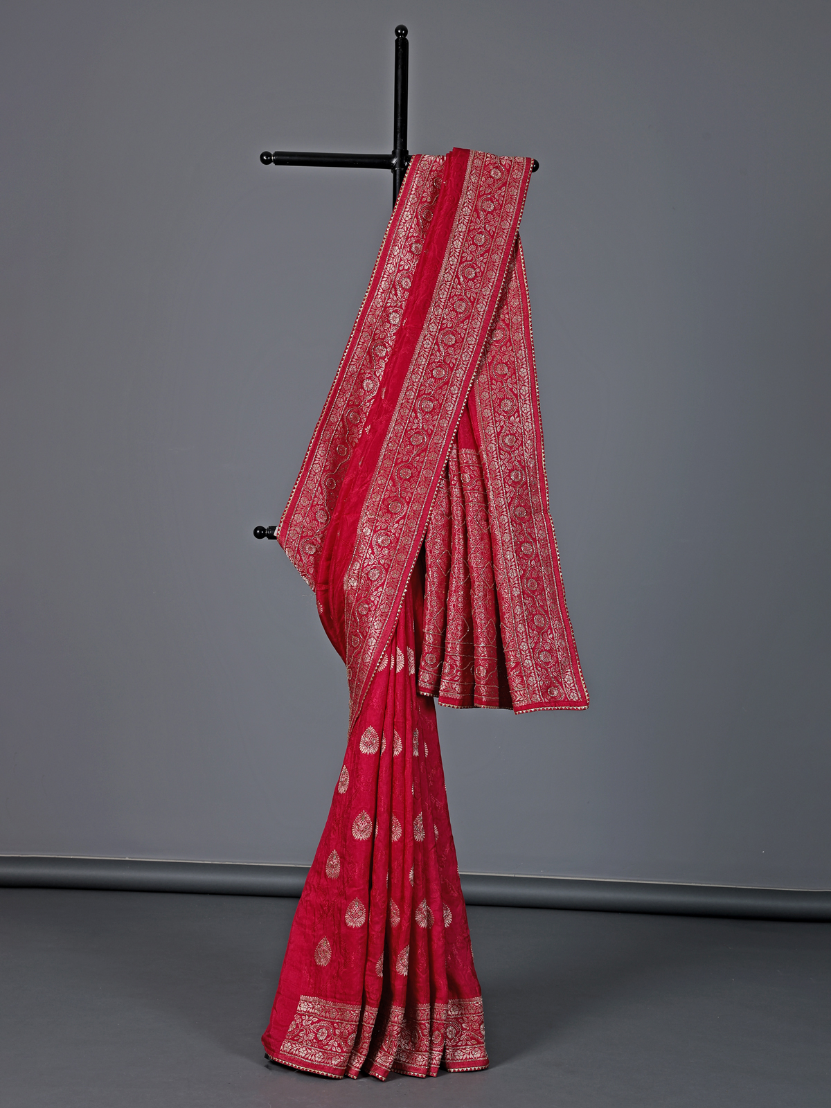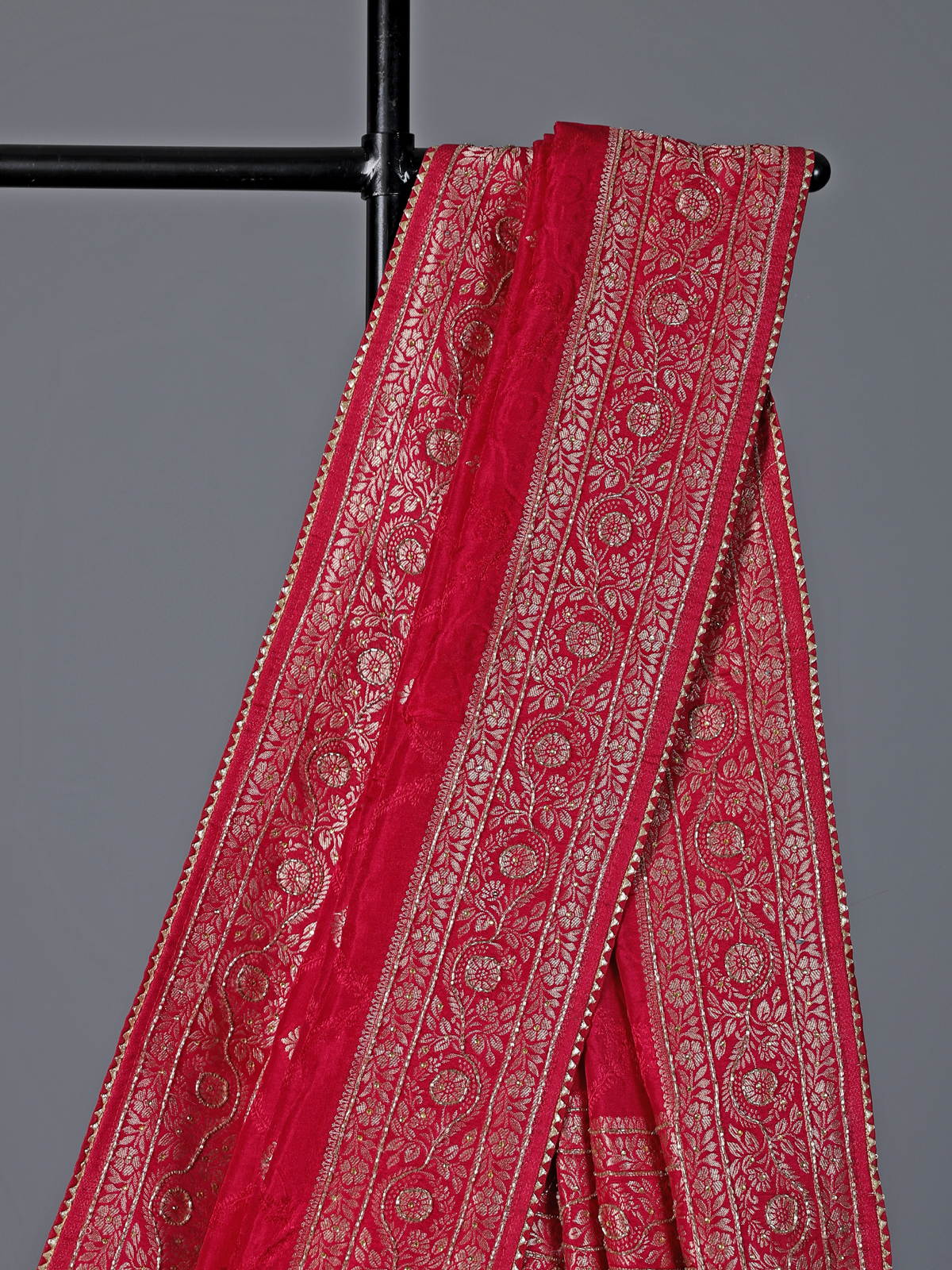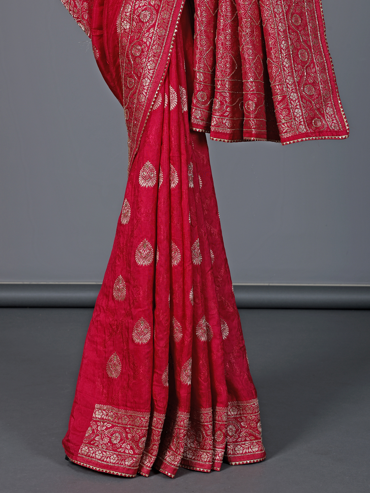 Elegant and expressive, this rani pink dola silk saree is crafted for memorable occasions. Adorned with intricate cutdana, stone, zari and gota work, it showcases fine artistry. The fluid drape adds softness and grace to every movement. Ideal for weddings and festive gatherings, it comes with an unstitched blouse piece for versatile styling.
