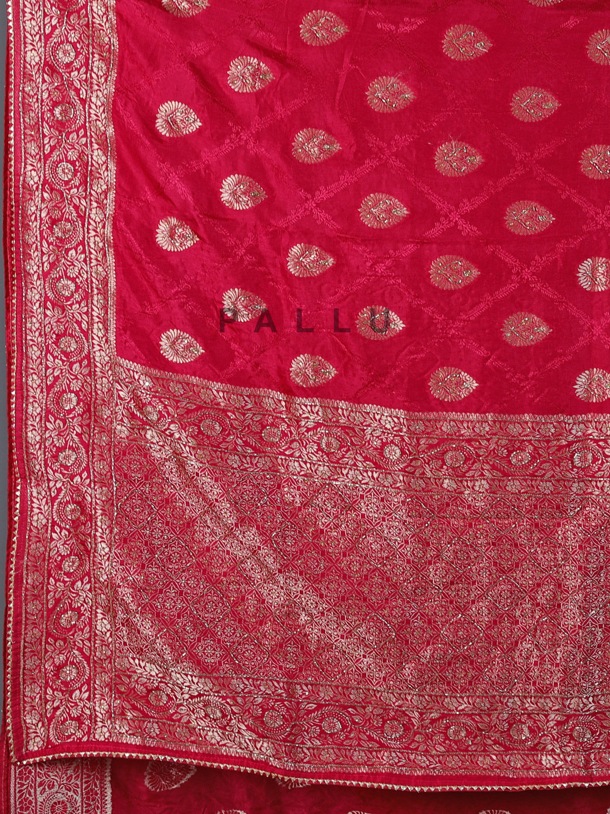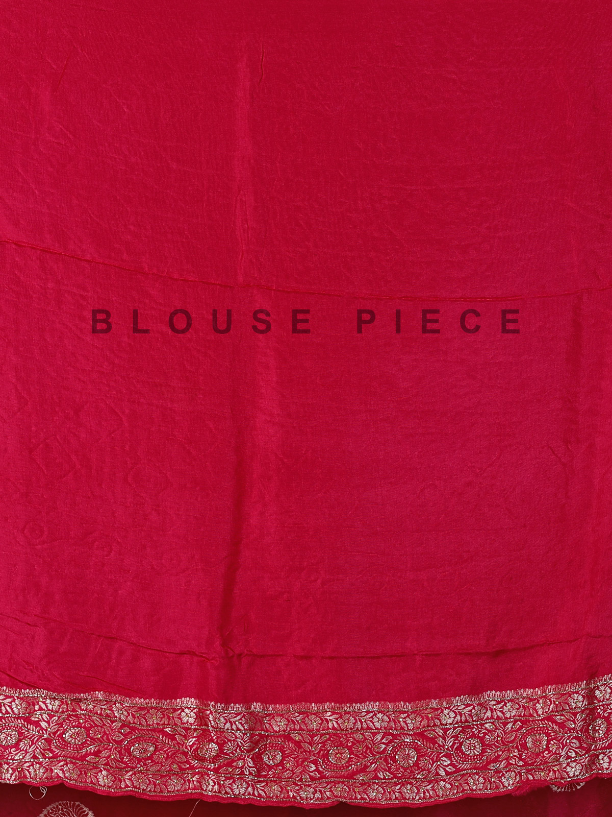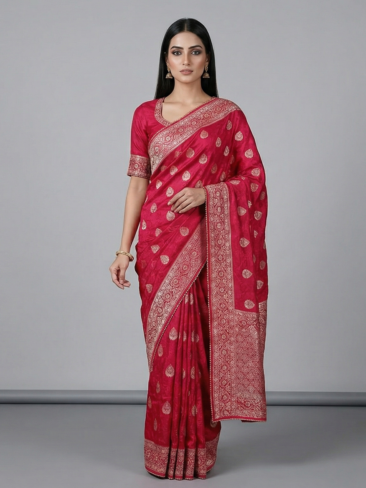 Elegant and expressive, this rani pink dola silk saree is crafted for memorable occasions. Adorned with intricate cutdana, stone, zari and gota work, it showcases fine artistry. The fluid drape adds softness and grace to every movement. Ideal for weddings and festive gatherings, it comes with an unstitched blouse piece for versatile styling.