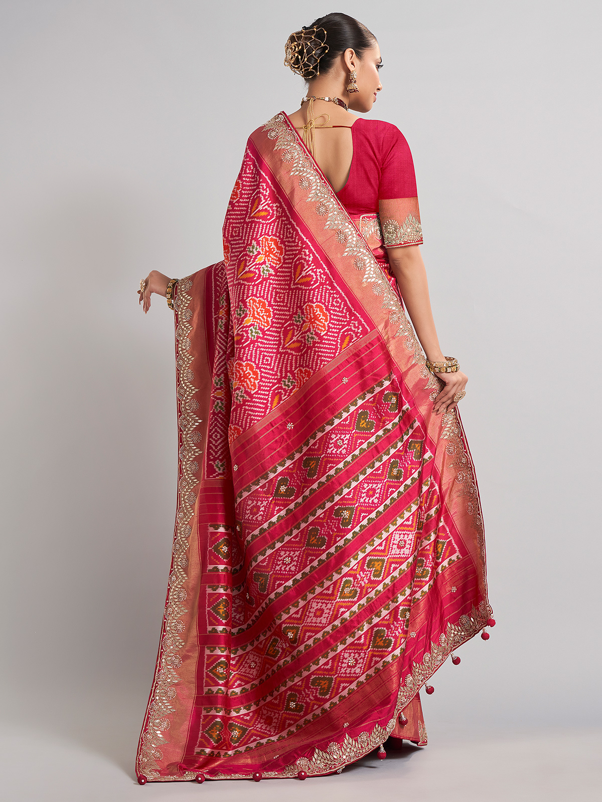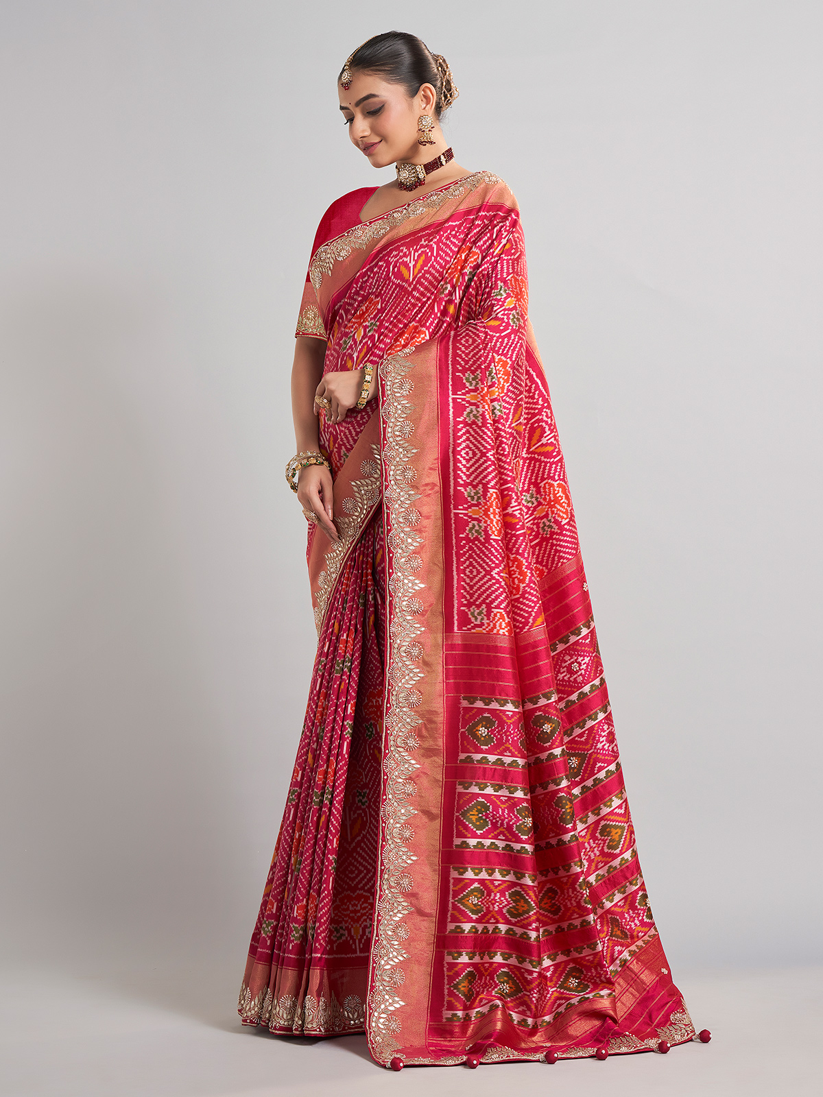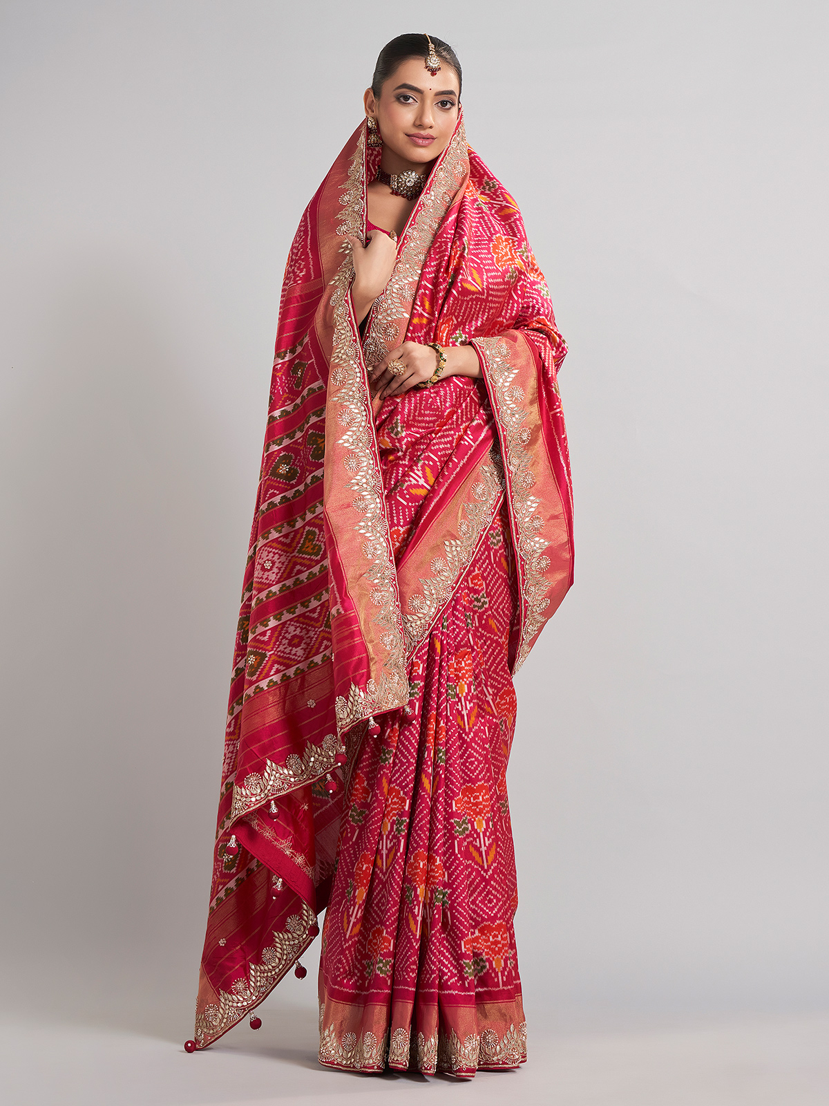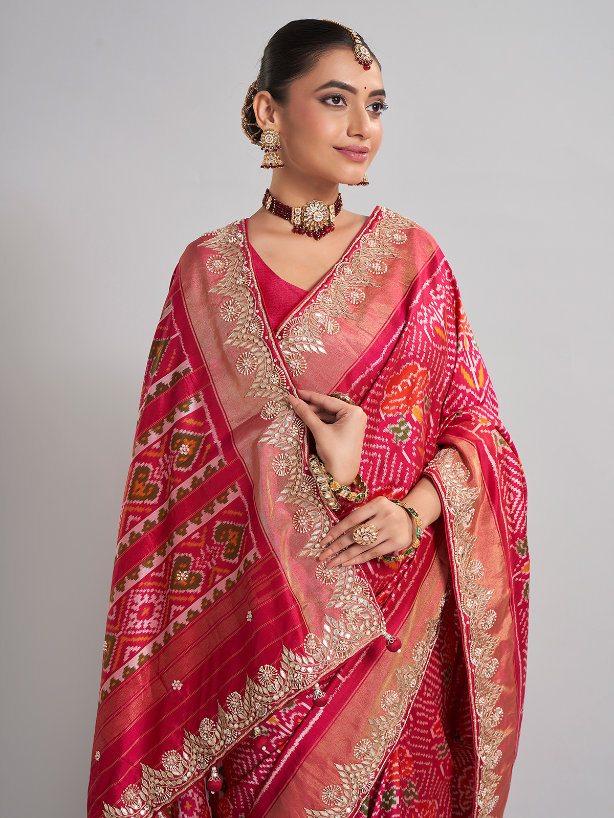 This rani pink patola silk saree shines with intricate zardosi, beads, sequins, and cutdana embellishments. A graceful choice for bridal wear, complete with an unstitched blouse piece.